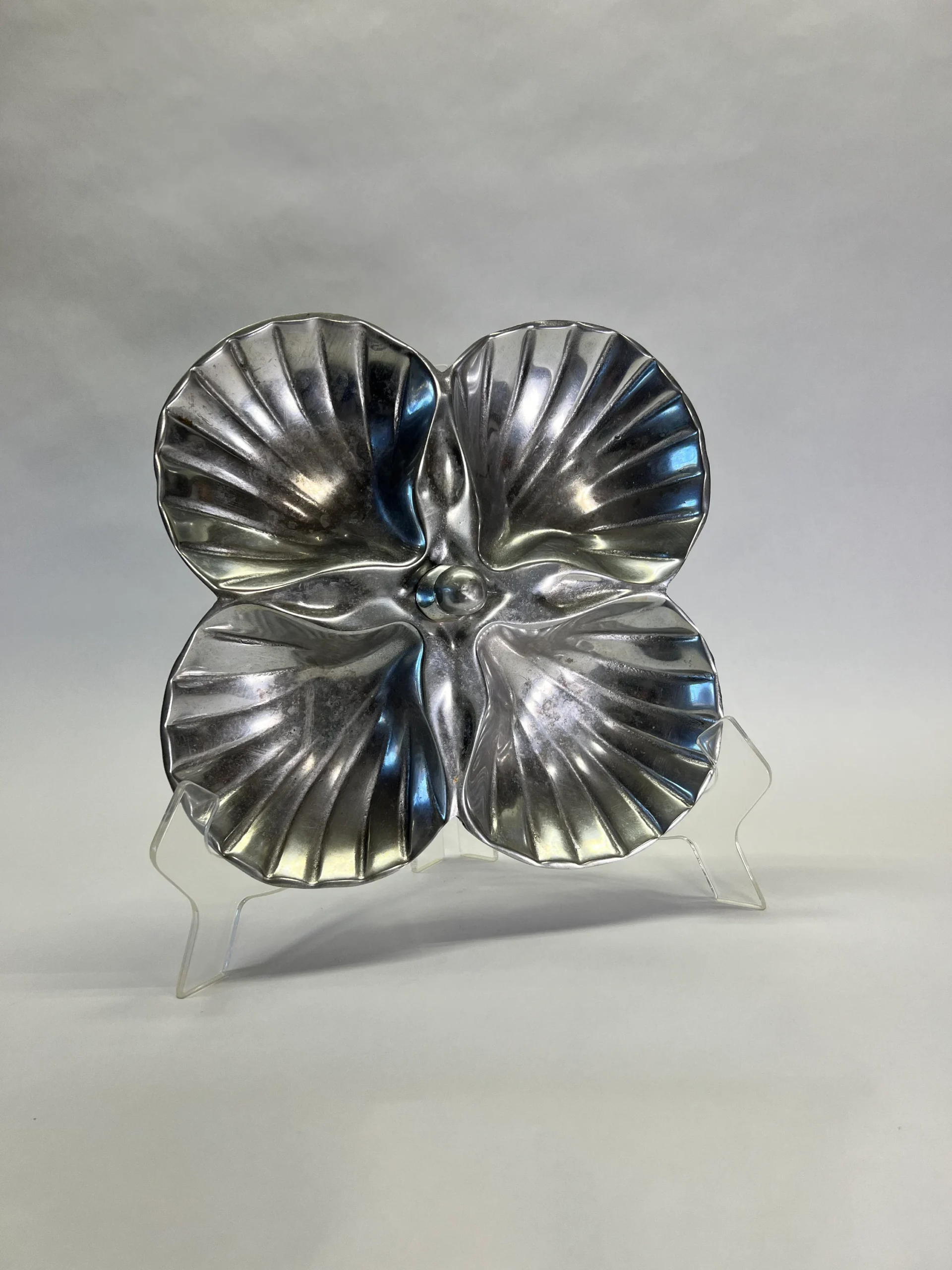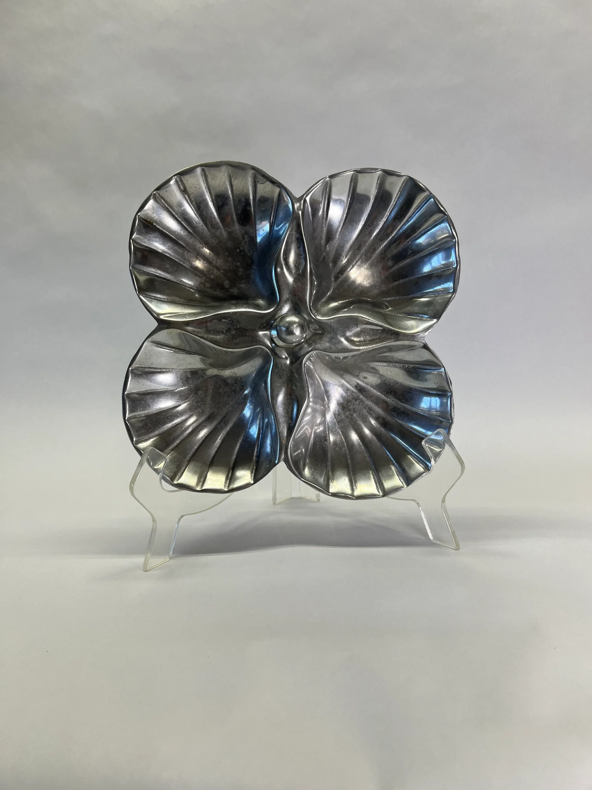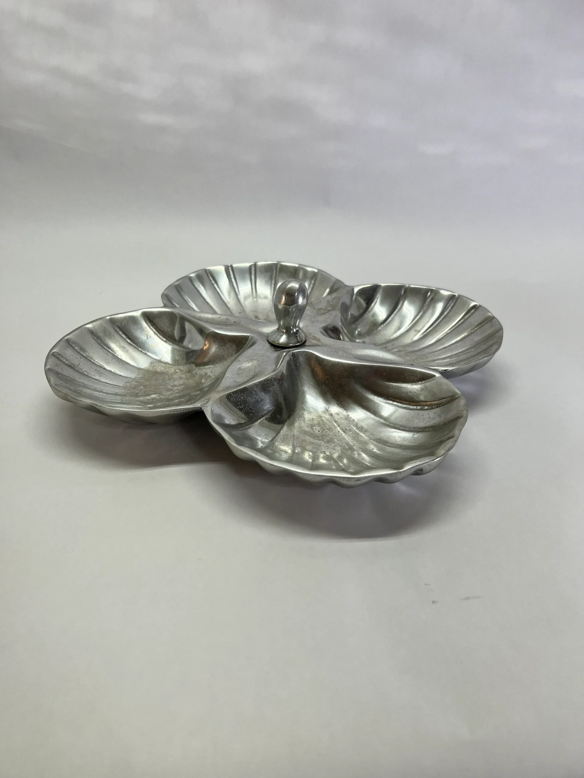 This cute server has 4 shell-shaped compartments and a center handle, making it perfect for presenting and assortment of condiments, dips, or nibbles on your table or buffet. Good condition with some signs of wear from use, as expected for an item of this age and material. 12″ “corner to corner”, handle take height to 3″.