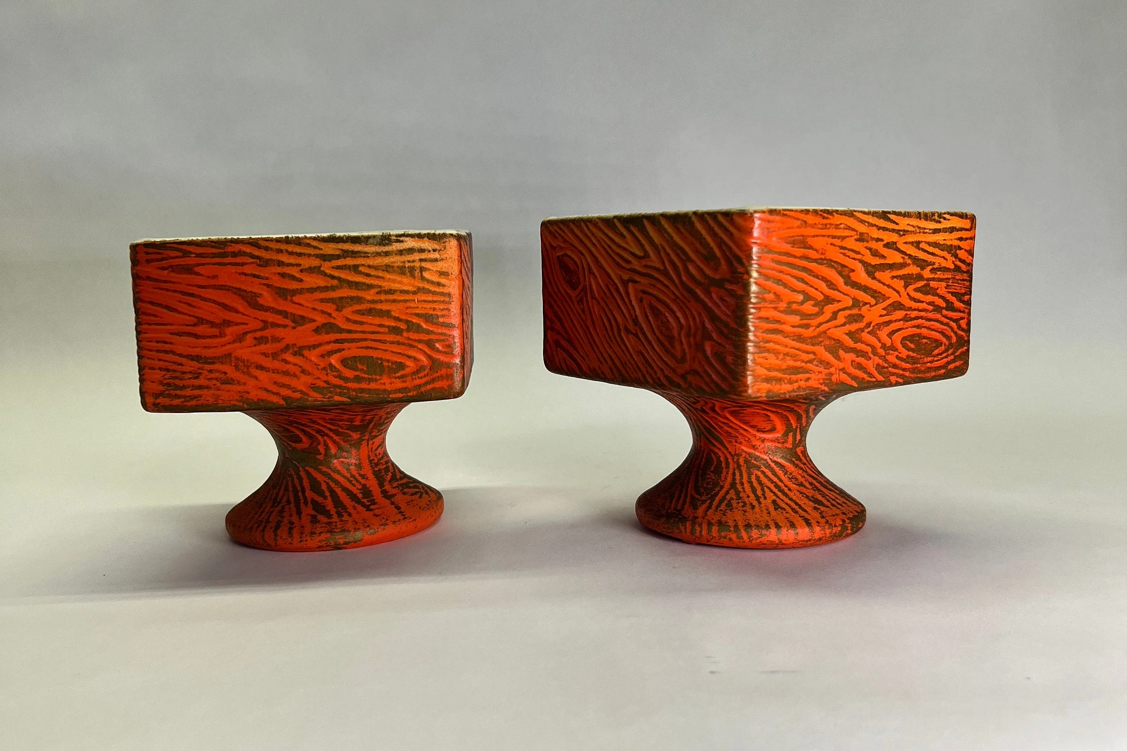 McCoy Pottery got into the MCM vibe with these “groovy” pedestal planters, that are actually not from Aunt Nen’s house, but my maternal grandmother ZhaZha. (long story!) Anyway, they were probably a housewarming gift, probably from Aunt Nen, when the house was completed in the late 1950’s. The matte orange surfaces are embossed with a woodgrain pattern highlighted by a gold-tinged glaze. The effect looks more like tiger’s stripes or flames than wood, but regardless, they’ll add a cool MCM touch to your credenza! Sold as a pair only. Gift Wrap Available!