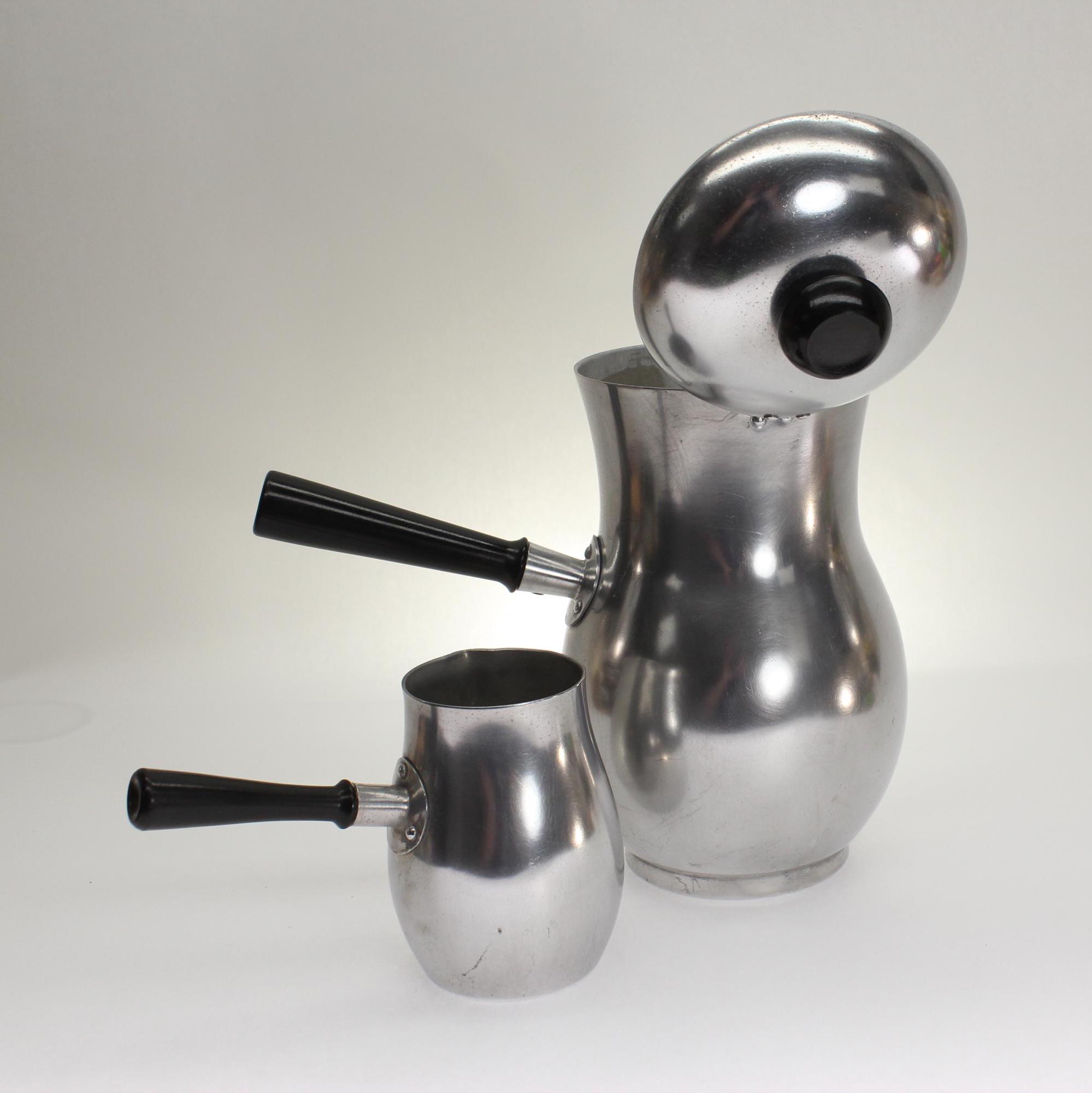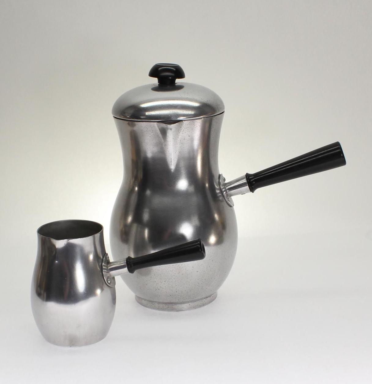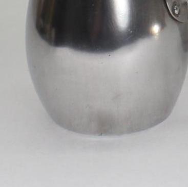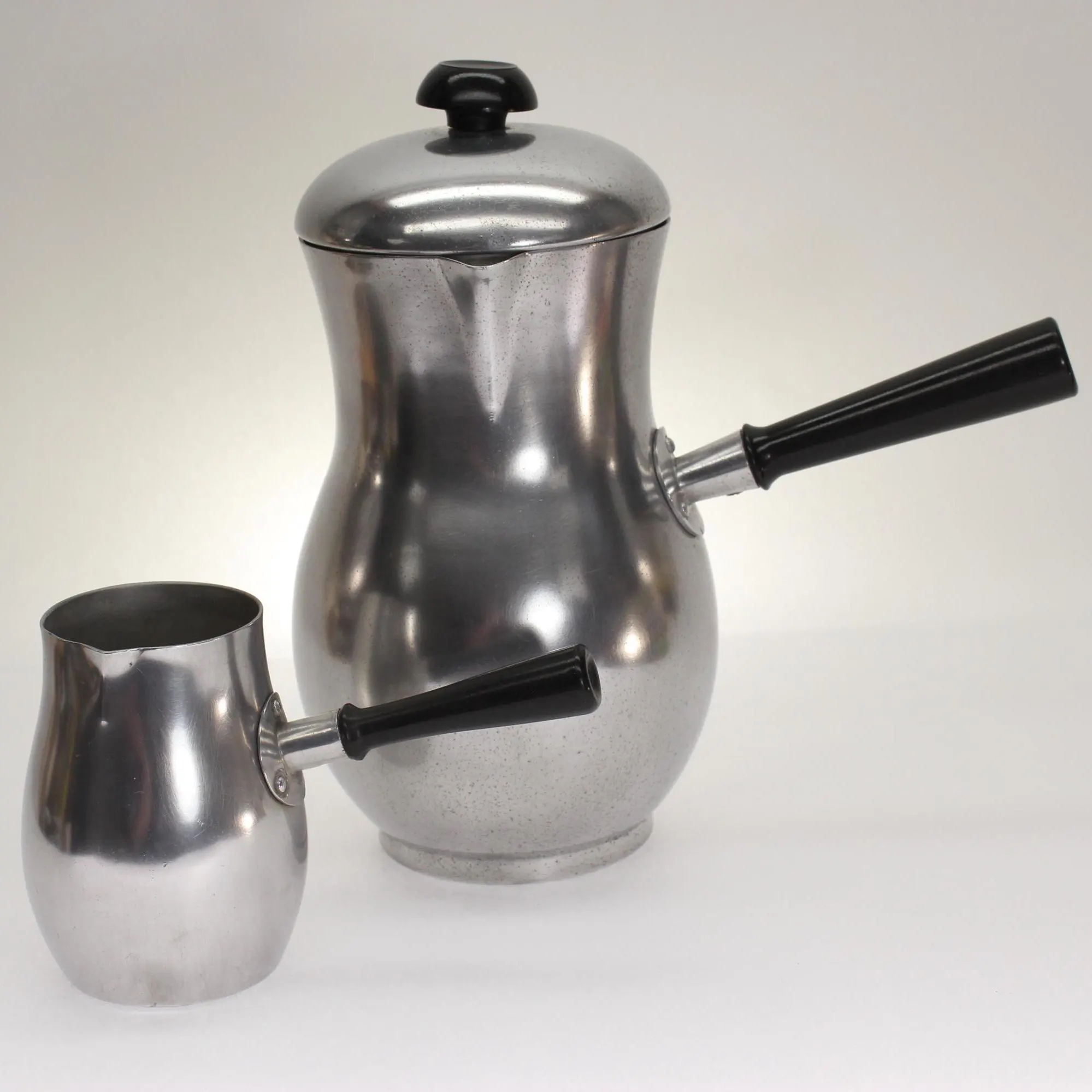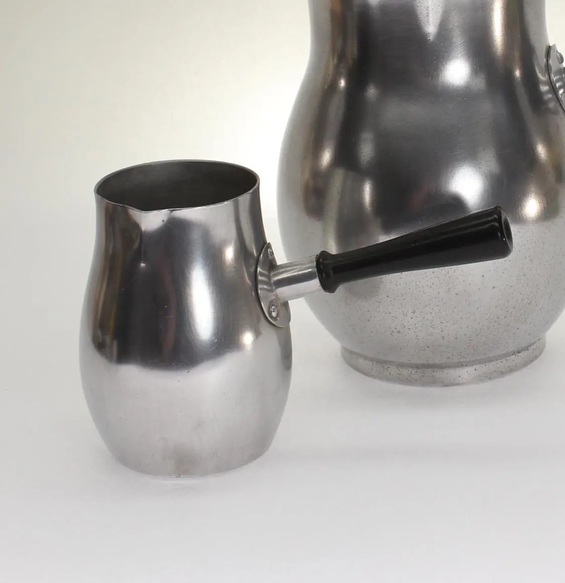 The pot is about 10-1/2″ tall with the hinged lid closed, and the pitcher is about 4-1/4″ tall. there is a small dent near the bottom of the little pitcher that I’ve tried to highlight in one photo, but honestly it’s pretty hard to see. There is some light scratching and pitting due to age, but I didn’t want to polish down any further to avoid removing too much material.