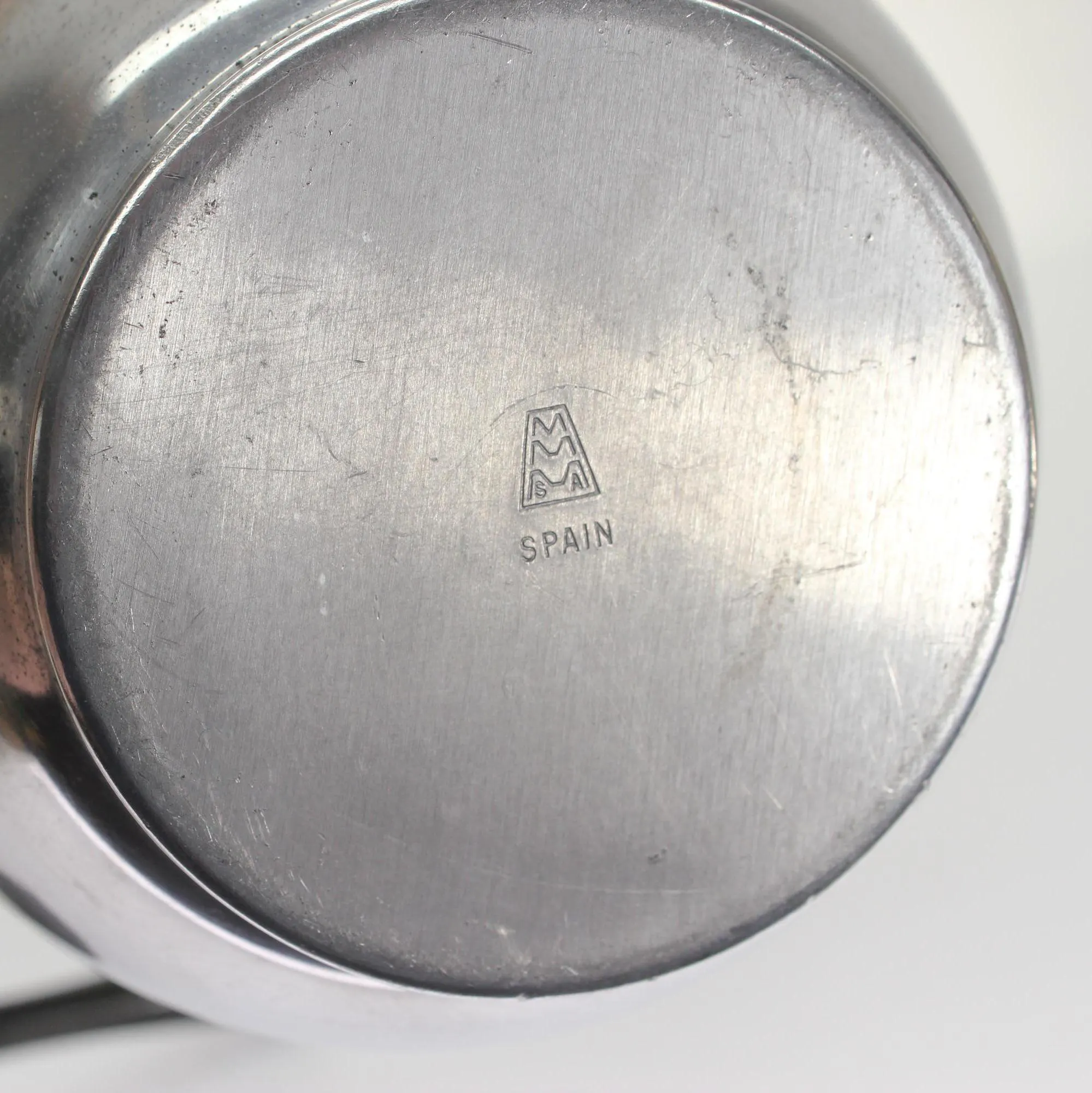The “MMM Spain” hallmark translates roughly to Madrid Metals Manufacturing and was commonly found on the company’s mid-20th-century aluminum products, such as cream and sugar sets with trays. These items, while not highly valued in today’s market, serve as collectibles representing mid-century Spanish metalwork.