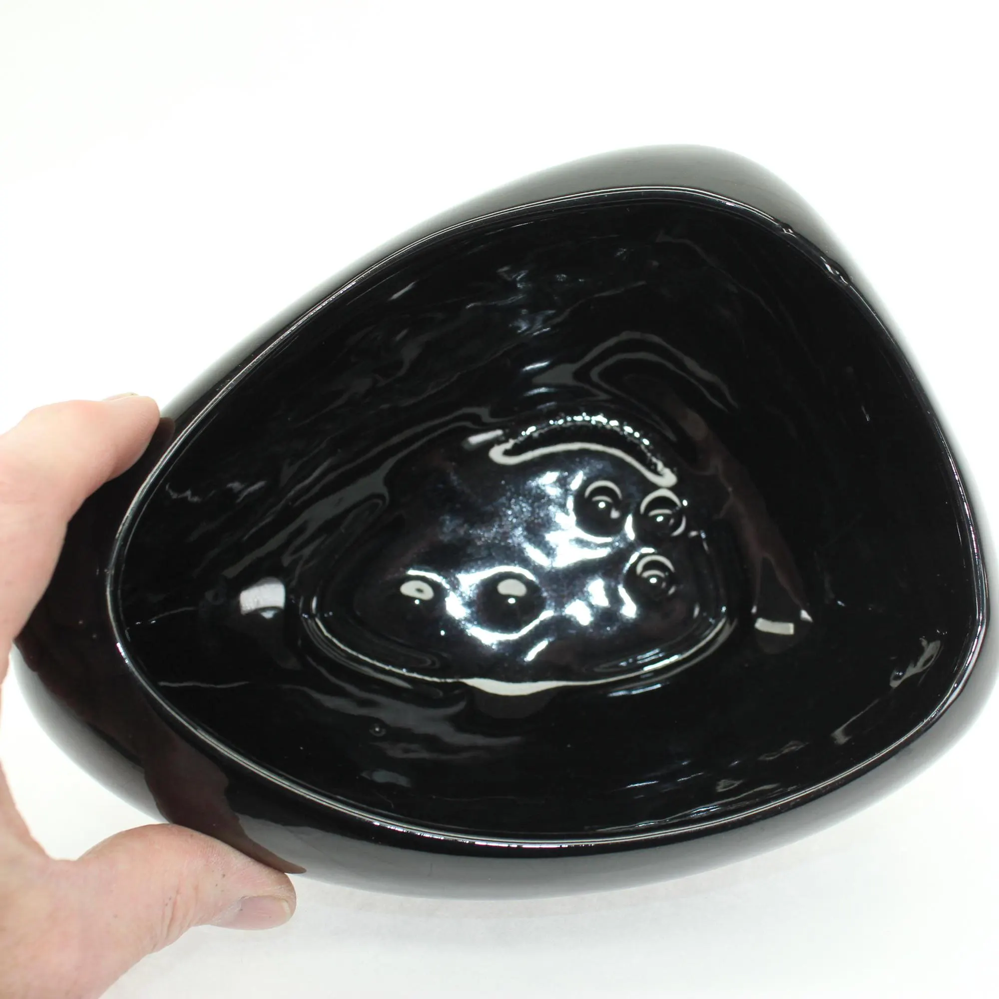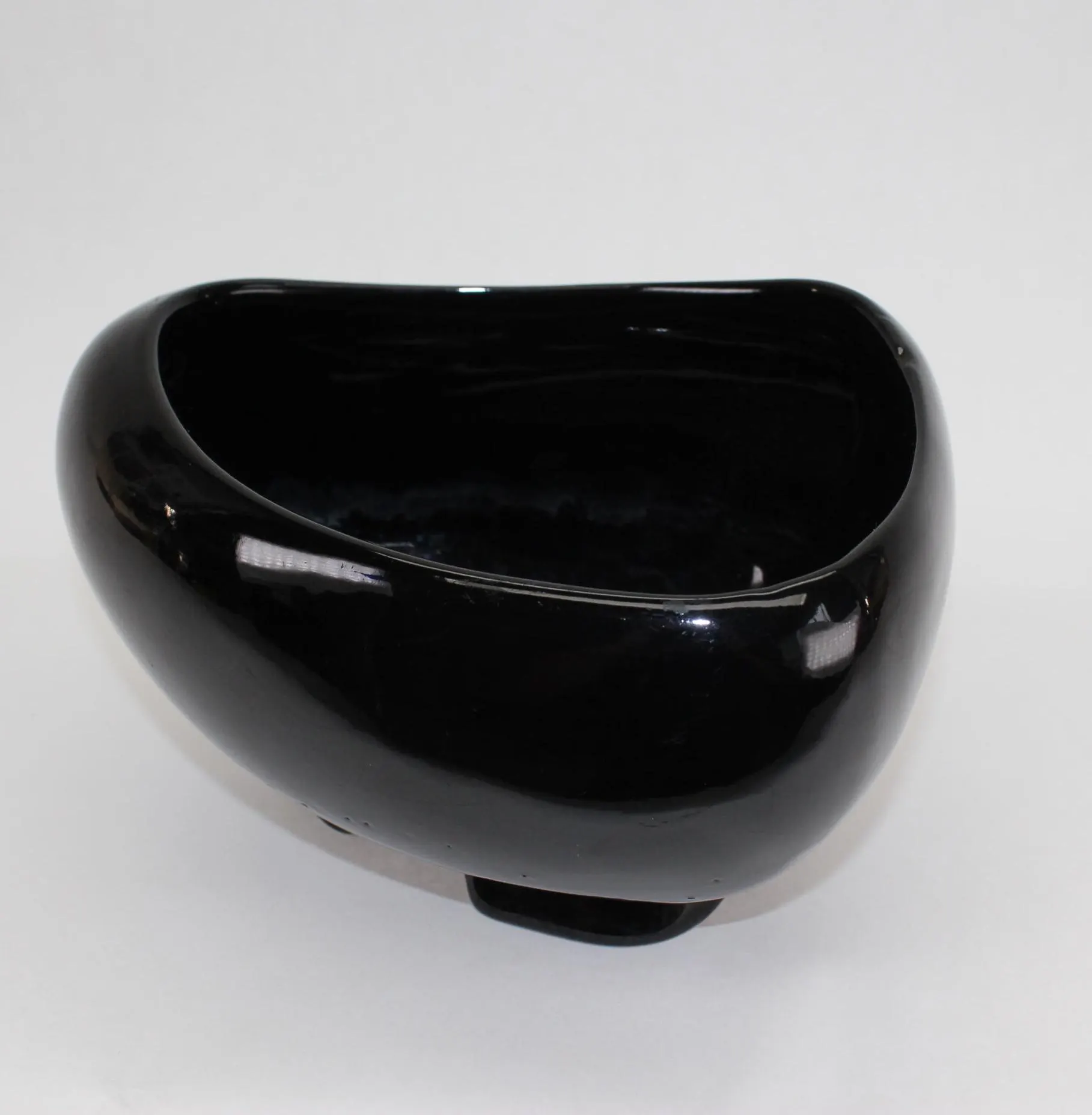 As the mid century marched through the 1950’s into the 60’s, design aesthetics morphed from finite shapes like boomerangs, saucers, and rockets to more amorphous shapes like blobs and puddles. This planter, in a glistening onyx glaze, is a prime example of that era. It has one corner and one round edge, and seems to change shape with each change of perspective.