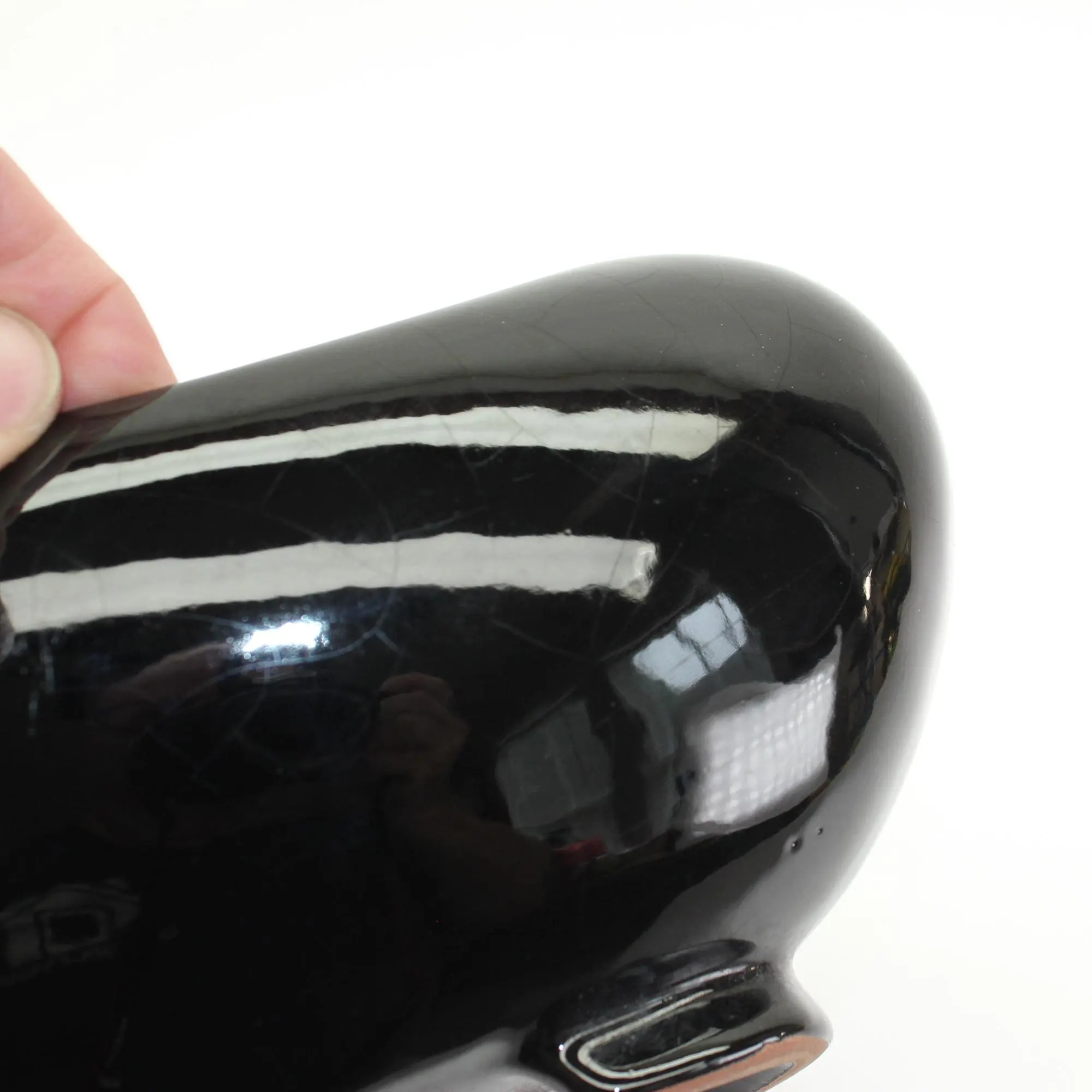 It’s in excellent shape with no chips or cracks, and some crazing that’s difficult to see due to the dark color. There are a coupe of kiln bubbles in the glaze that I’ve attempted to show in the photos.