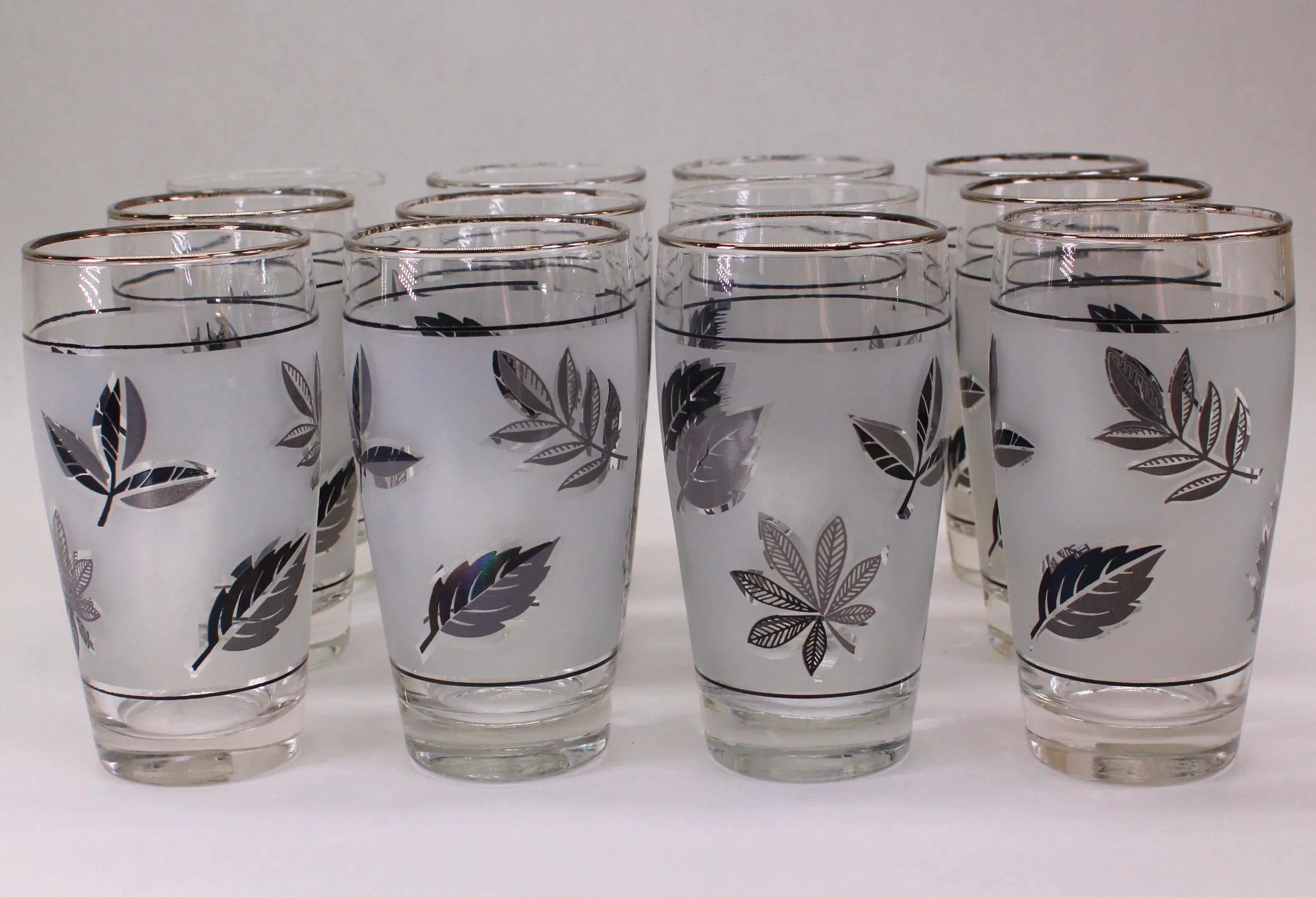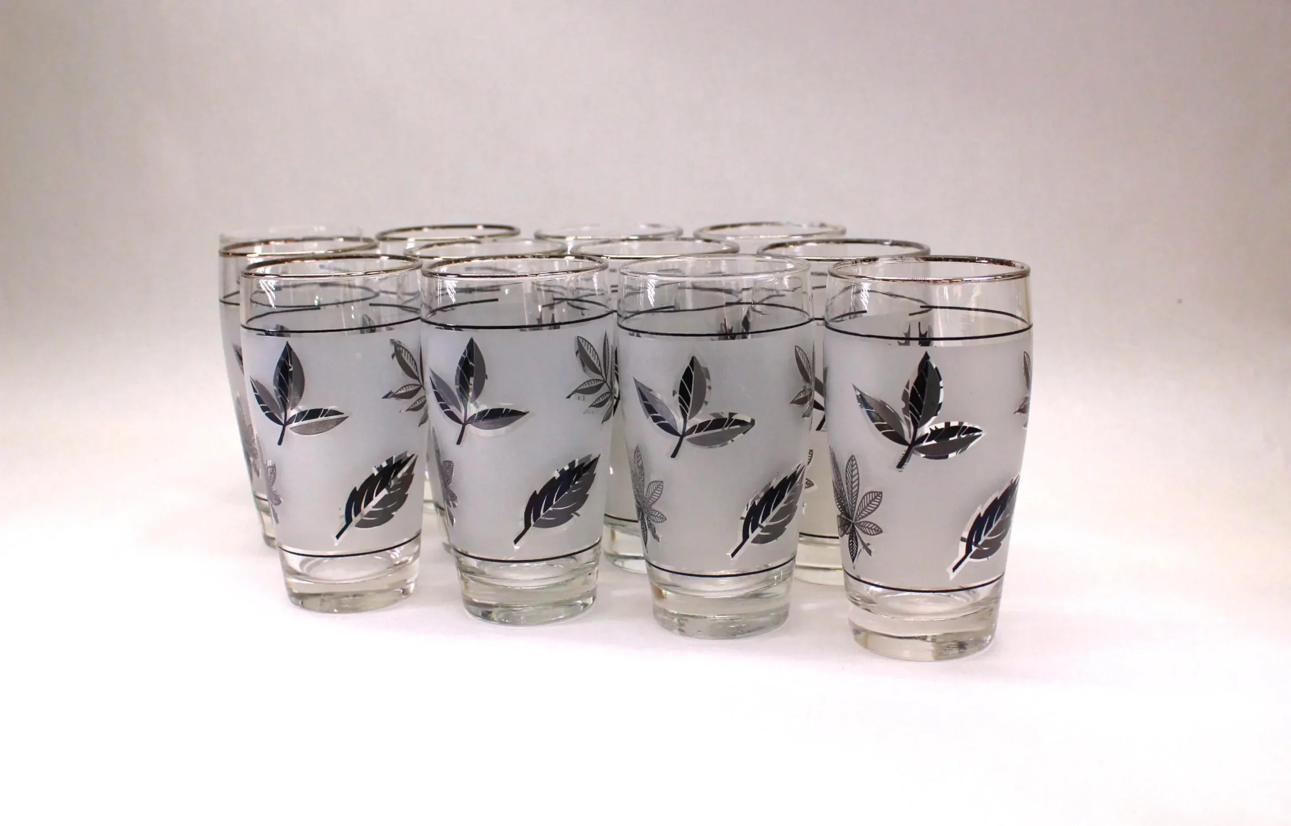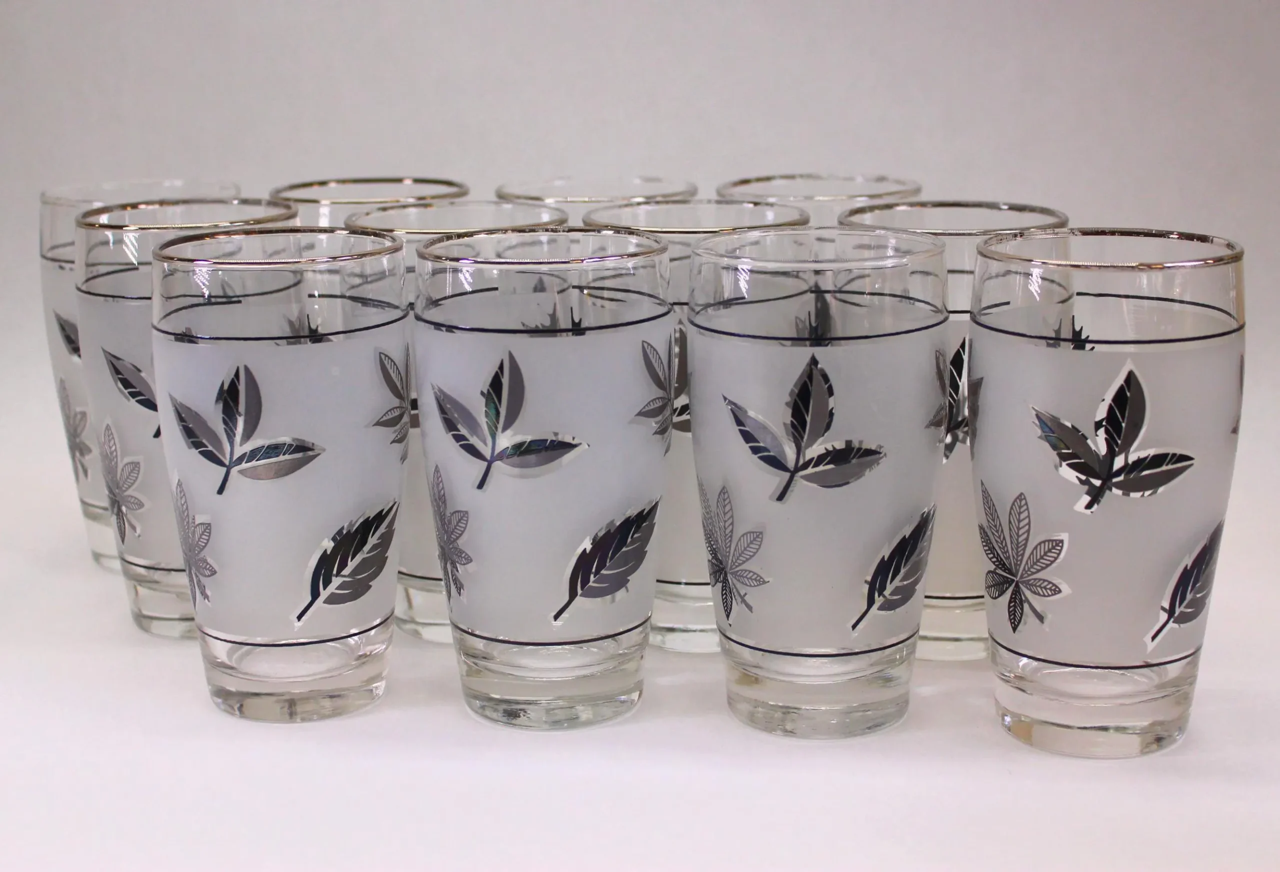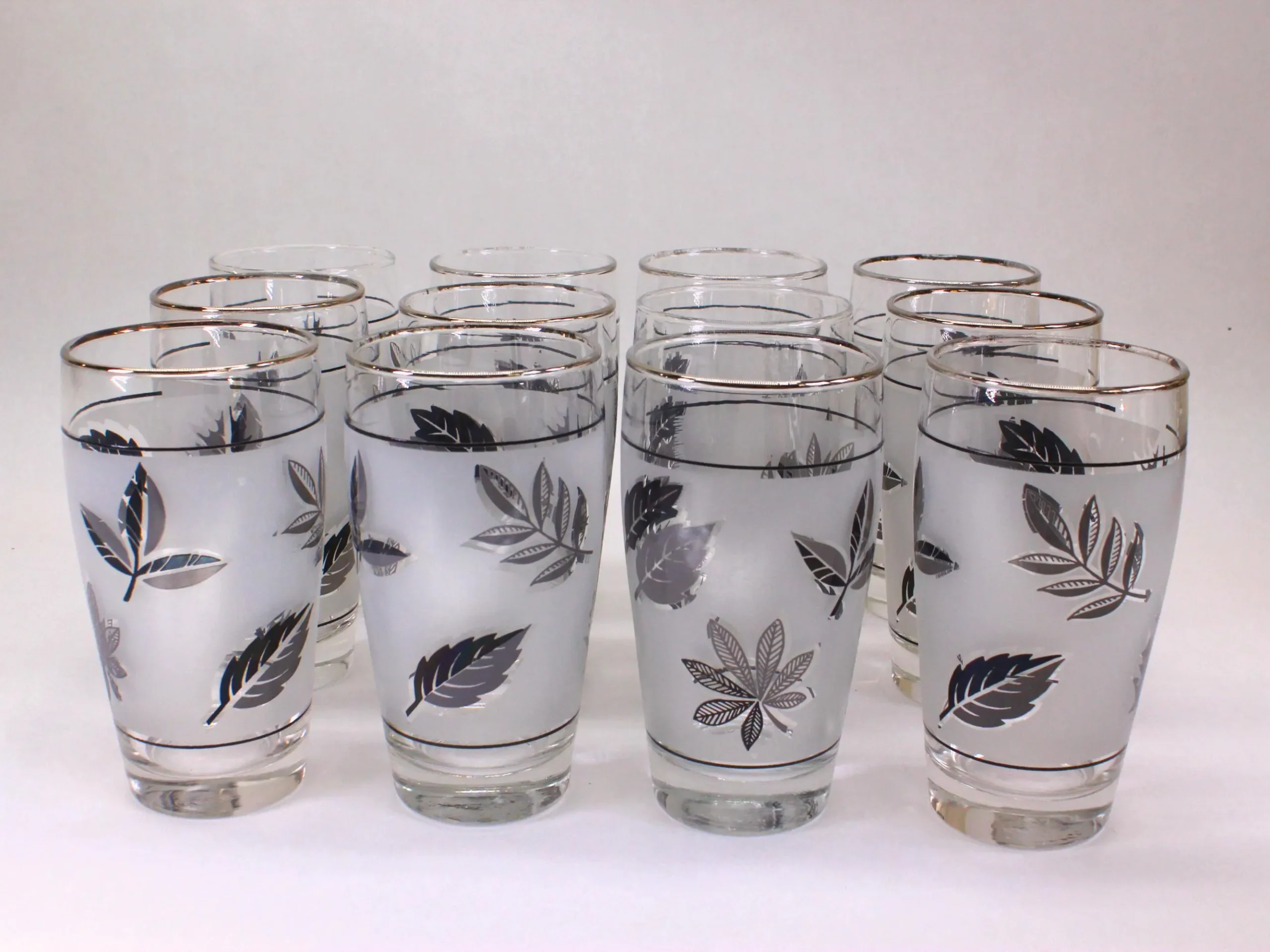 Several households in my family had these 12 oz. Libbey tumblers in the Silver Leaf pattern, usually reserved as barware for special occasions. Libbey made a straight-sided glasses that they called a Highball, but these gracefully tapered glasses would also be perfect for anything you would serve in a taller glass. They also made these glasses in 2 styles: “with trim” and “no trim.” In this grouping that I’m selling as a set of 12, ten of the glasses have the silver trim on the rims and two do not. The glasses are all in good condition with no cracks, chips, or dishwasher damage. A few of the glasses with trim have lost some of their silver as would be expected of glasses of this era. They stand 5-1/2″ tall and are 2-1/2″ across at the rim. They would be SO beautiful on Holiday table with a Cranberry Cocktail in them!