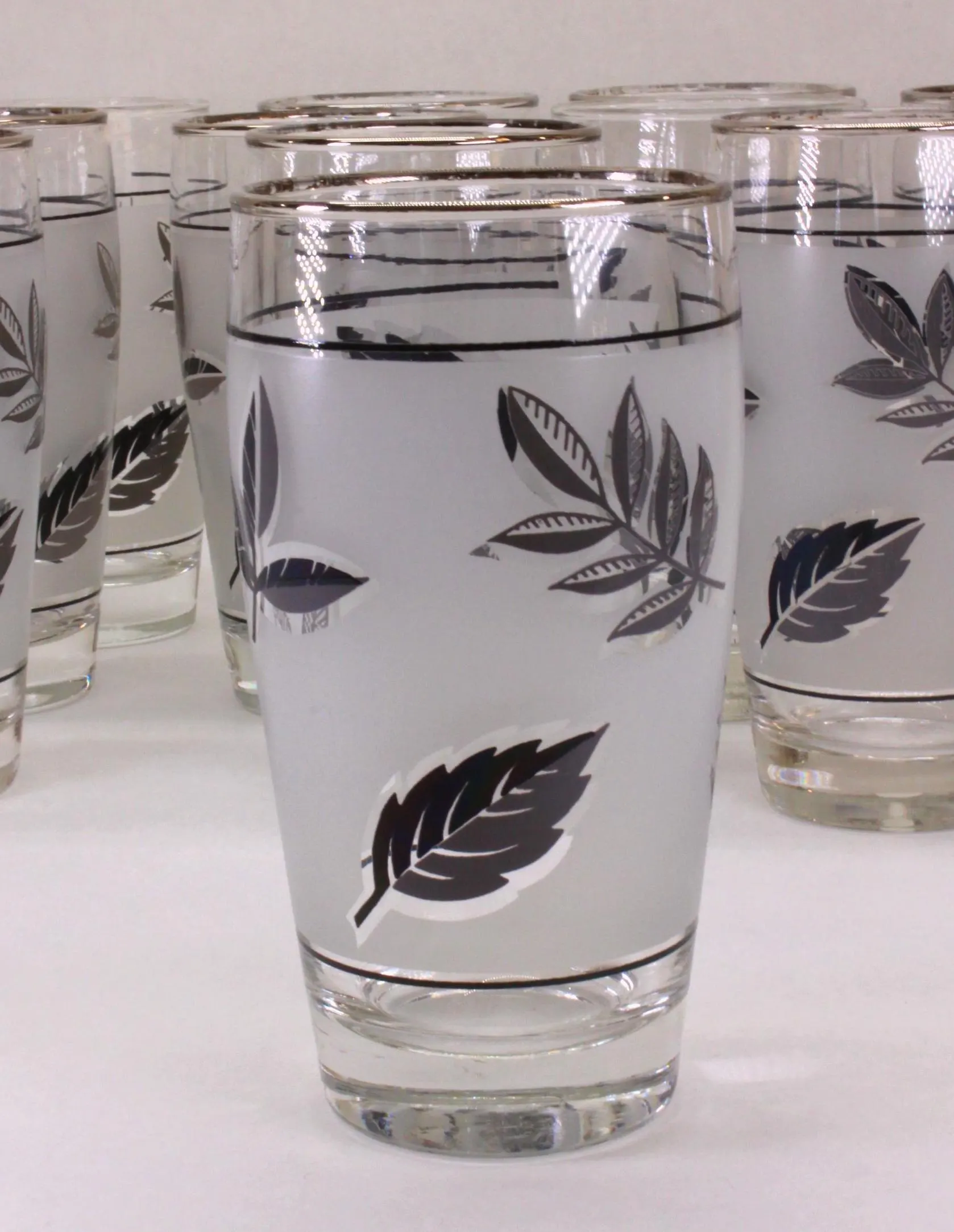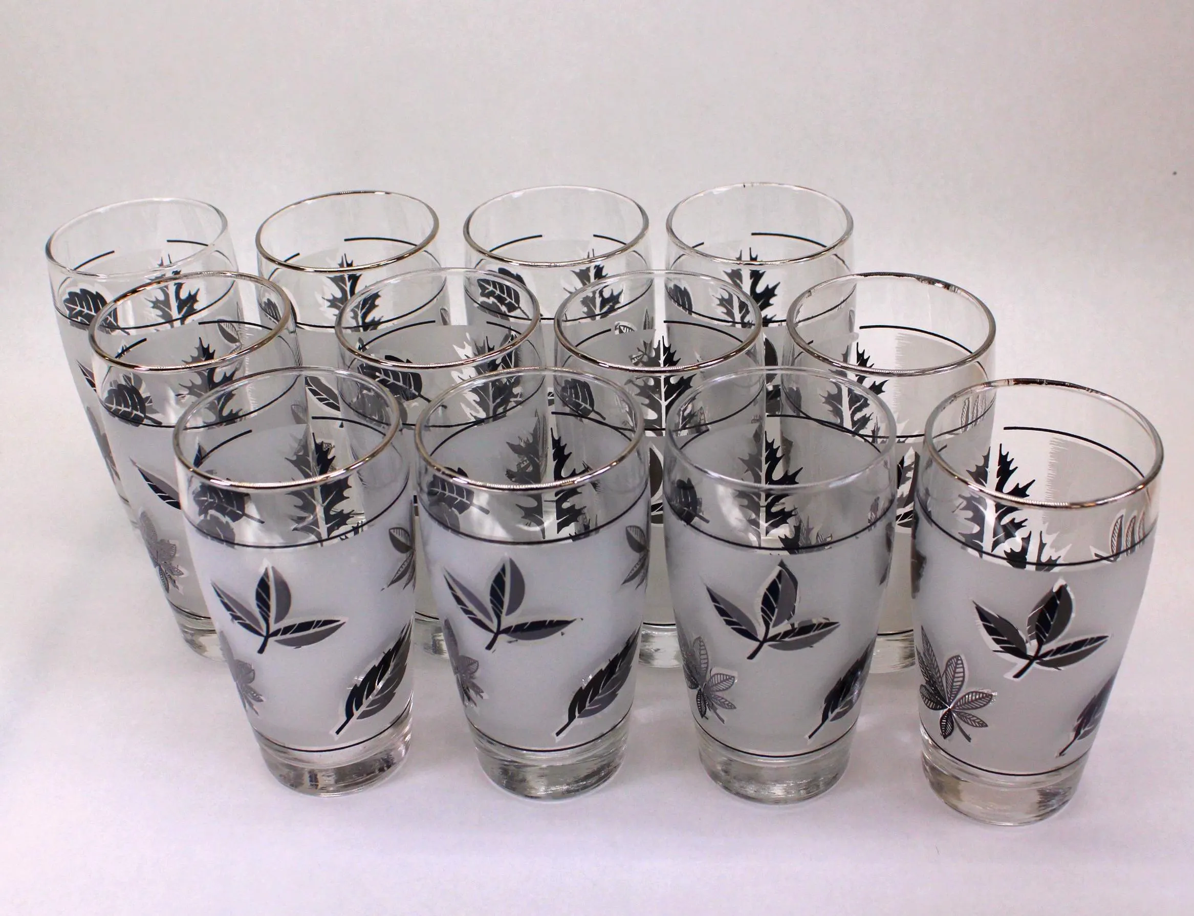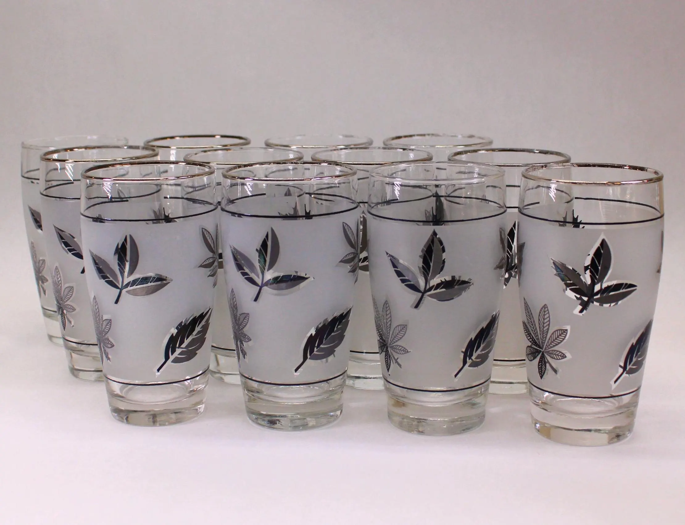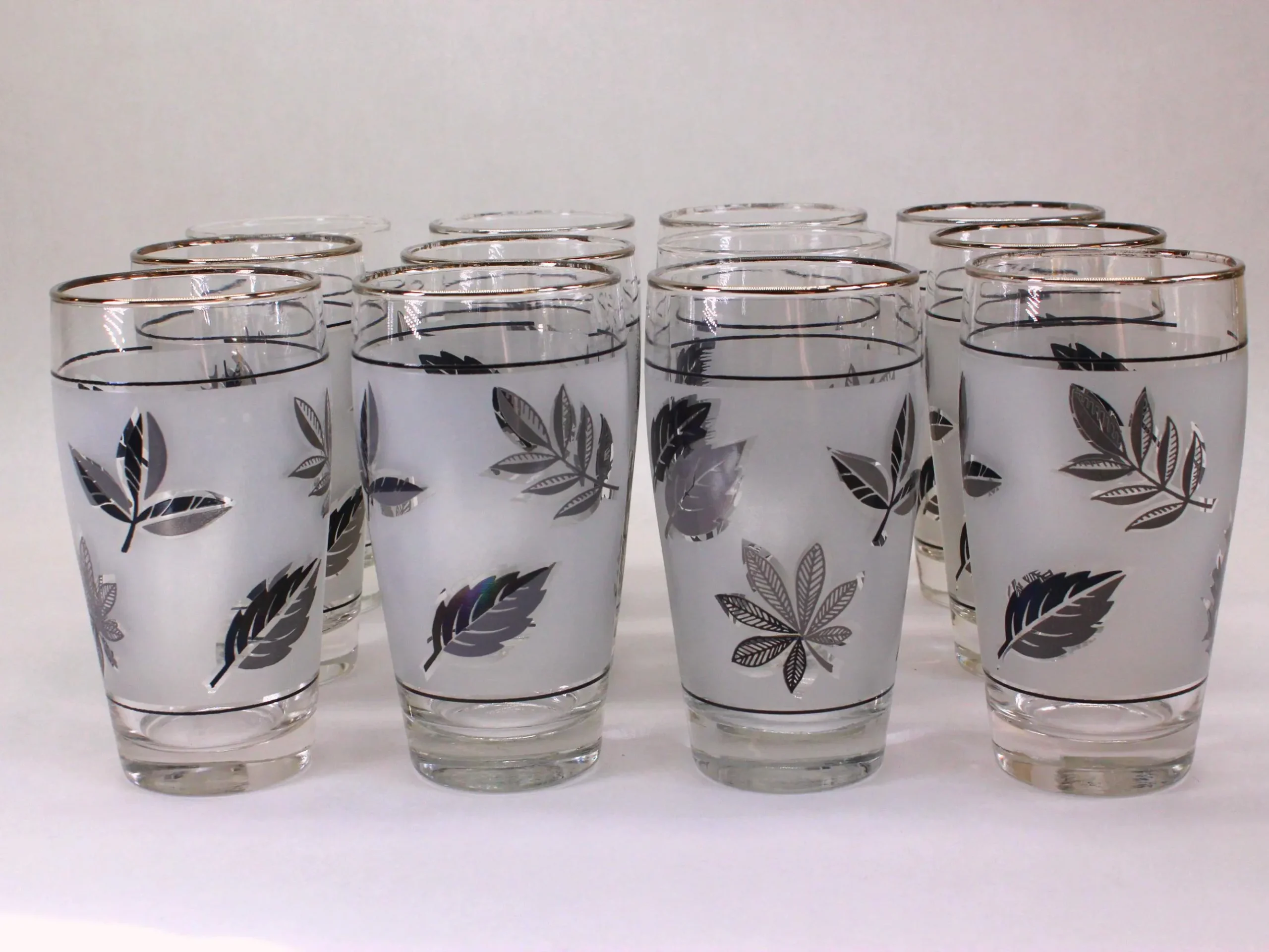 Several households in my family had these 12 oz. Libbey tumblers in the Silver Leaf pattern, usually reserved as barware for special occasions. Libbey made a straight-sided glasses that they called a Highball, but these gracefully tapered glasses would also be perfect for anything you would serve in a taller glass. They also made these glasses in 2 styles: “with trim” and “no trim.” In this grouping that I’m selling as a set of 12, ten of the glasses have the silver trim on the rims and two do not. The glasses are all in good condition with no cracks, chips, or dishwasher damage. A few of the glasses with trim have lost some of their silver as would be expected of glasses of this era. They stand 5-1/2″ tall and are 2-1/2″ across at the rim. They would be SO beautiful on Holiday table with a Cranberry Cocktail in them!