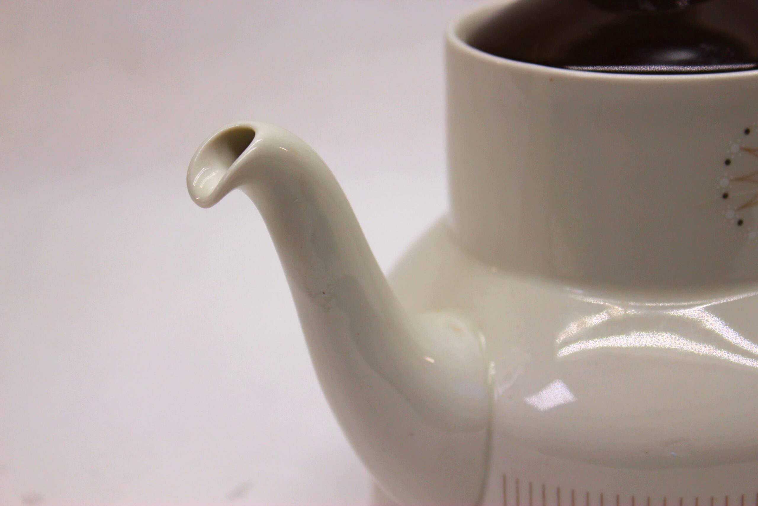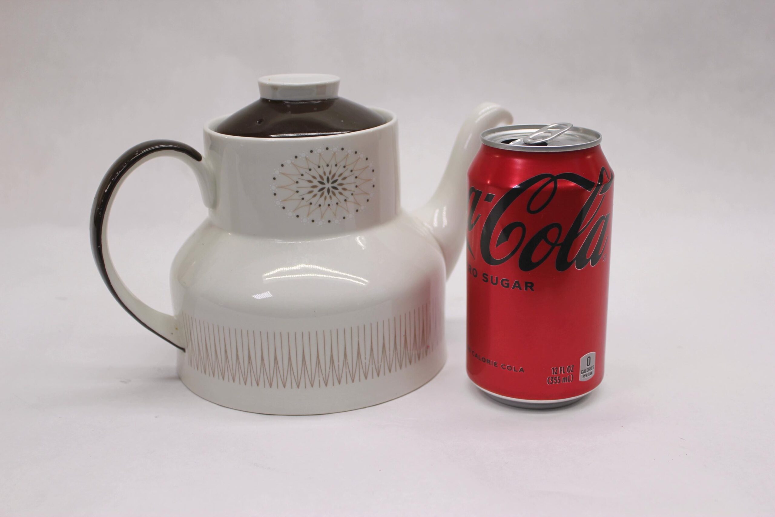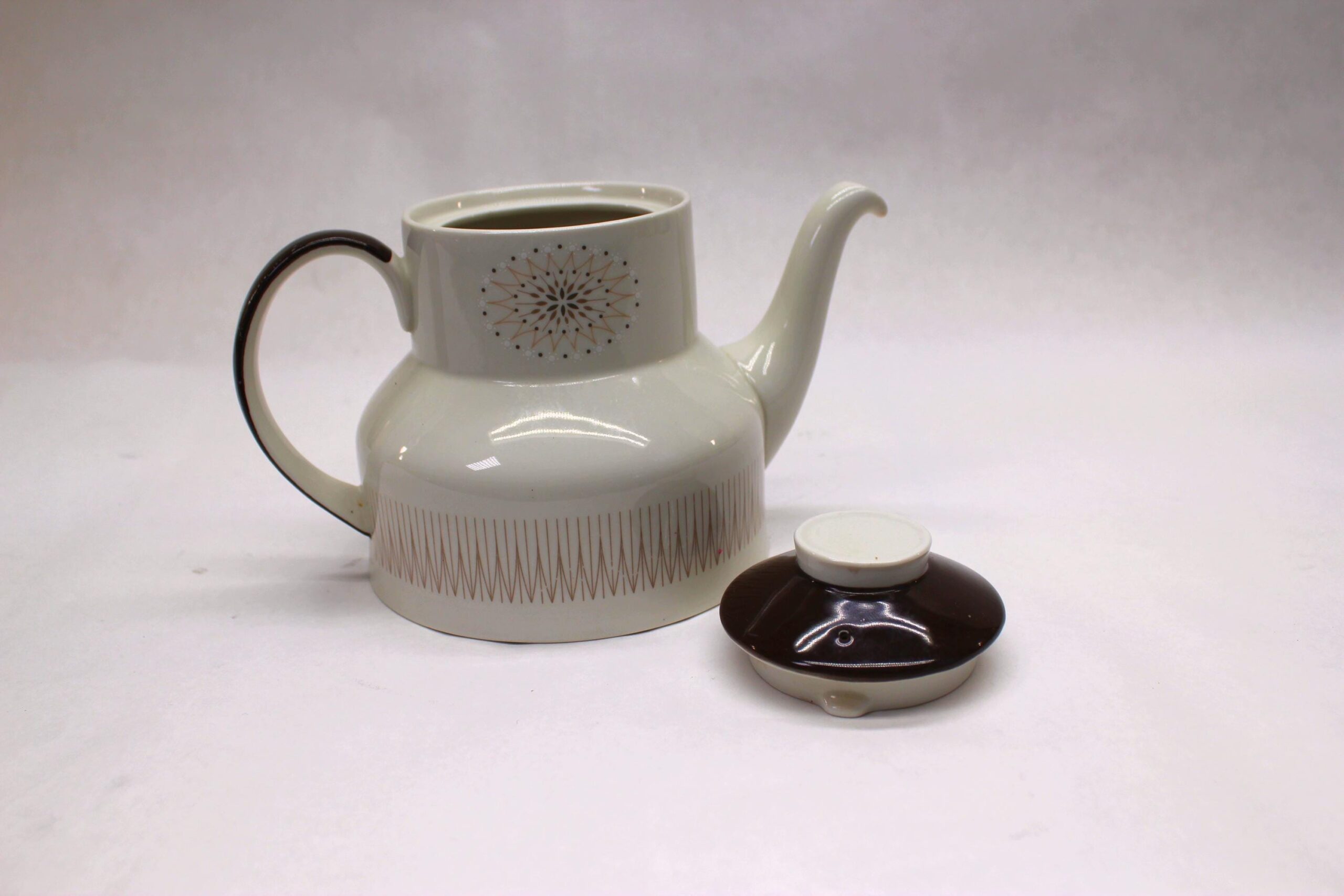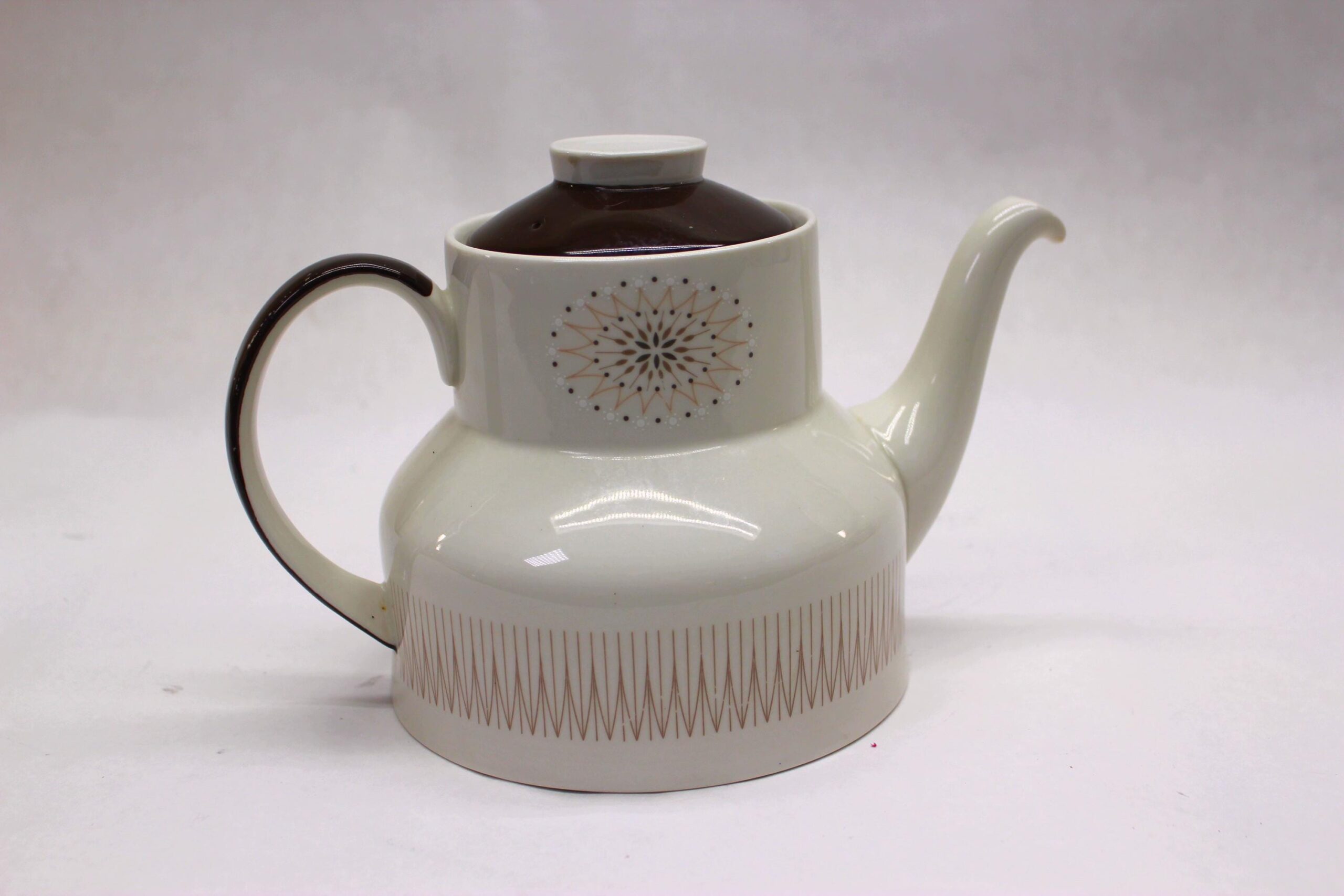 Leave to the Brits to do MCM modern in a demure way! Even the storied Royal Doulton Pottery got into the MCM groove, though without the flash and chrome of American manufacturers. While decidedly modern in shape and design, the shape is unquestionably "teapot." The starburst at the top and "fin" pattern at the bottom scream mid-century, though the muted tones respect British sensibilities. It's in good condition with no chips, cracks, or crazing; the only blemish I see is a little scratching of the brown overglaze on the handle.
