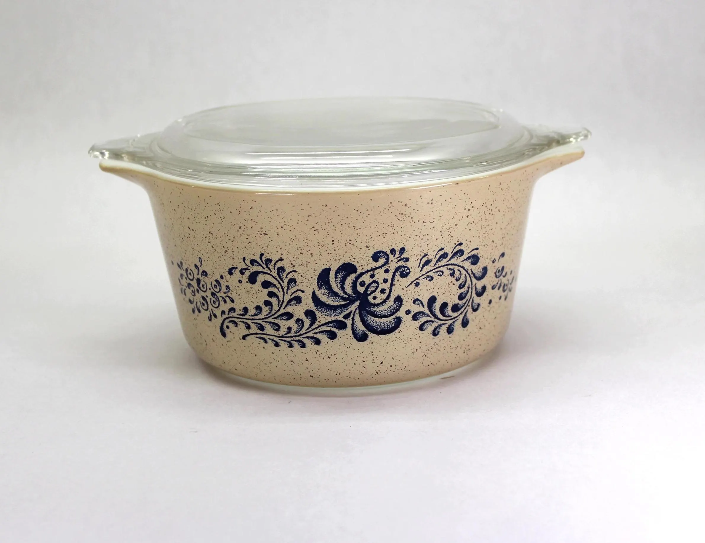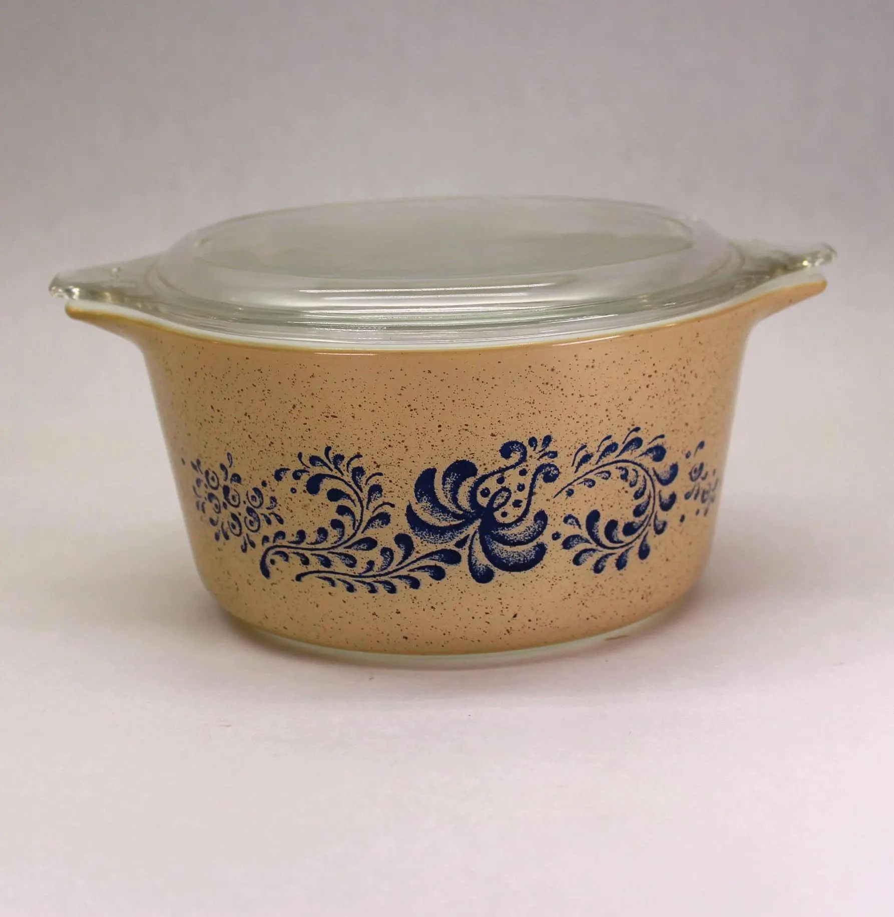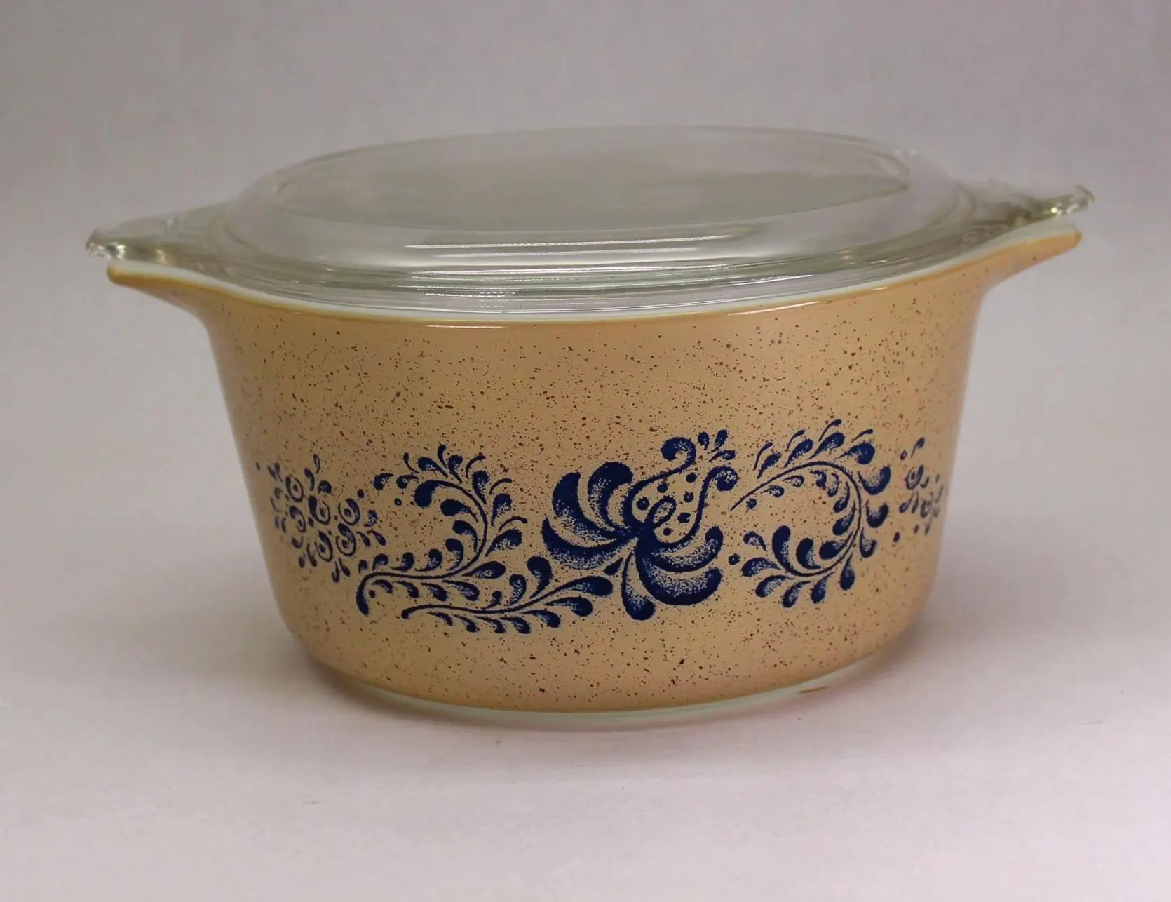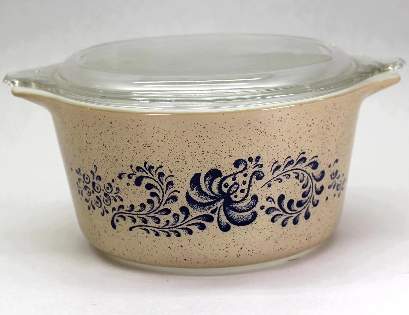 In 1976, during the Carter Administration, the United States celebrated its 200th Birthday- the Bicentennial, and everyone everywhere rushed to market with “Americana” themed merch. Pyrex was no exception, and this modern take on a crockery appearance was designed to seem stenciled with a blue floral pattern. It was a sort of riff on the popular Pfaltzgraff “Yorktown” stoneware pattern that was all the rage at the time. Homestead was the only pattern released by Pyrex that year.