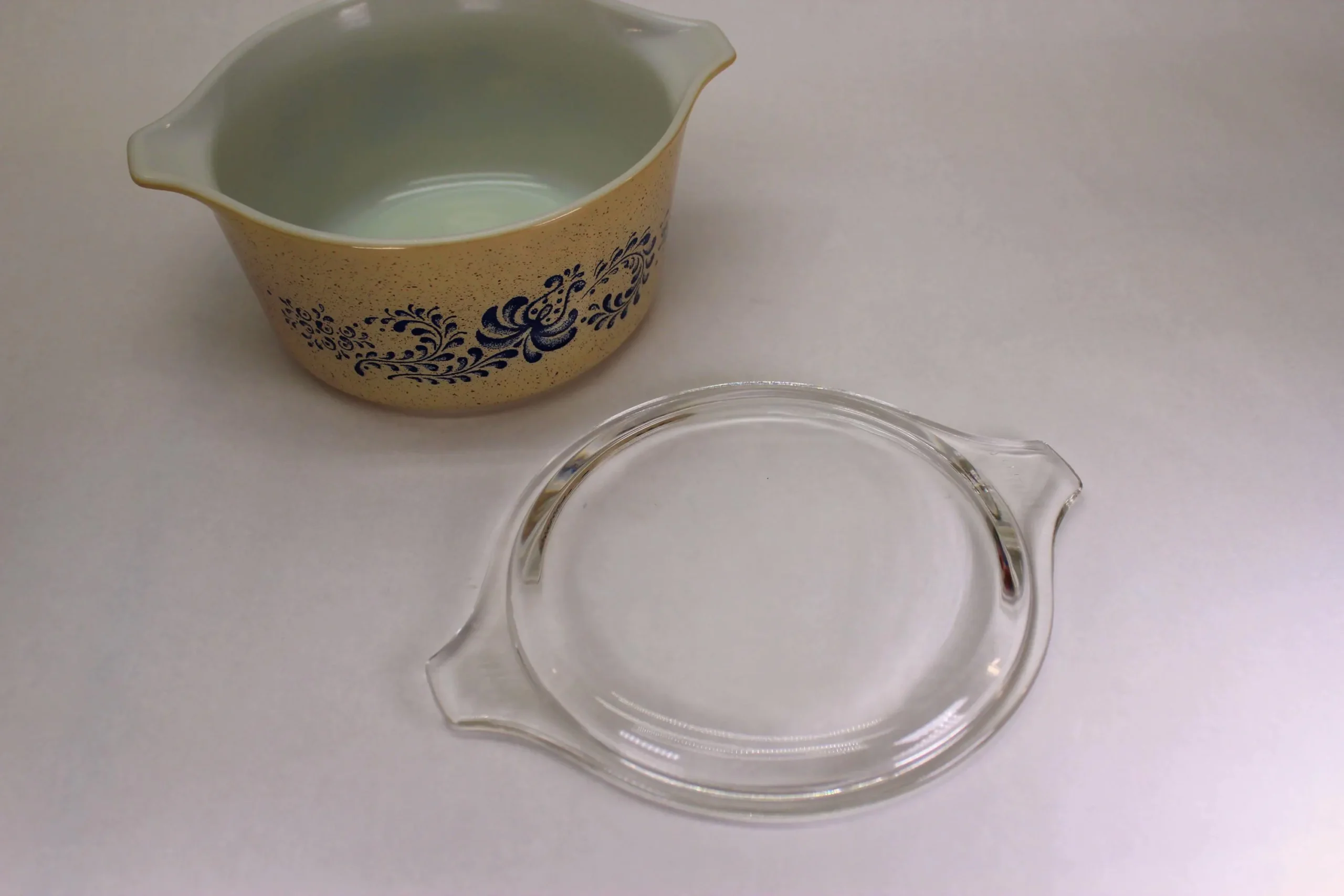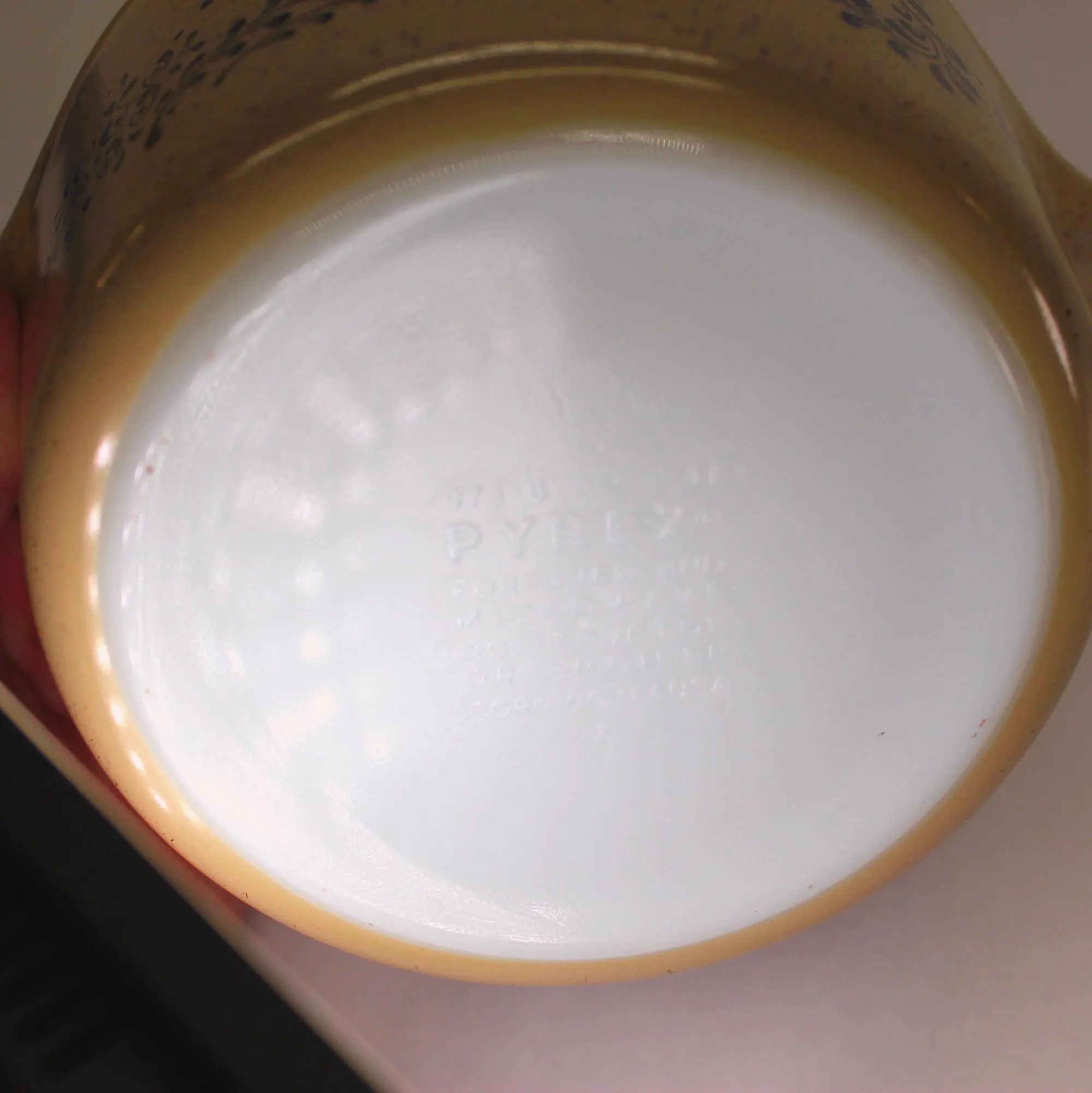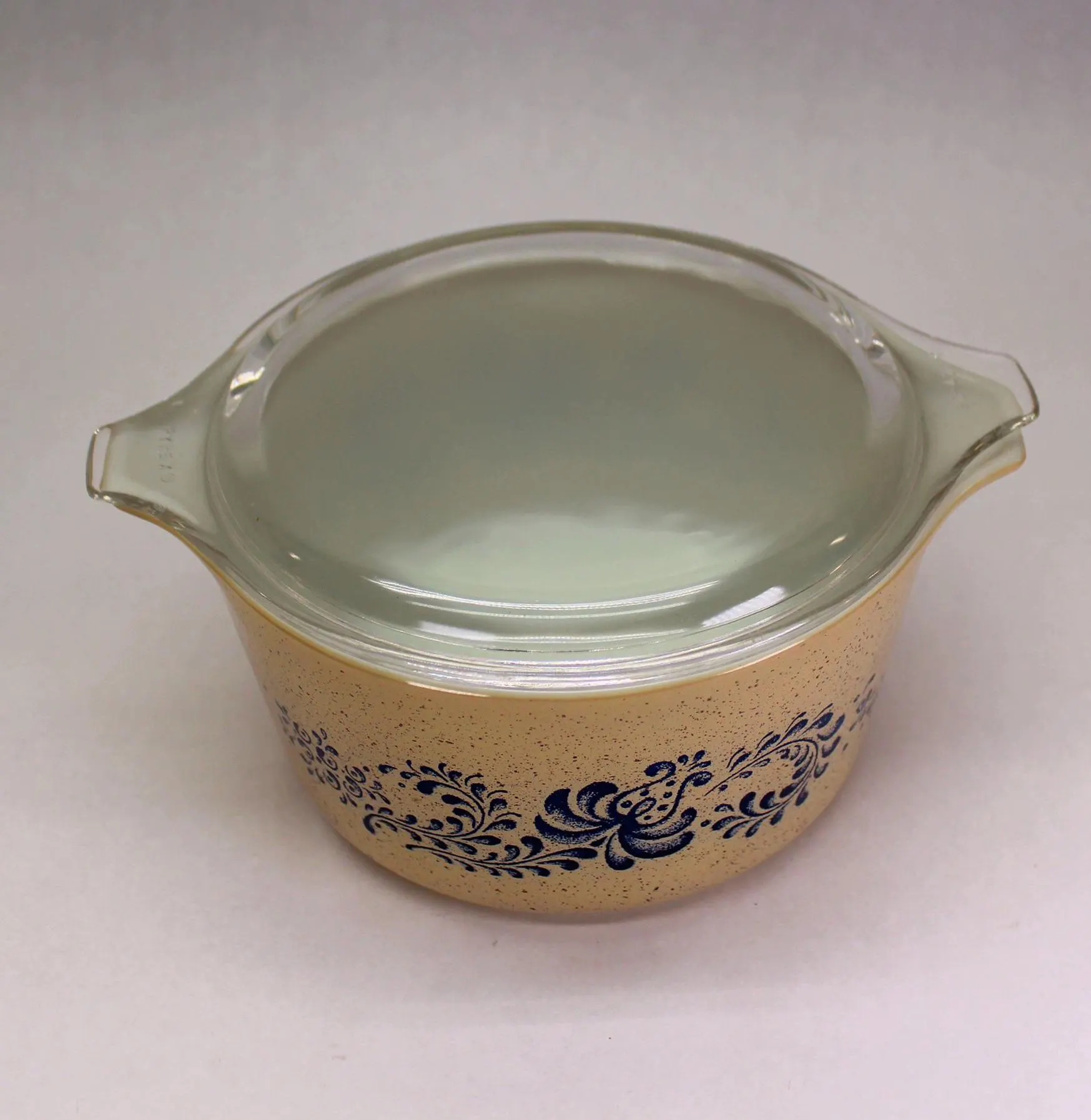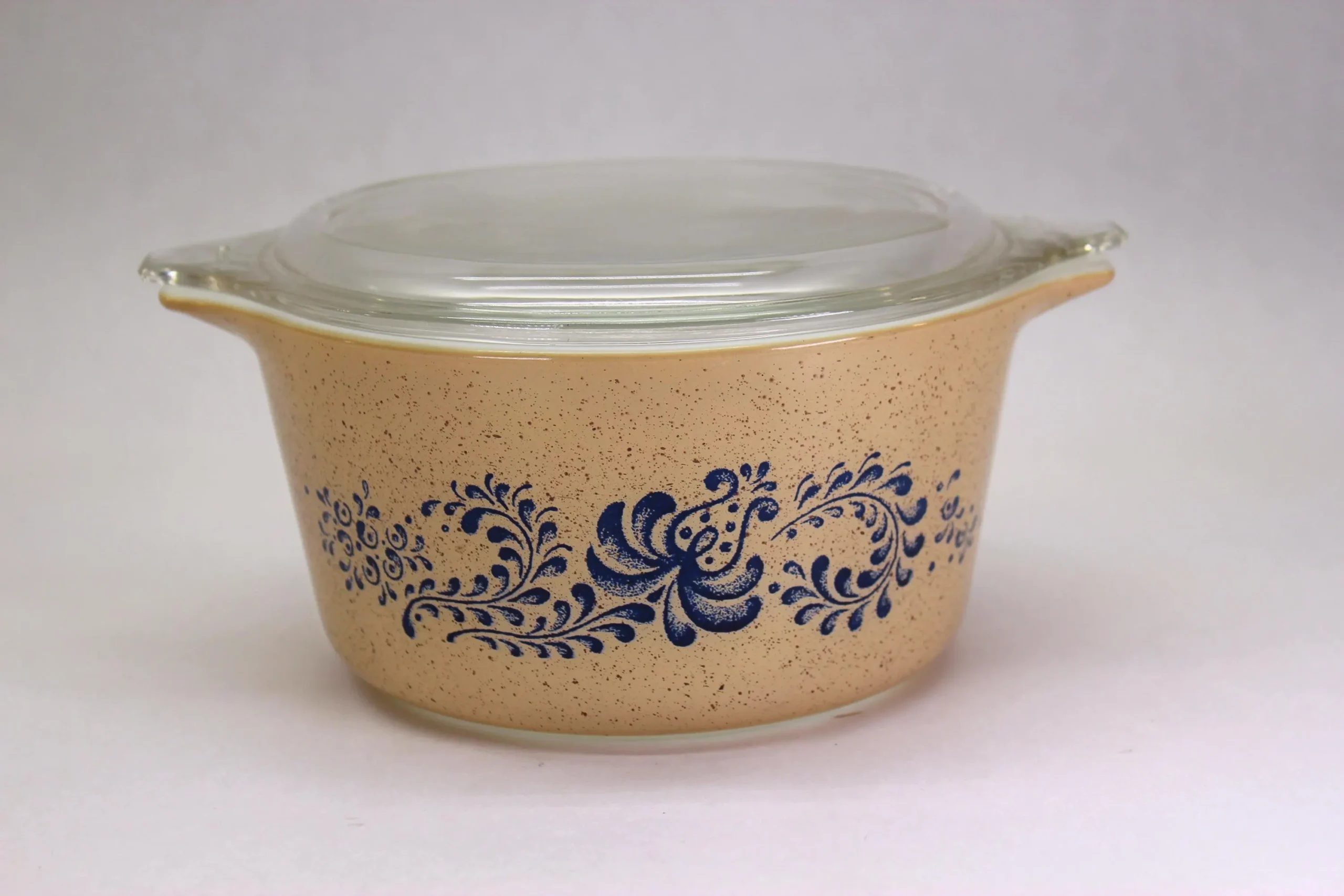 In 1976, during the Carter Administration, the United States celebrated its 200th Birthday- the Bicentennial, and everyone everywhere rushed to market with “Americana” themed merch. Pyrex was no exception, and this modern take on a crockery appearance was designed to seem stenciled with a blue floral pattern. It was a sort of riff on the popular Pfaltzgraff “Yorktown” stoneware pattern that was all the rage at the time. Homestead was the only pattern released by Pyrex that year.