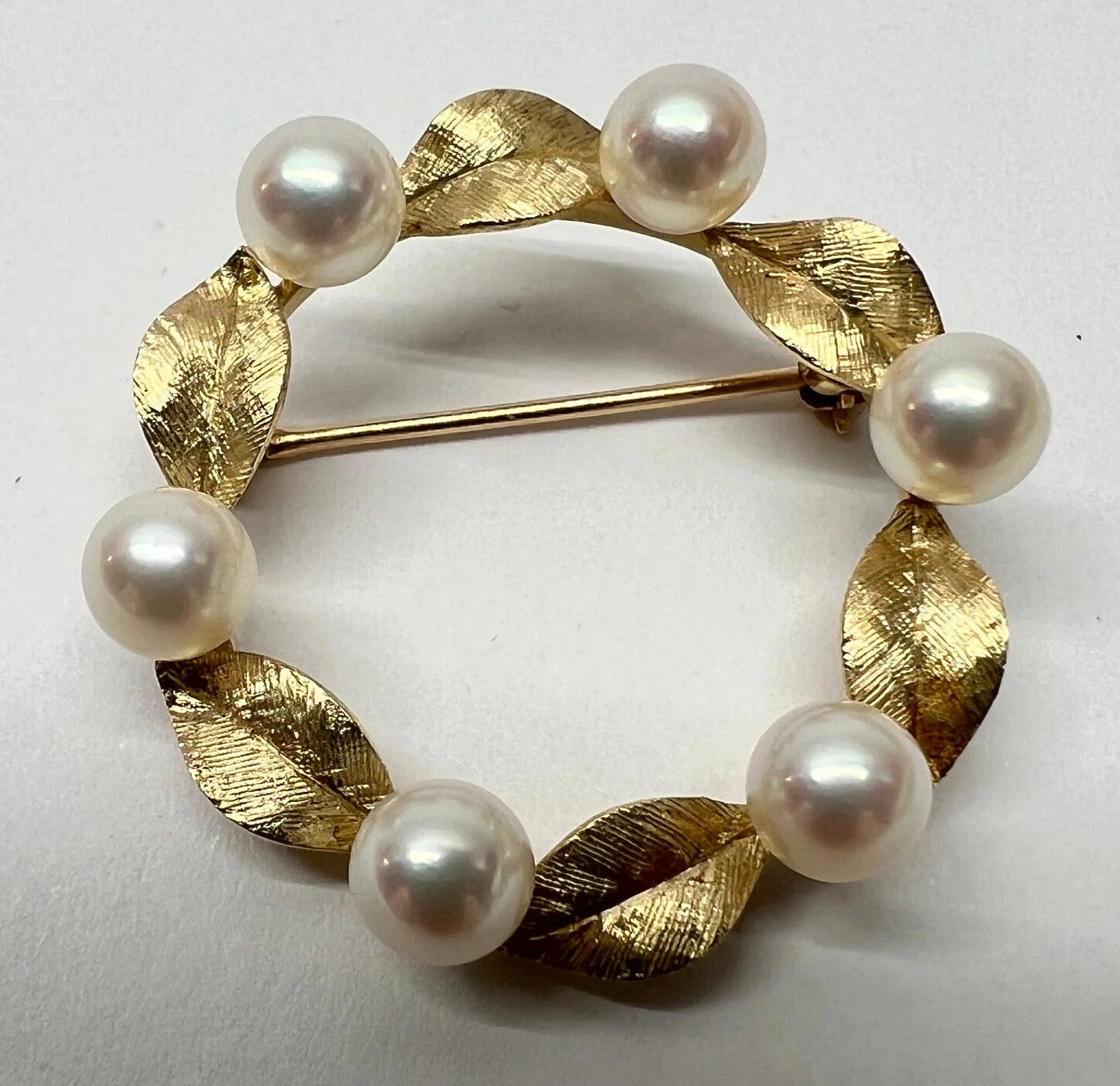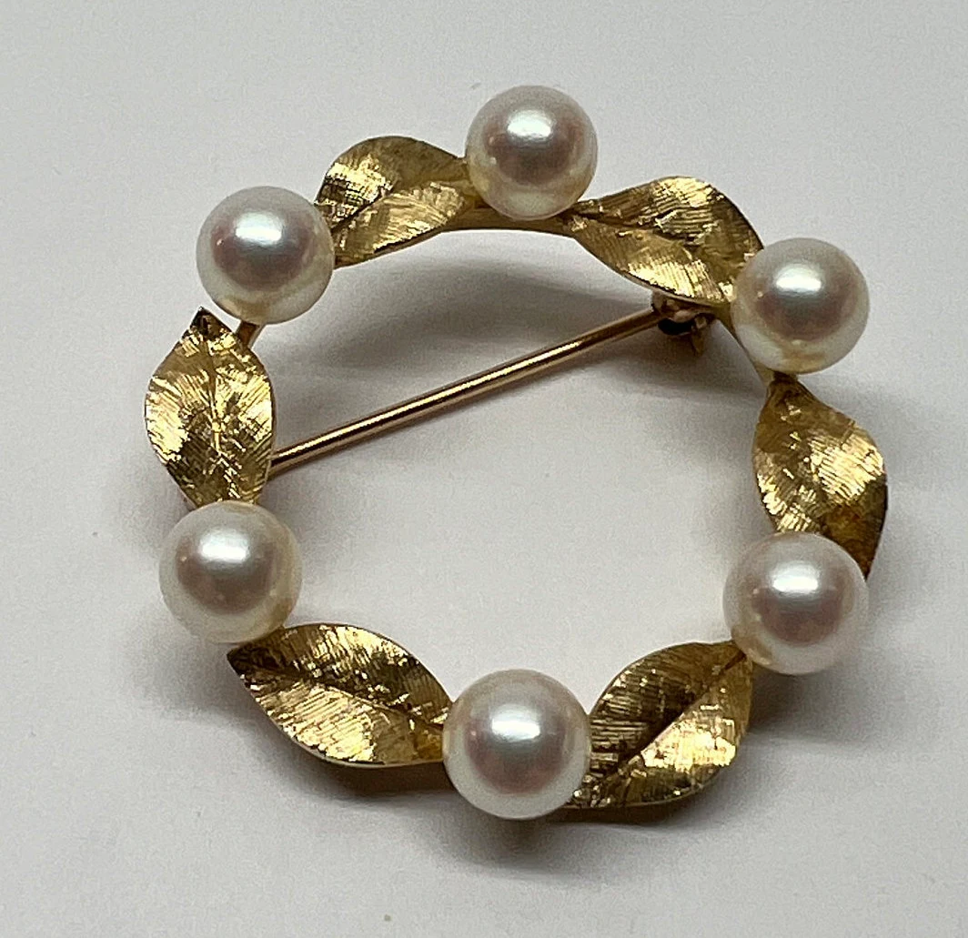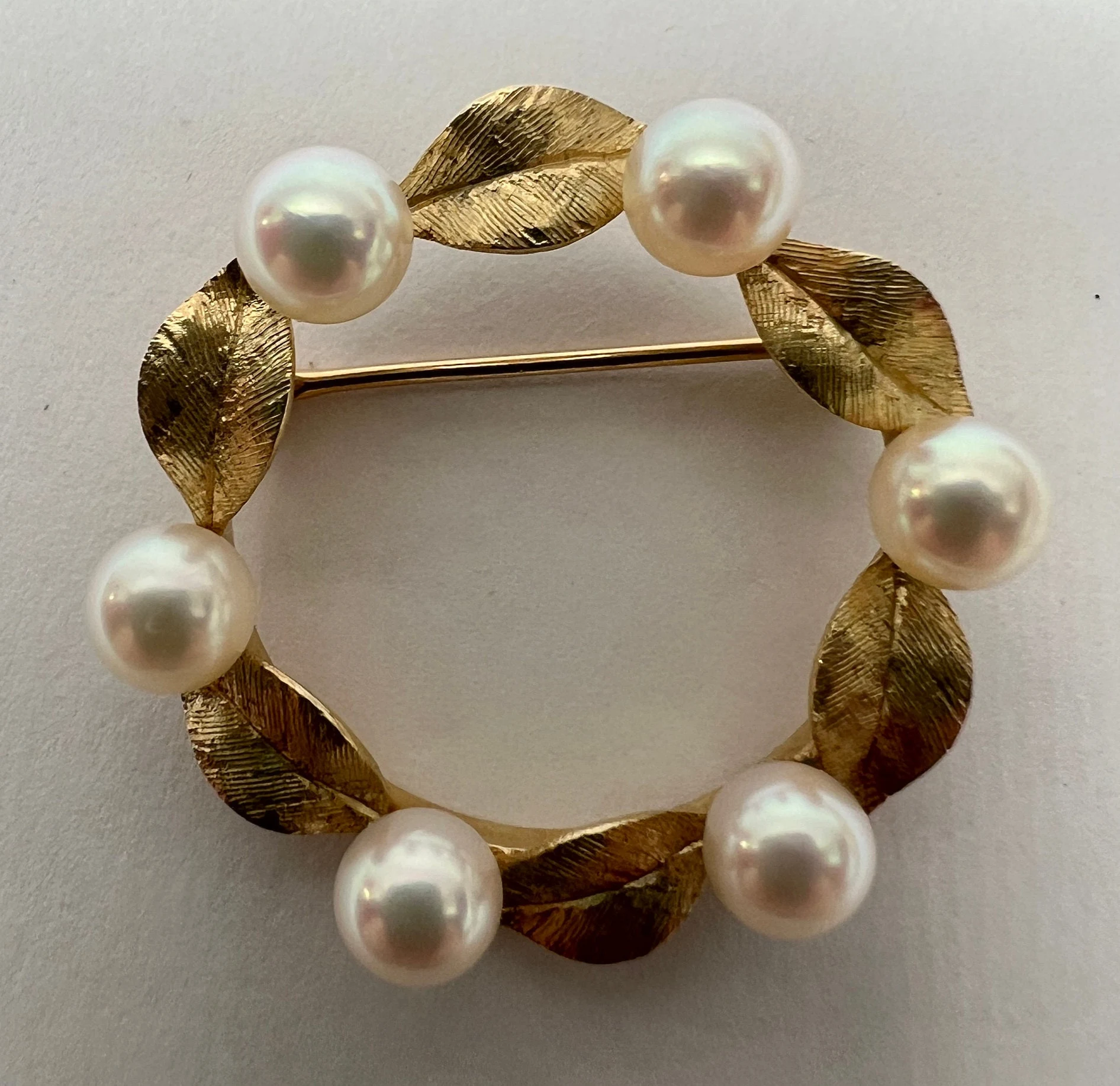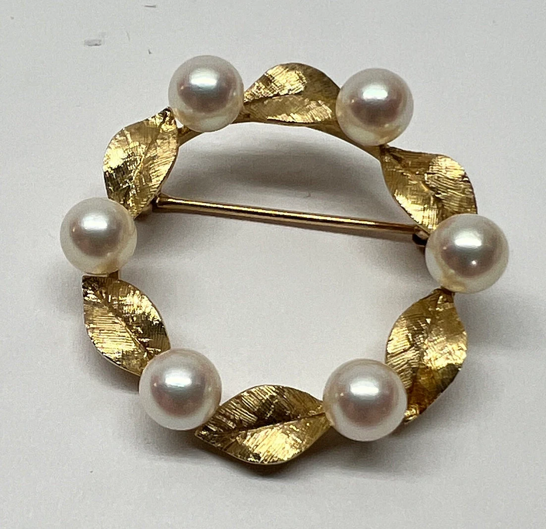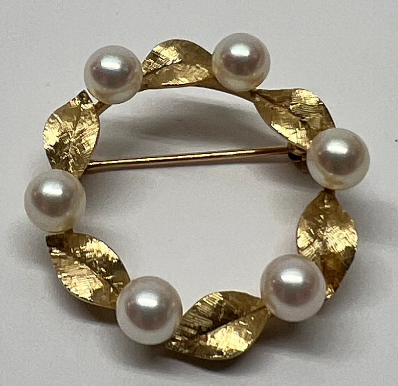 This dainty brooch is a perfect circle of 14k gold leaves alternated with cultured pearls. It’s about 1″ in diameter and weighs a little over 6 grams in total. Momma wore this brooch with scarves or on the lapel of her dress.