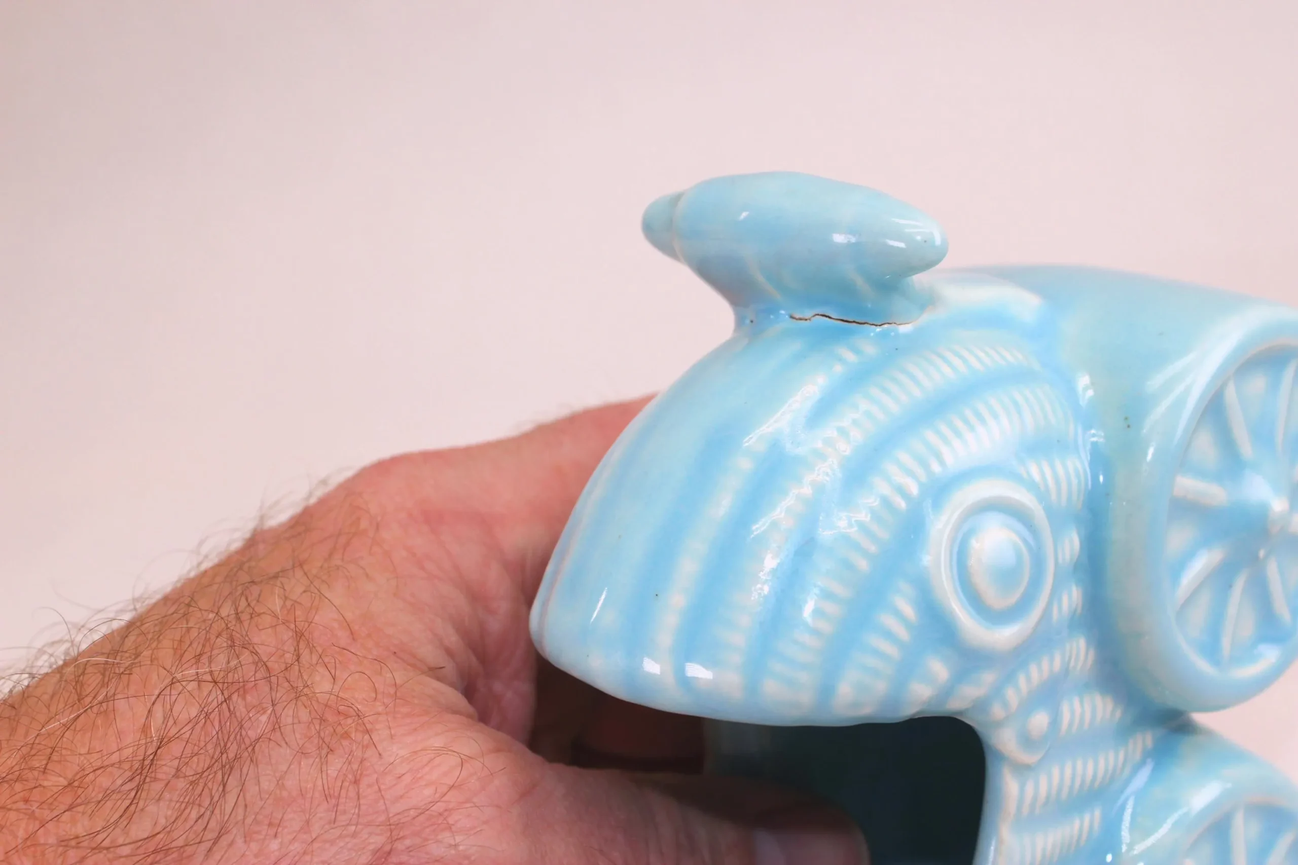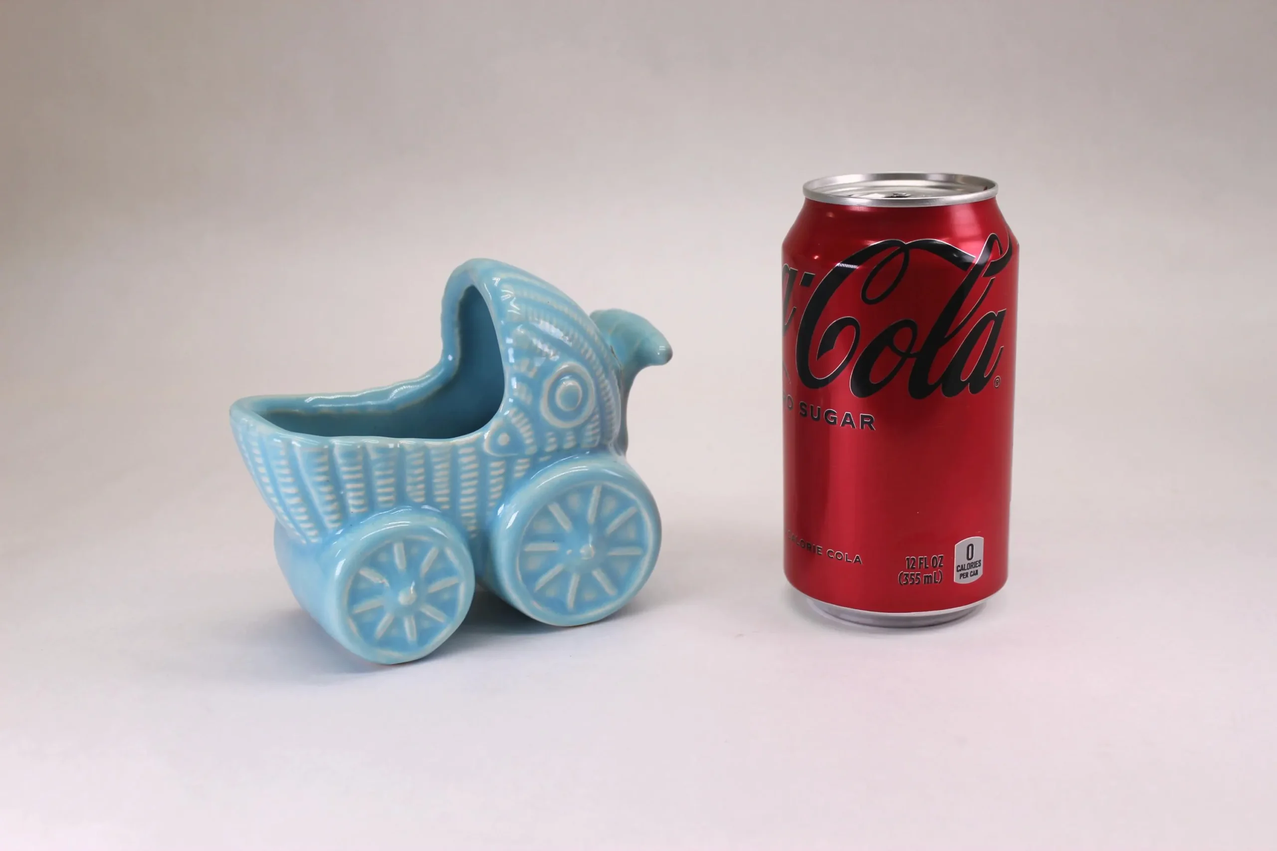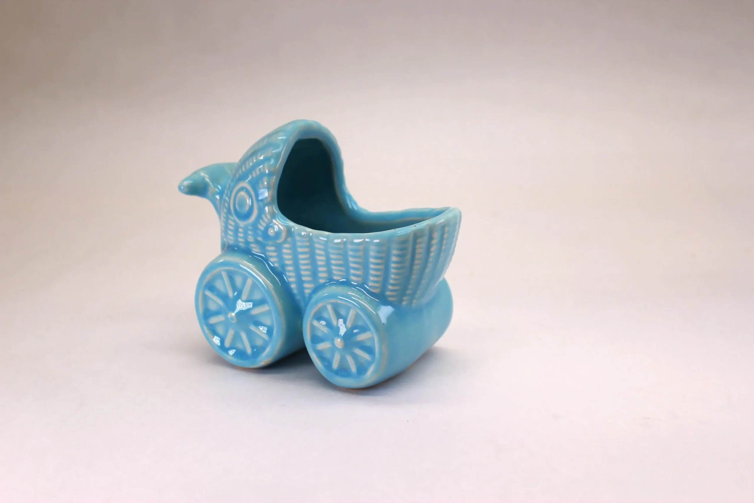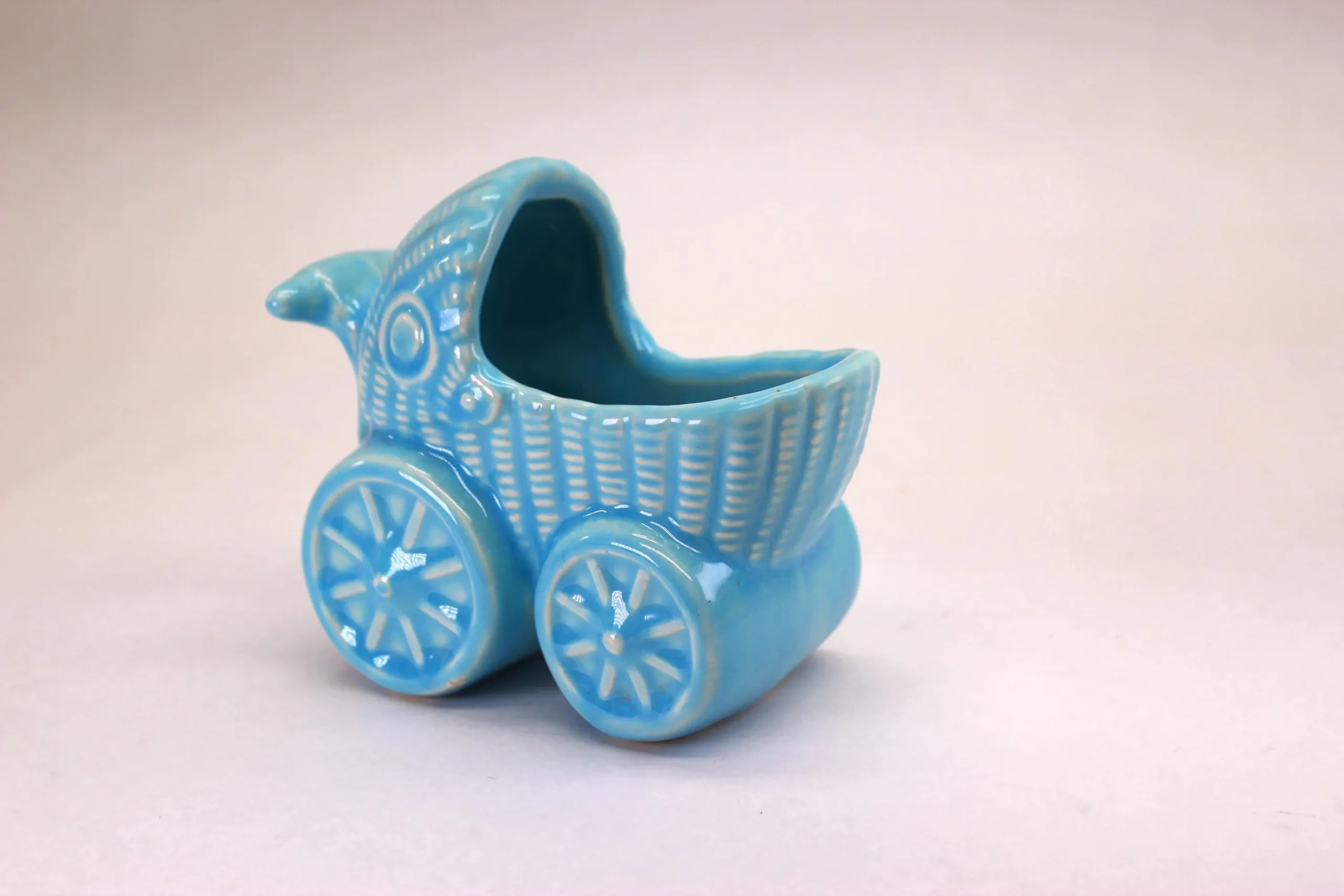 This baby blue beauty feels heavier and denser than others I’ve seen and sold, making me thing it’s made by one of the well-known potteries of the early 1900’s, although it has no labels and marking. It’s about 4″ tall and 5″ long, and would be a sweet welcome for a modern baby! There is a slight void in the glaze where the handle meets the body, but rather than damage I believe it is just a place where the glaze parted in the kiln.