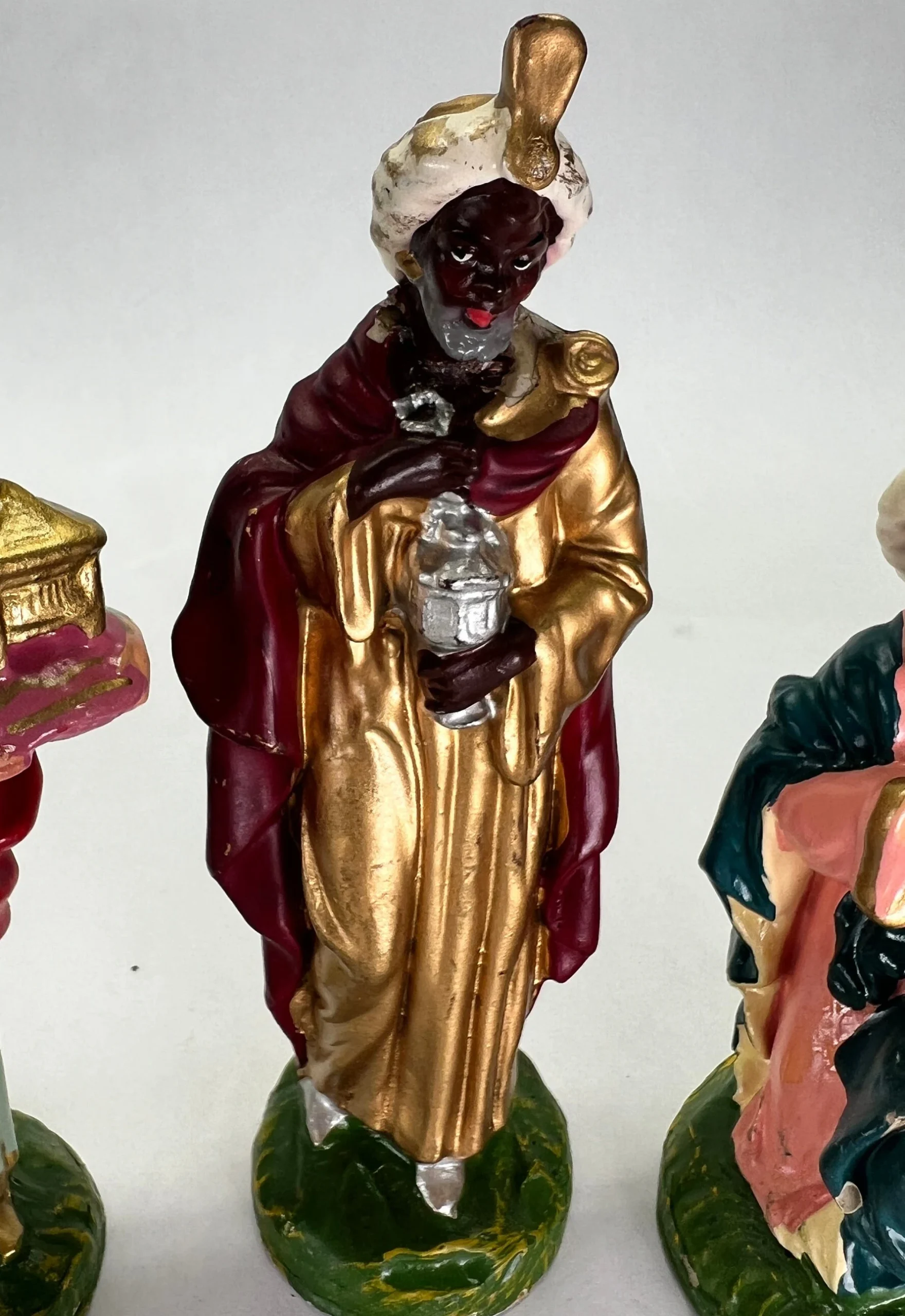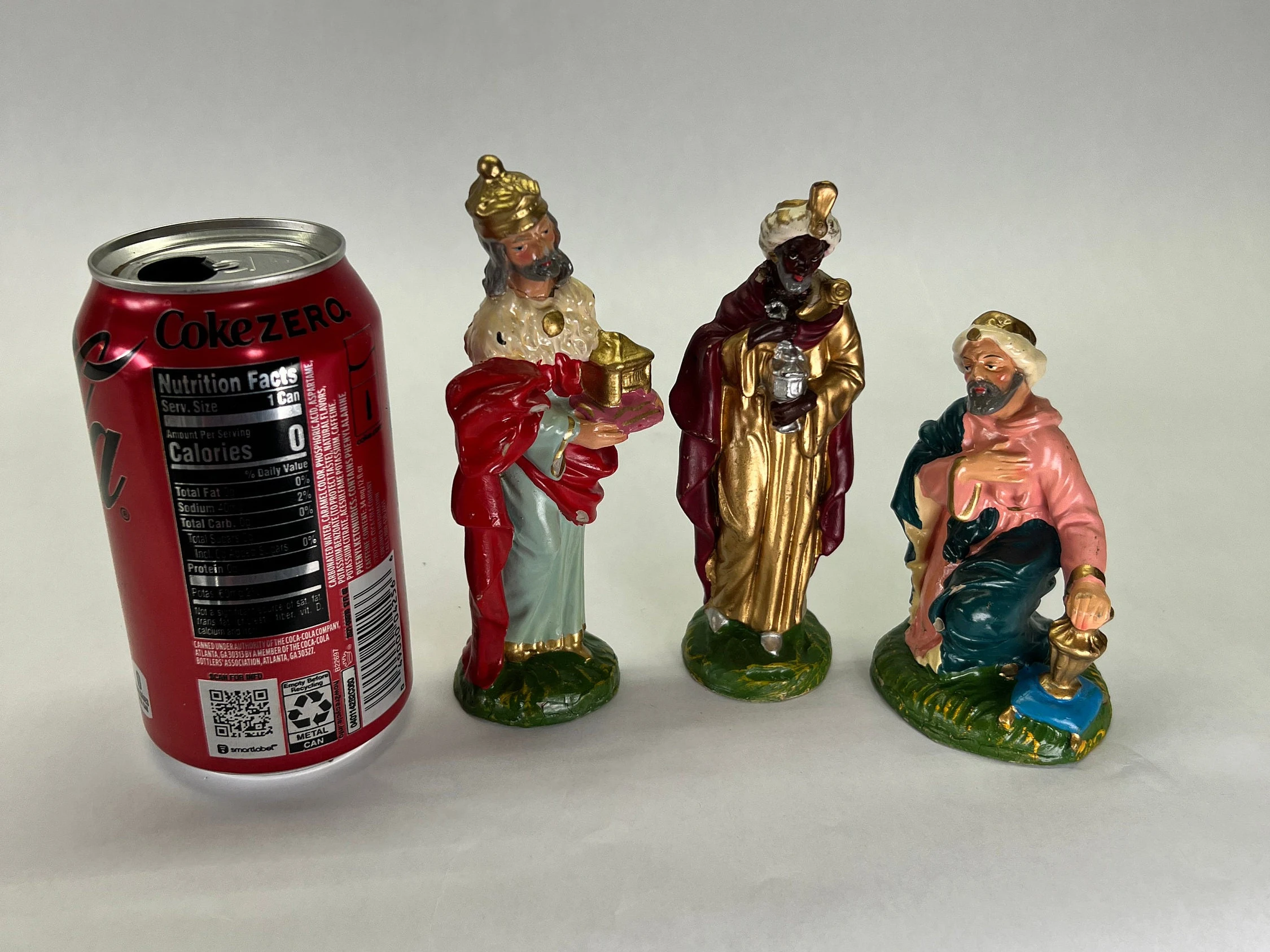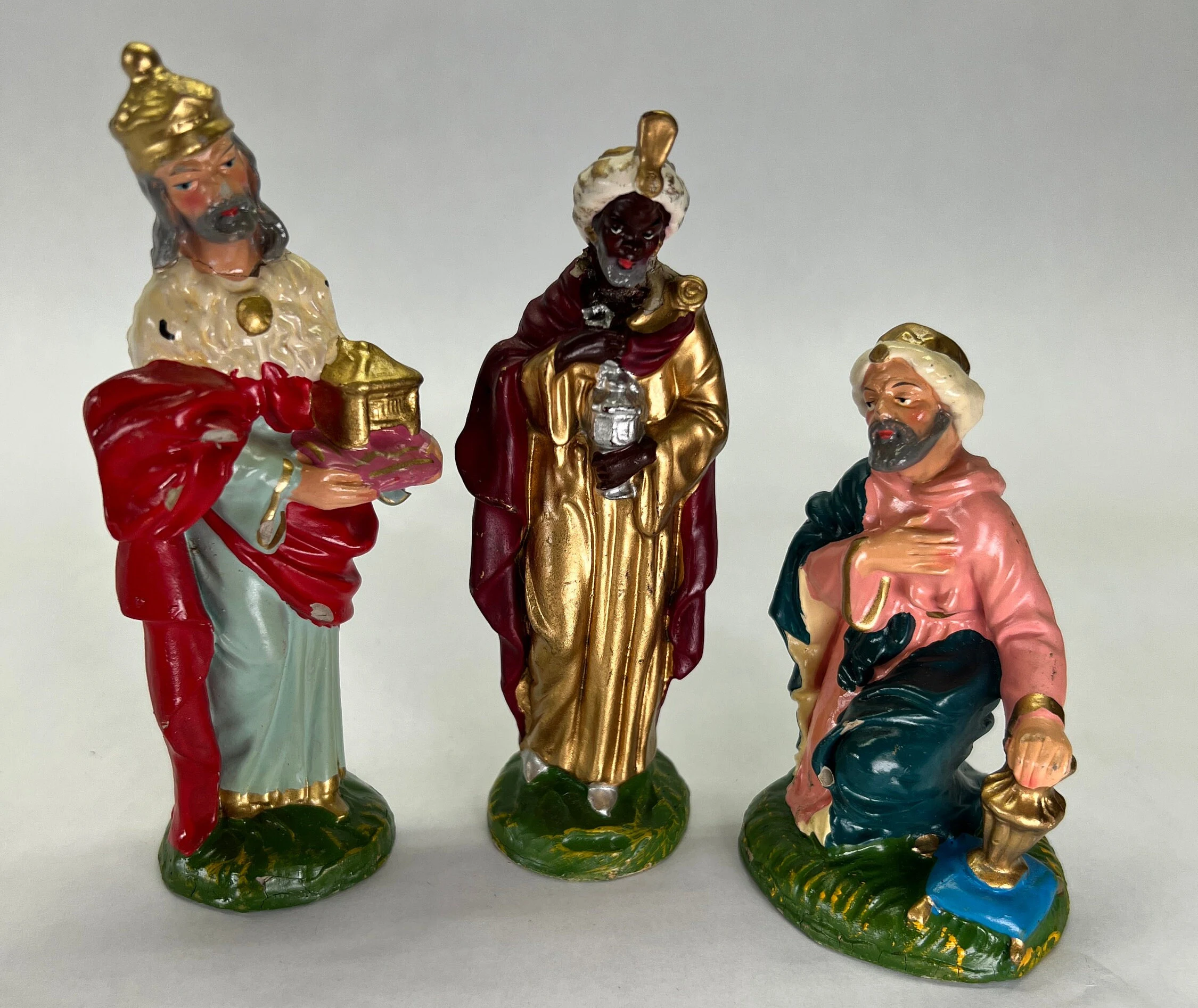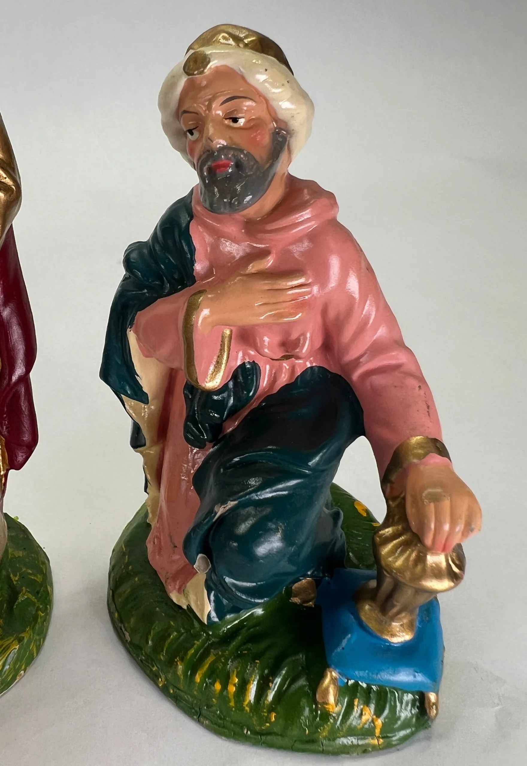 My mother and grandmother bought these Italian chalk ware nativity pieces at the local dime store in our neighborhood- I believe a couple may even still have the price tag! They are made of chalk ware, and as such are very delicate and susceptible to wear and damage. The pieces in my shop are what’s left of both sets, and at least one of each piece has survived except the Blessed Virgin. This trio is in excellent condition, with very few scuffs and abrasions. The 3 Kings are in excellent condition, with the standing Kings at 5.5″ and 6″, and the kneeling King at 4.5″. Free PRIORITY Shipping included at this price!
