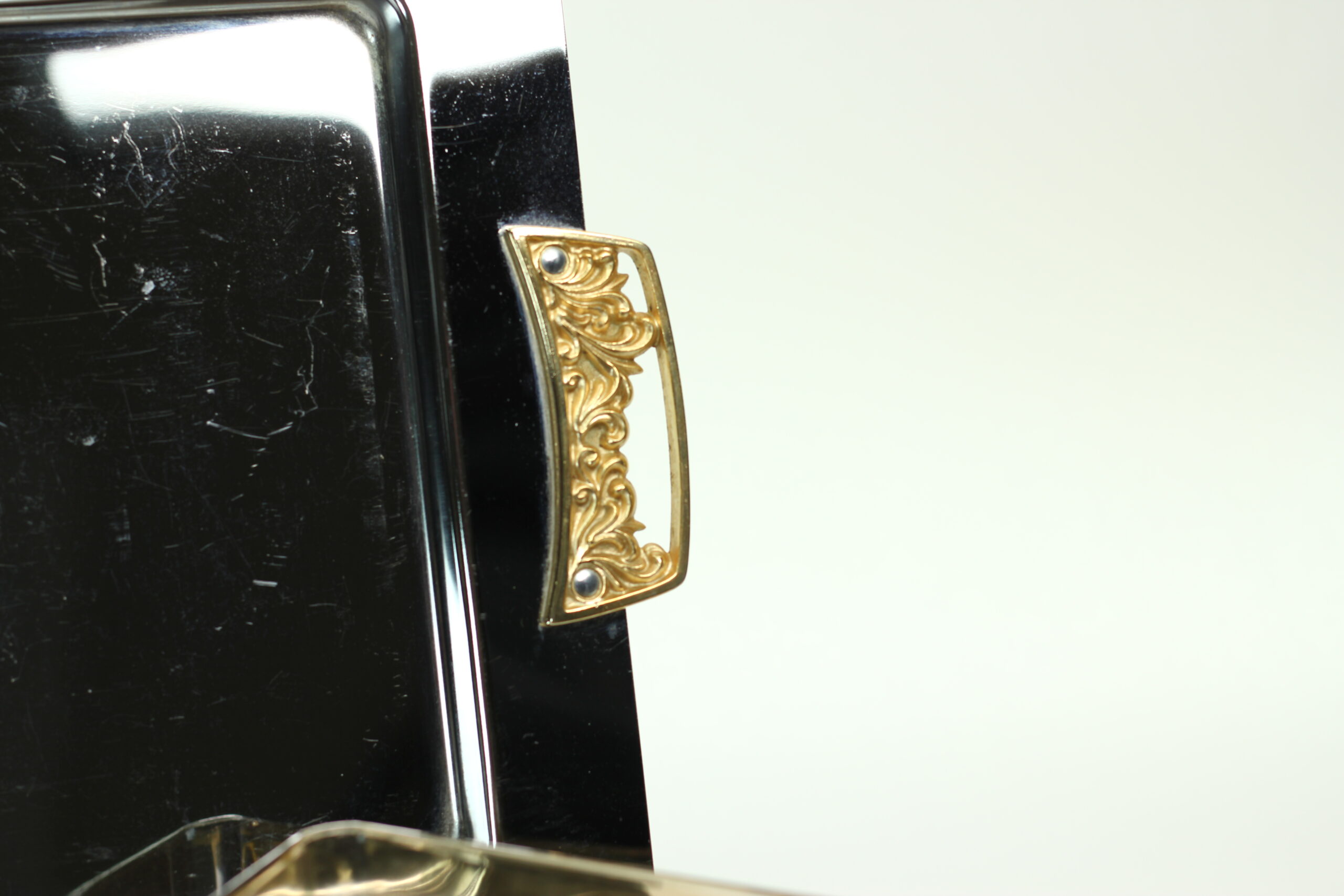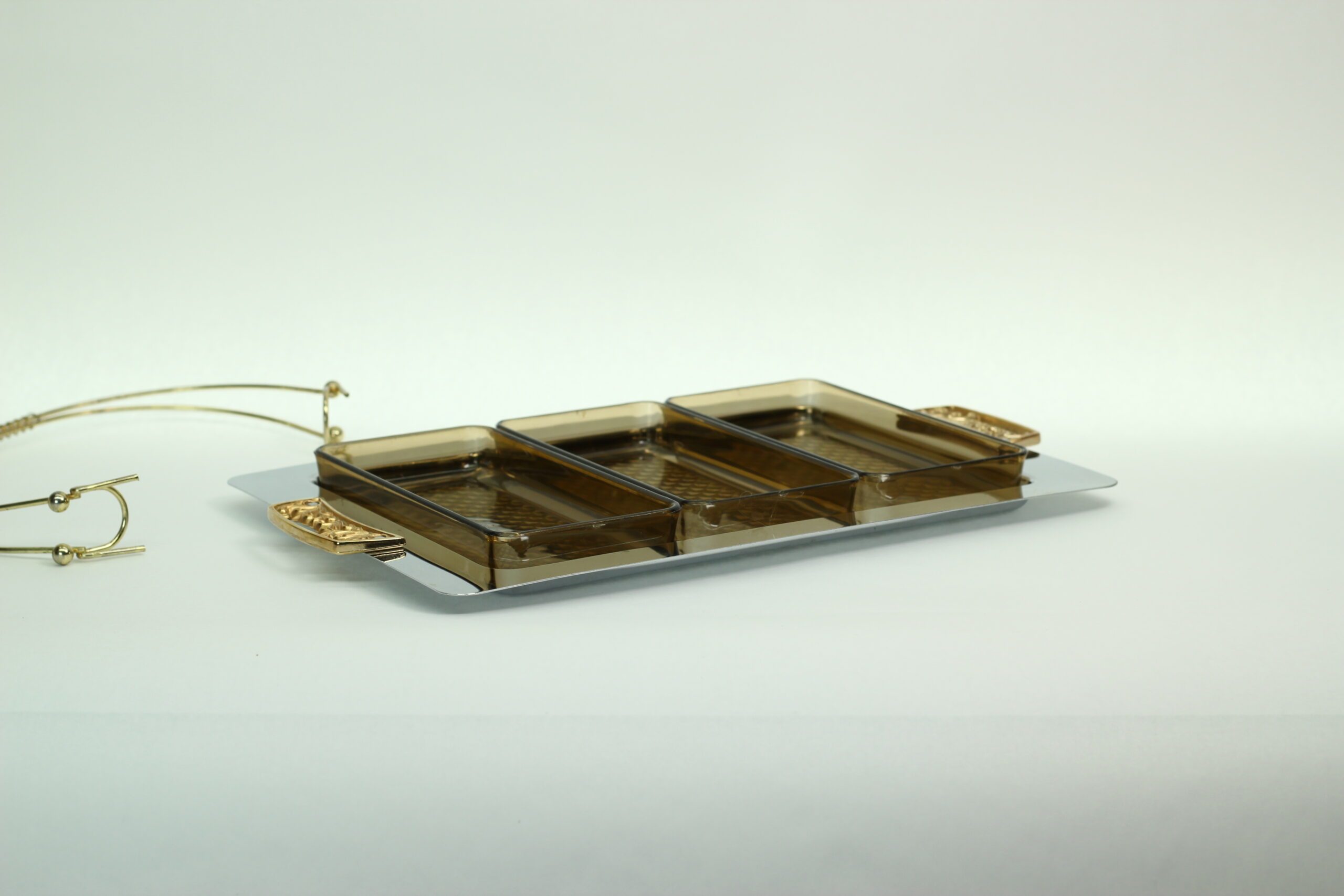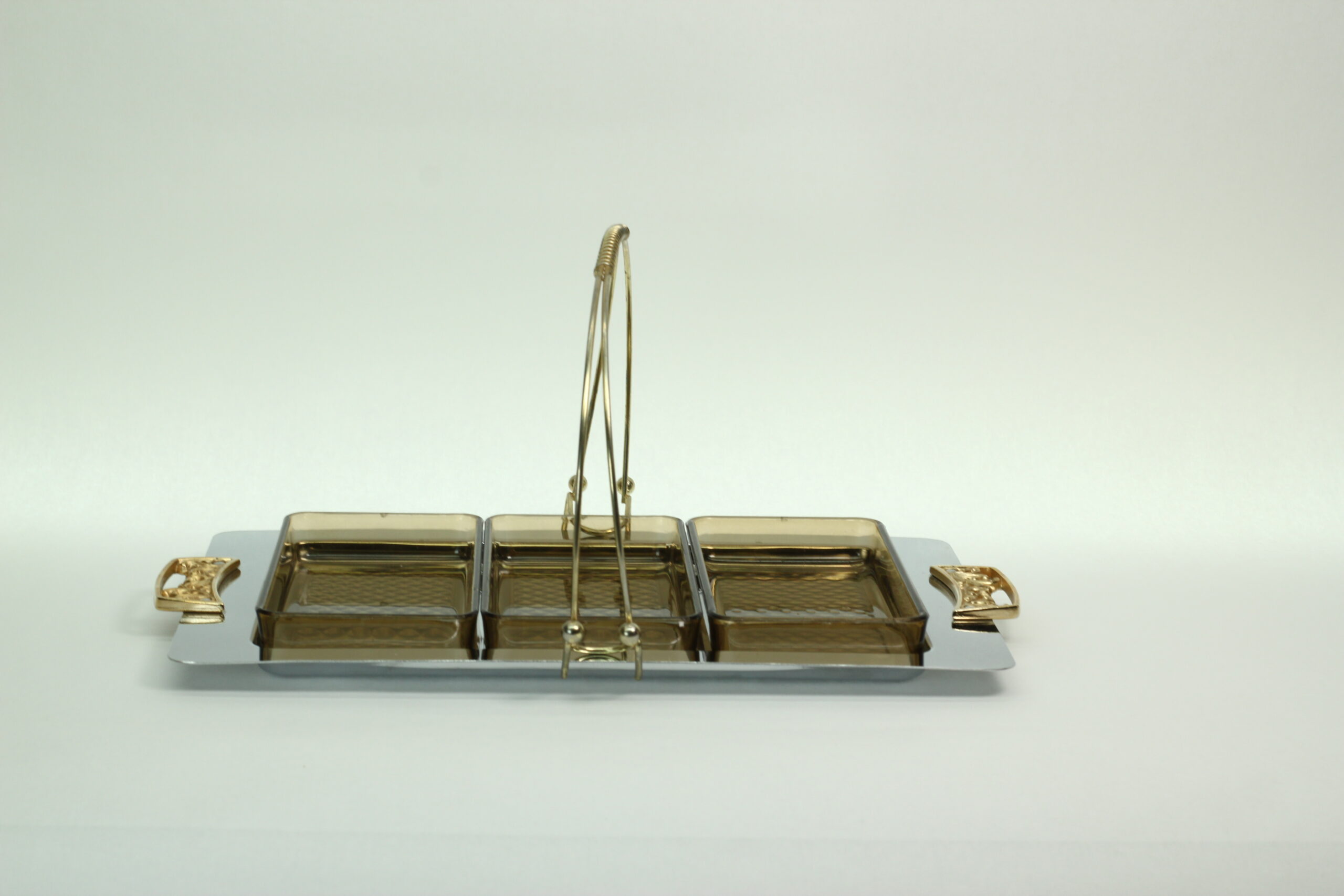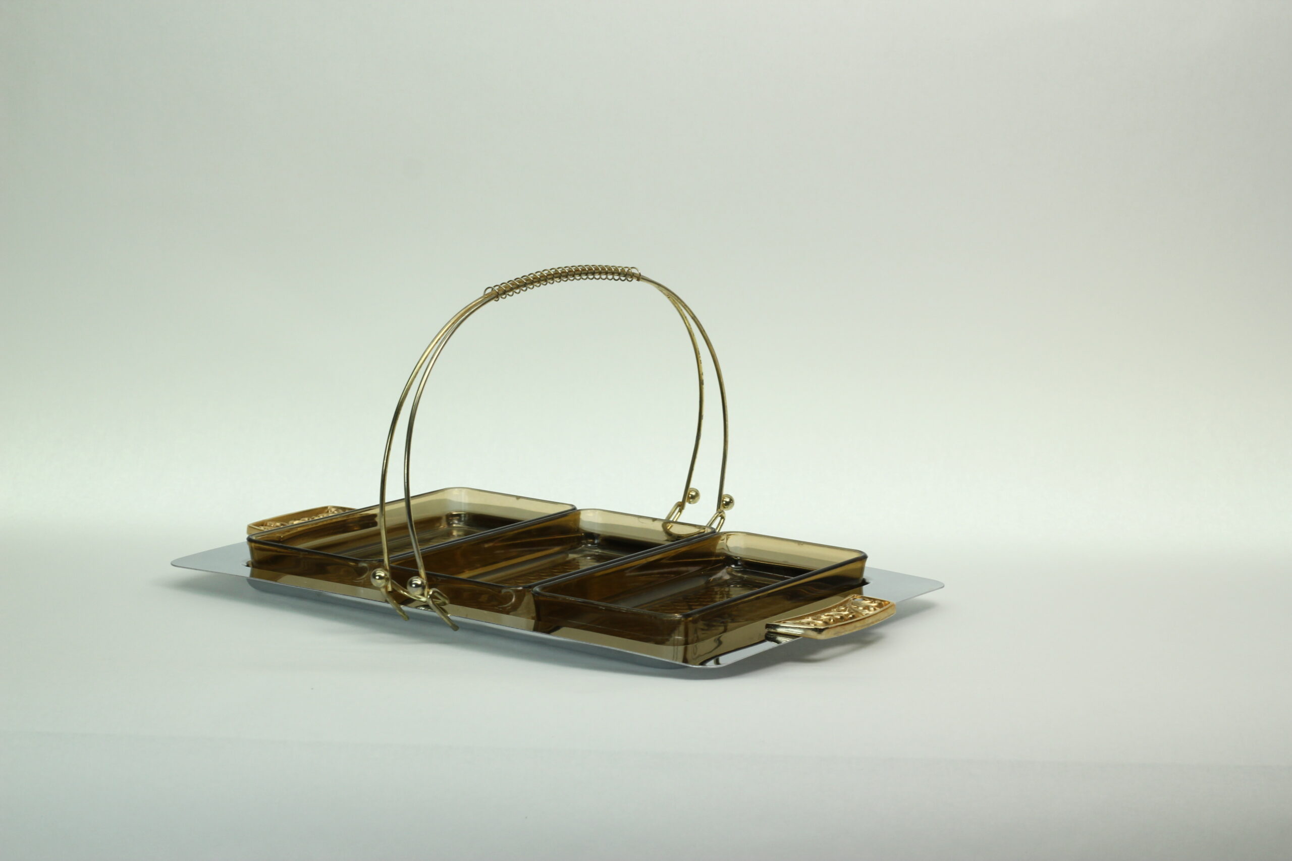 This fabulous vintage canapé server includes three smoked amber plastic insert dishes, a sleek chrome serving tray with gold-tone handles, and a removable carry handle for effortless “hostess-style” serving. It’s practical, portable, and undeniably groovy.