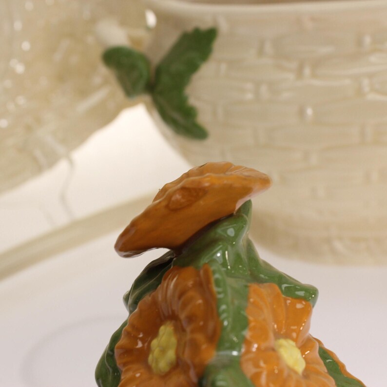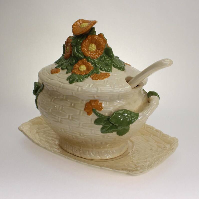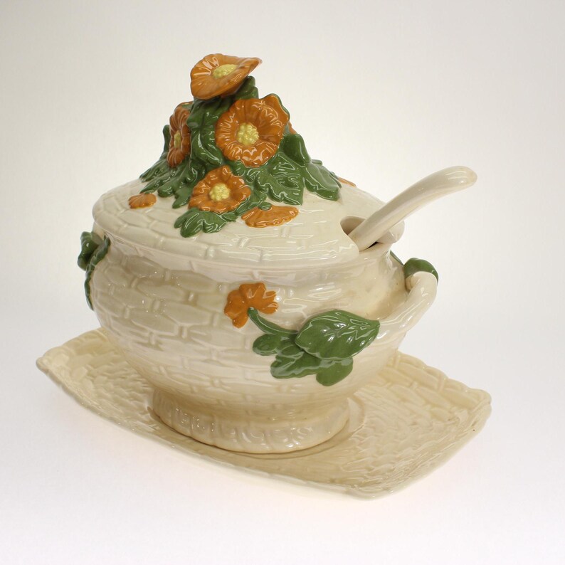 🌼 Straight from the ’70s — This cheerful soup tureen radiates retro vibes, from its tangerine-and-green color palette to the “Minnie Pearl” bouquet of daisies perched atop the basketweave lid.