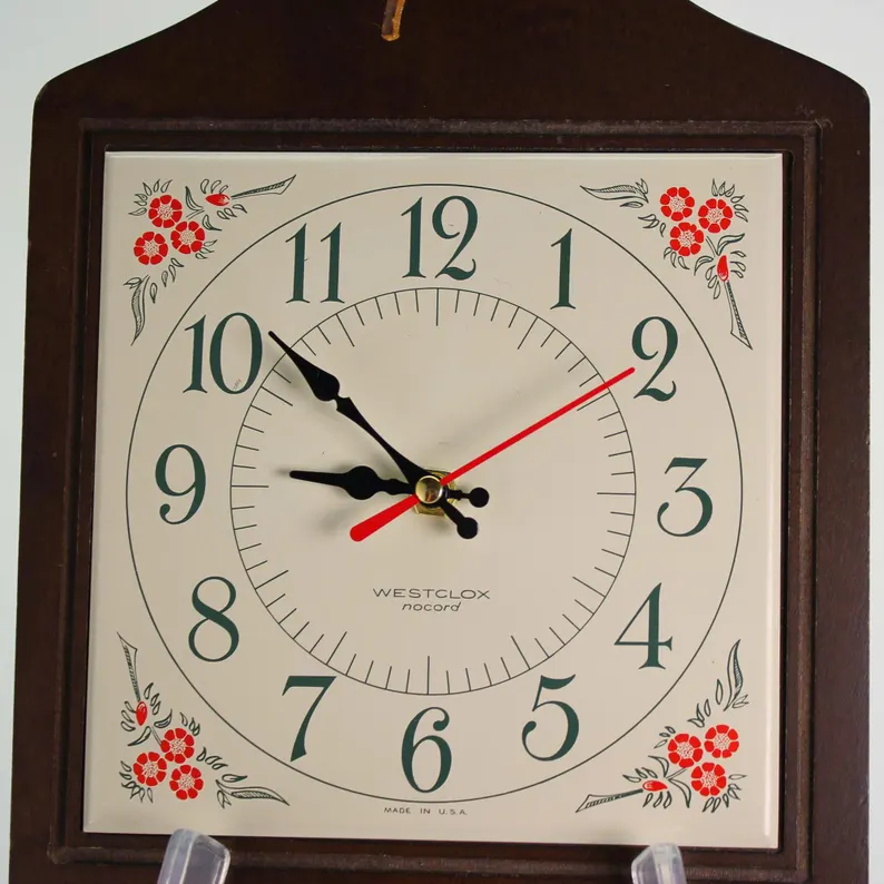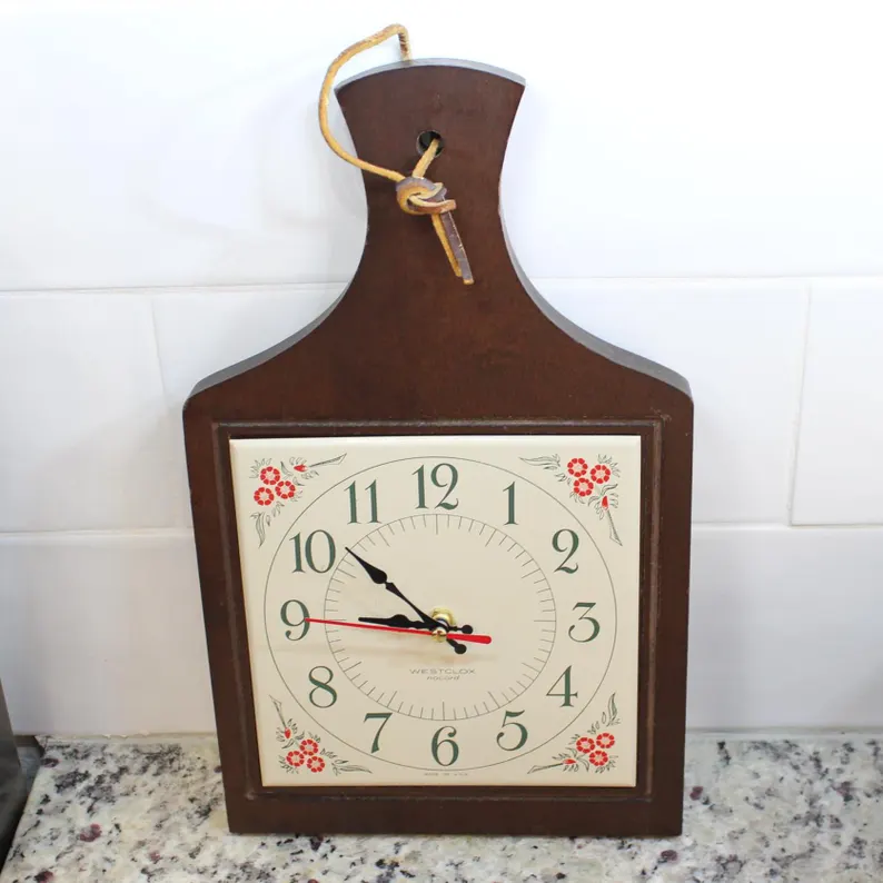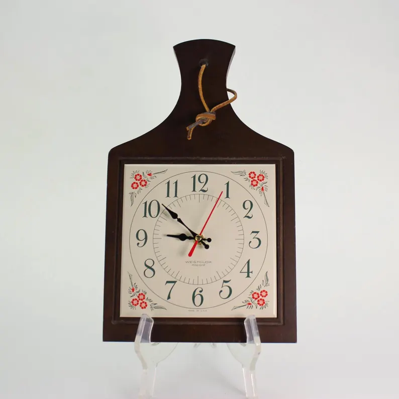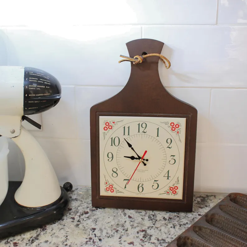 ⏰ Keep time with a little retro flair! This 1970s Westclox wall clock features a cutting board shape with floral corner accents and bold black numerals — a nostalgic kitchen essential from the golden age of avocado green and burnt orange.