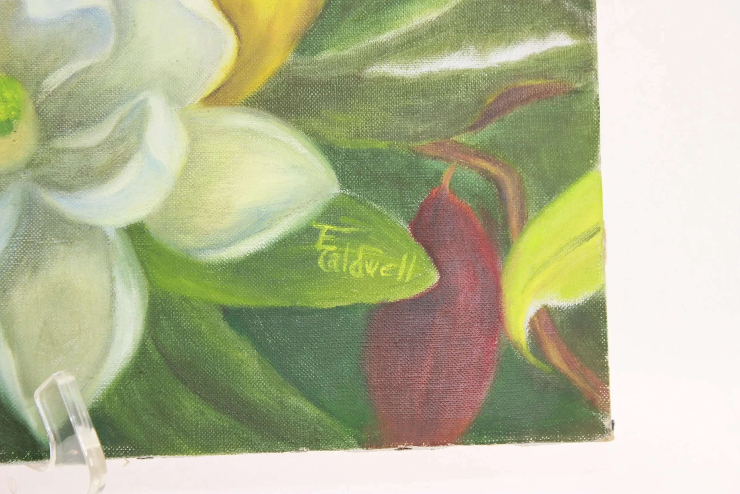 The colors are vivid, but not garish, and the flowers are excellent renditions, IMHO. The canvas is in excellent condition, and measures 16x 19. I’m pretty sure the medium is acrylic, but I’m not 100% sure of that.