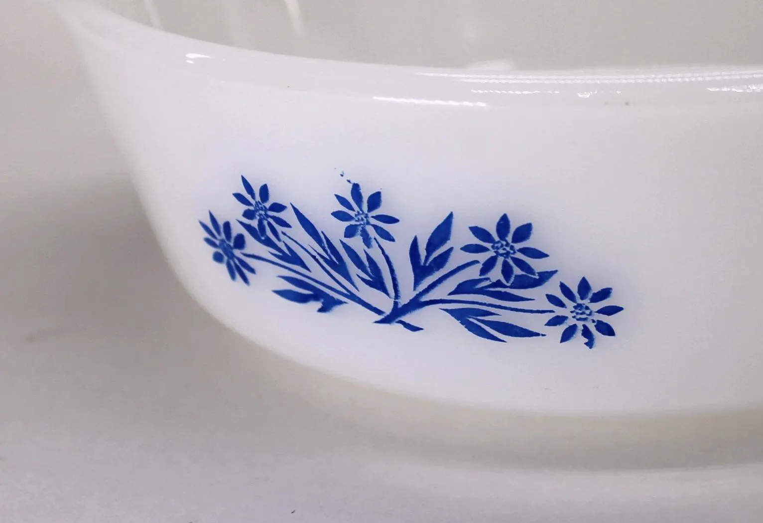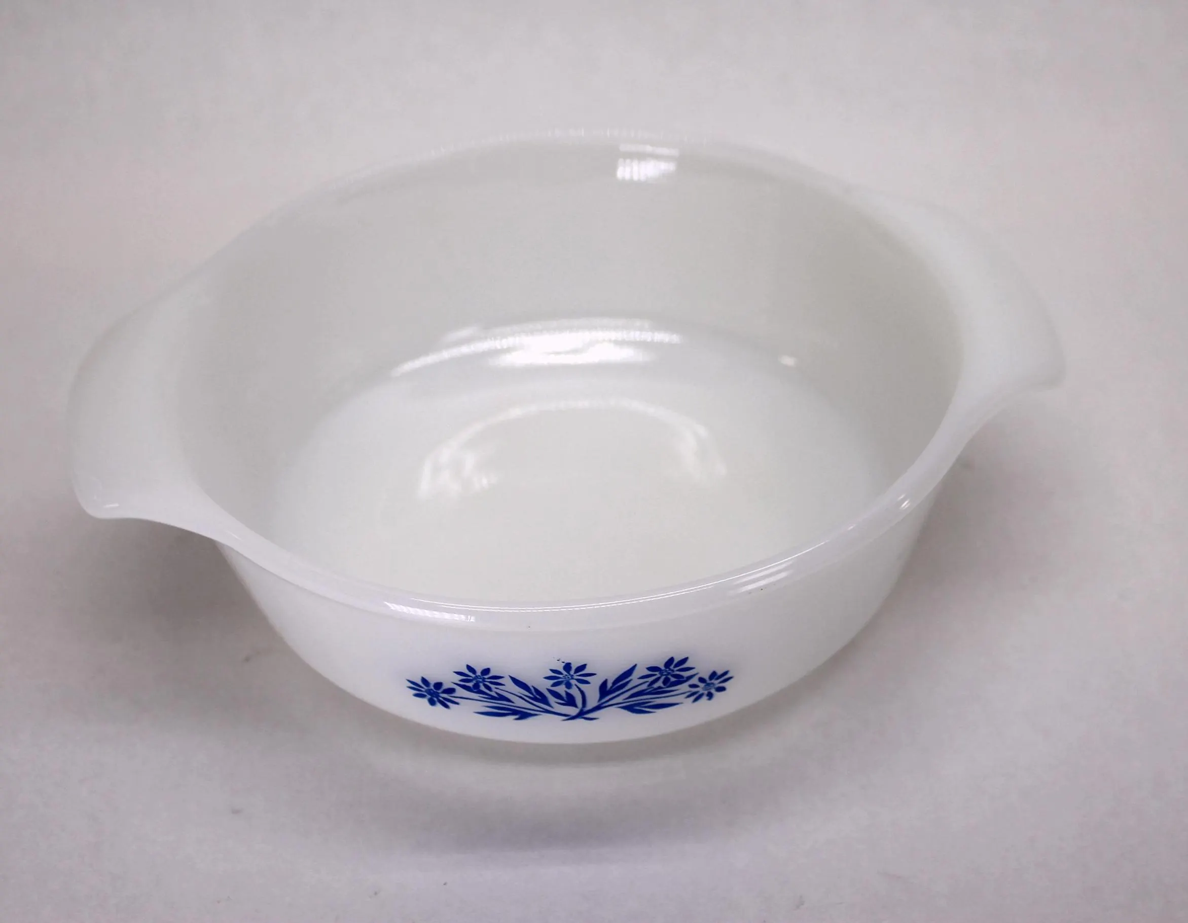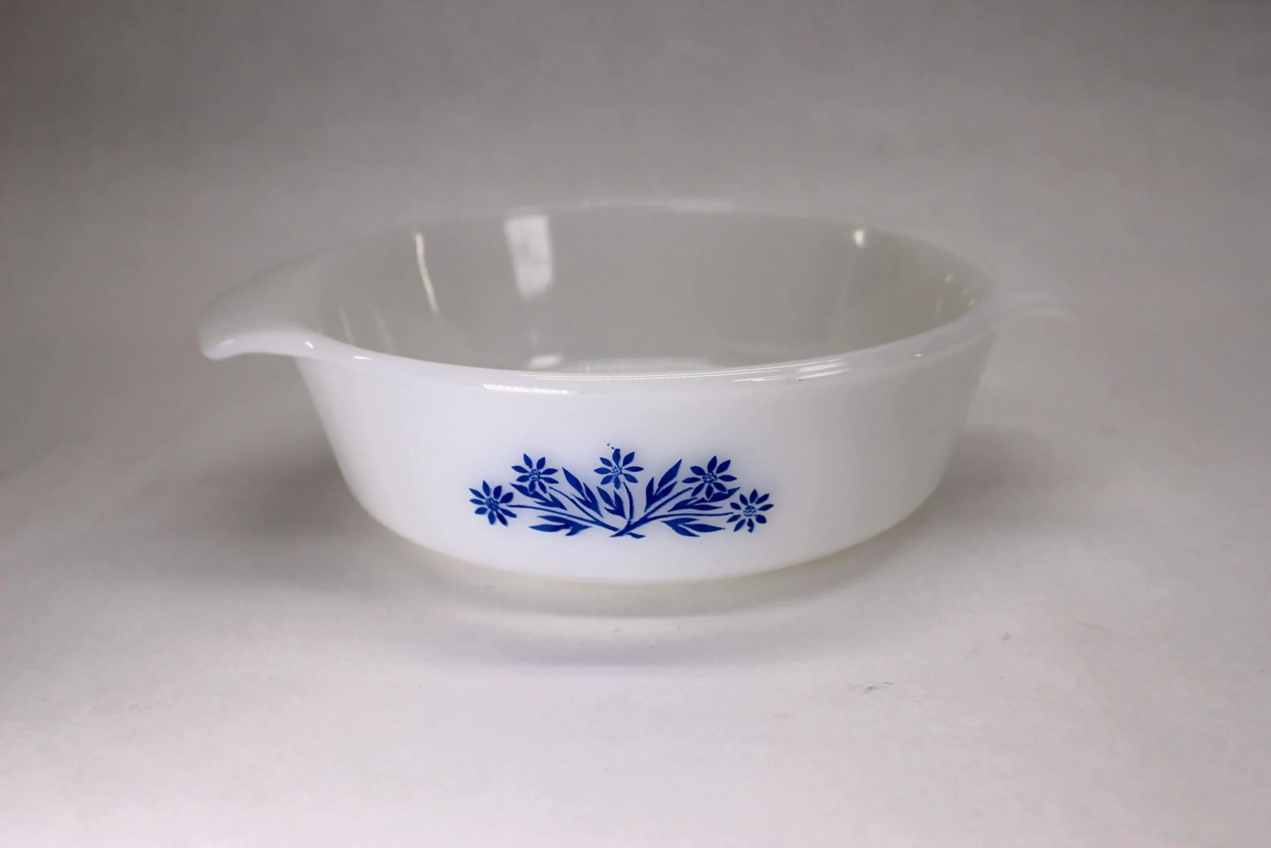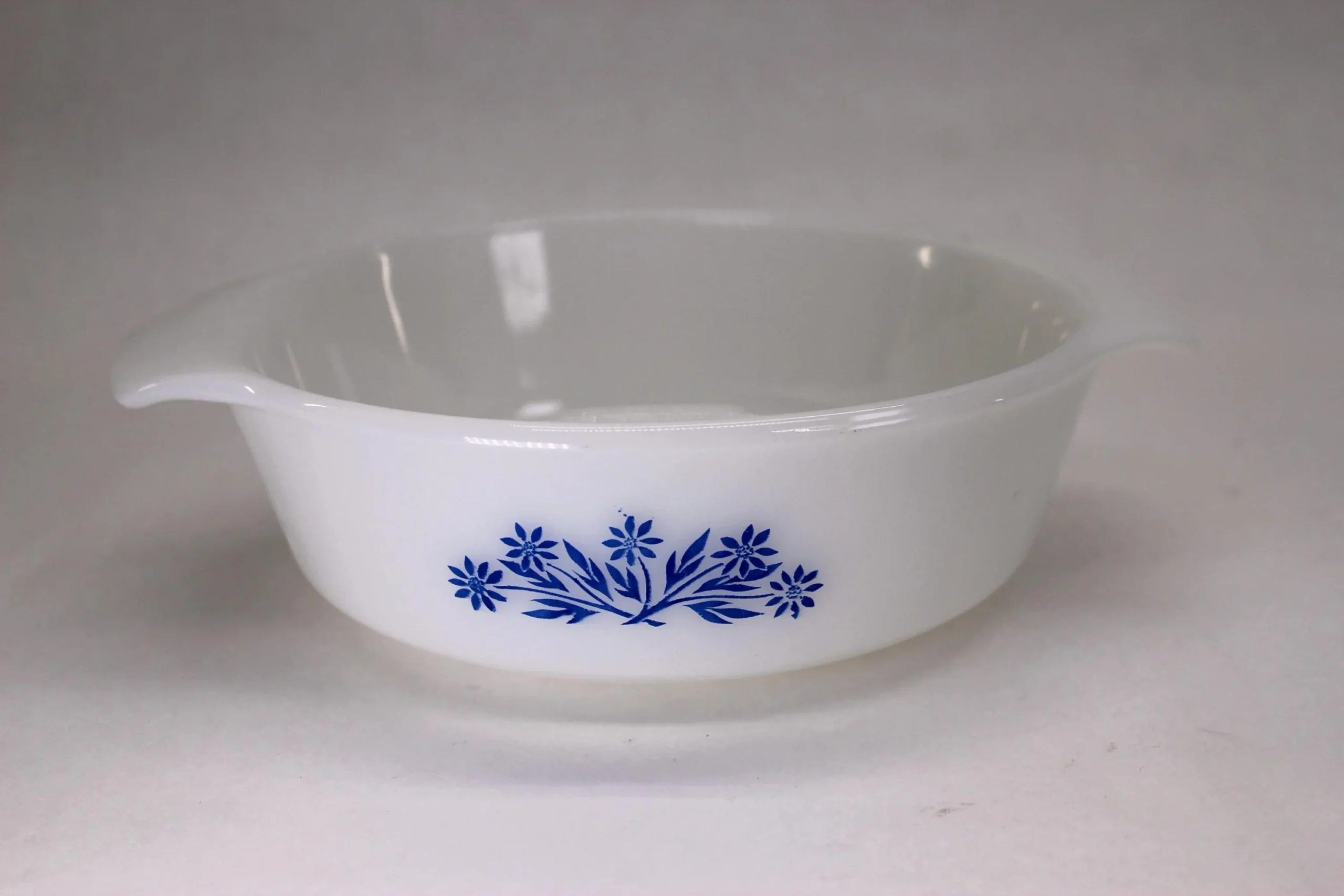 In response to the 1950’s market for Corning’s Pyrex, Anchor Hocking brought their FireKing product to the market. I’m guessing by this time, Corning had patented and produced their Pyroceramic product, leaving Anchor Hocking in a race to catch up. Here, it seems they pretty blatantly knocked off Corning’s Blue Cornflower design, with enough changes to avoid lawsuits.