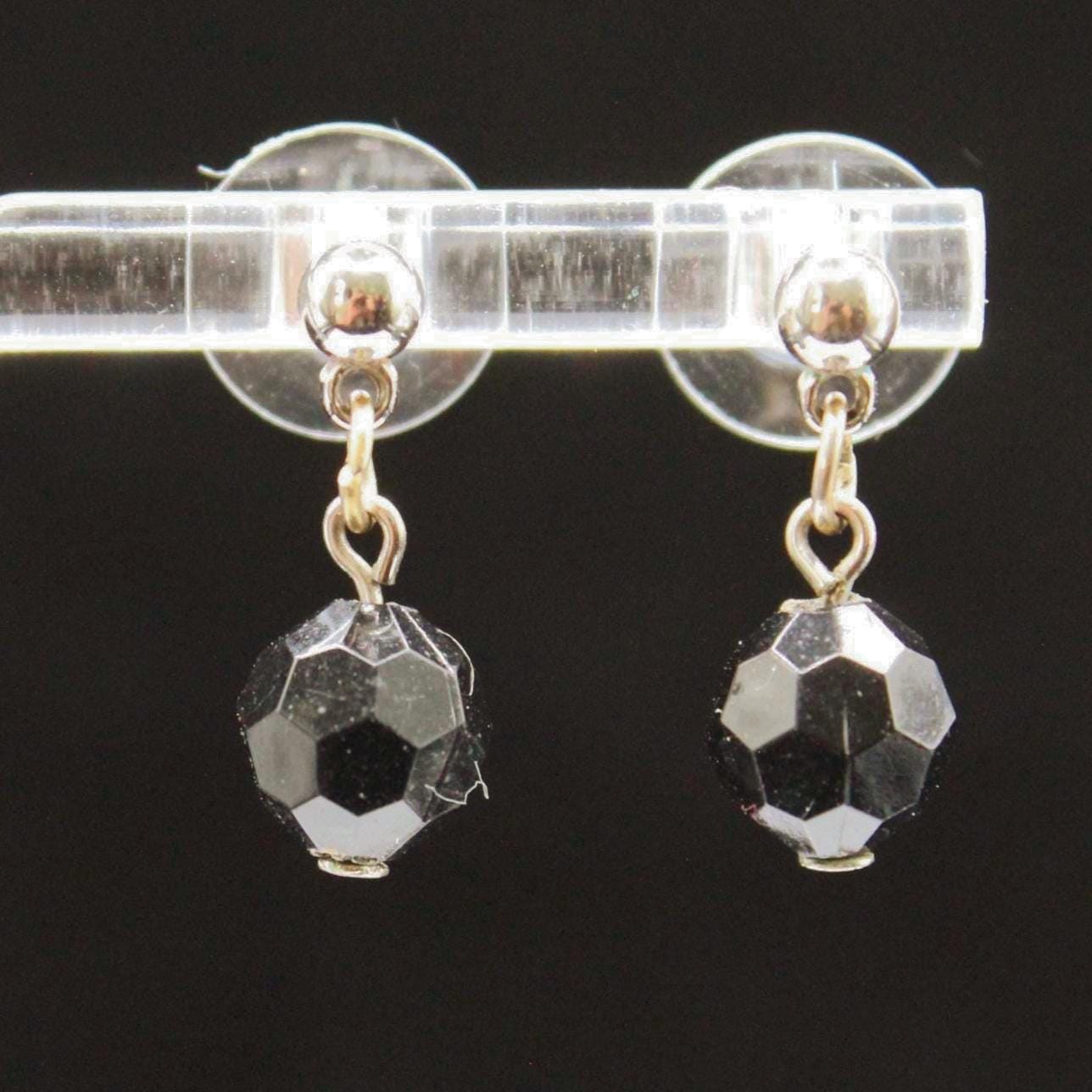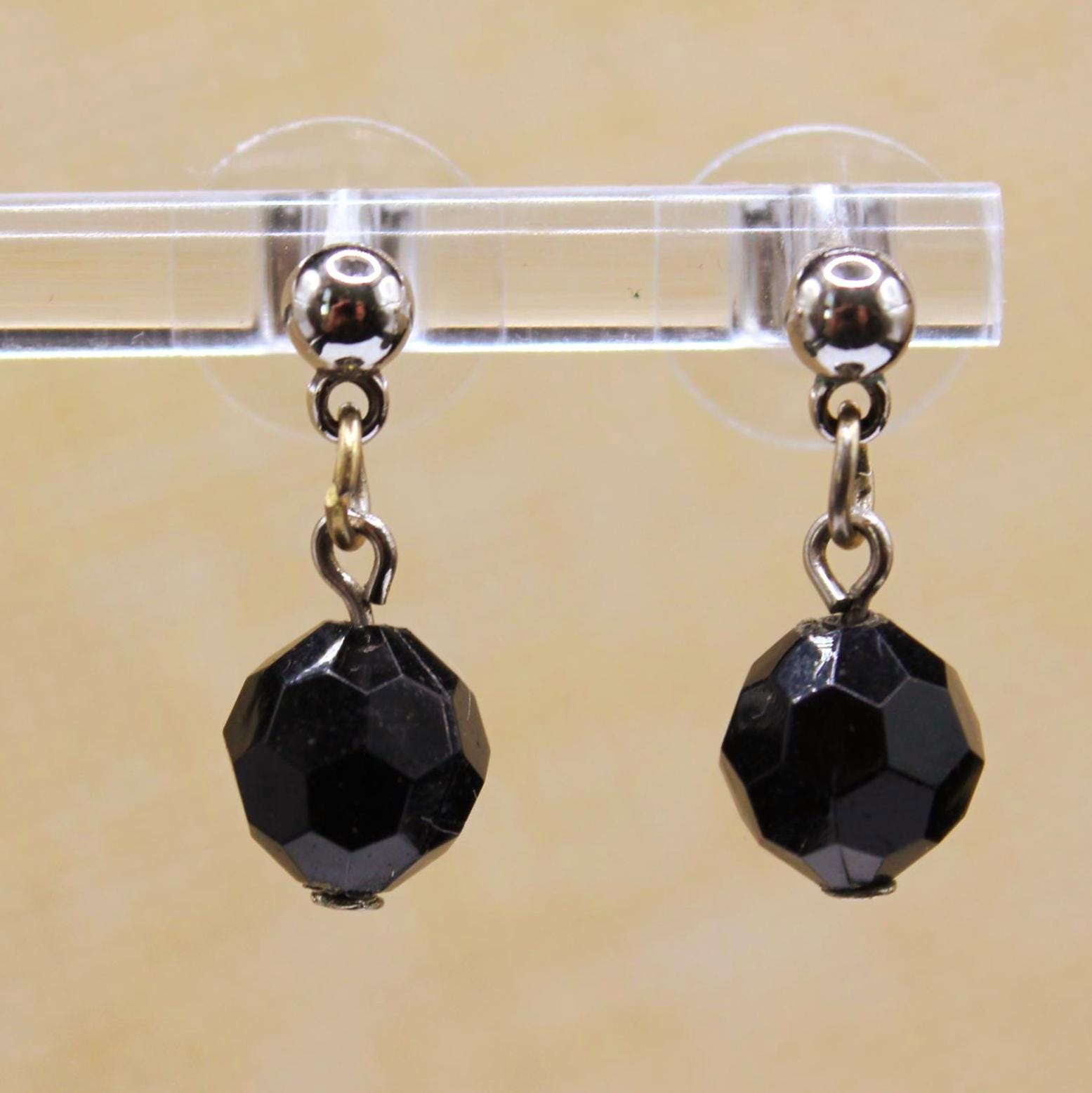 🖤 These vintage black bead earrings bring the perfect touch of mid-century drama. Each one features a faceted plastic bead with a jet-like sheen, dangling from a silver-tone ball post. Lightweight yet bold, they swing gently and catch the light with every turn.
