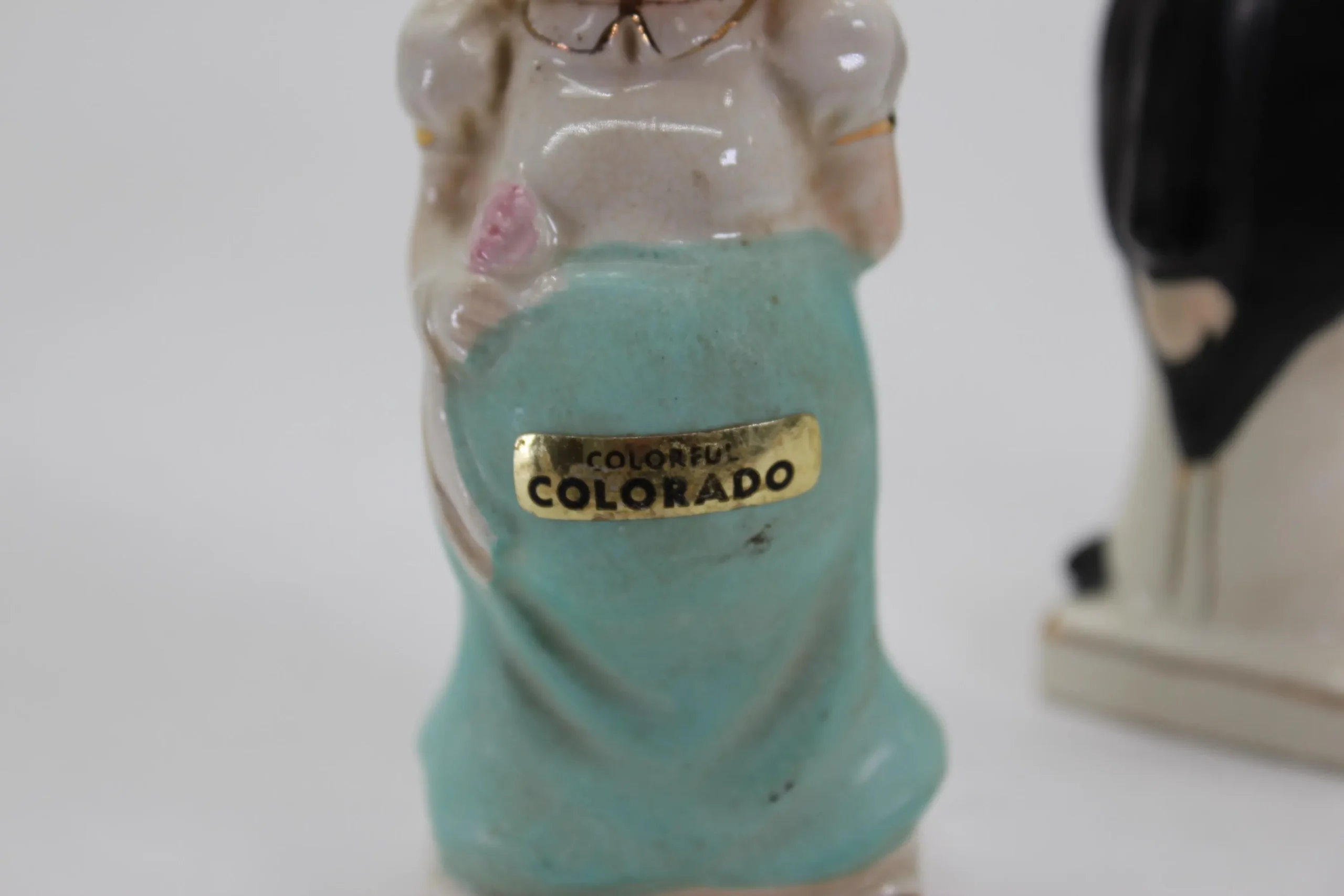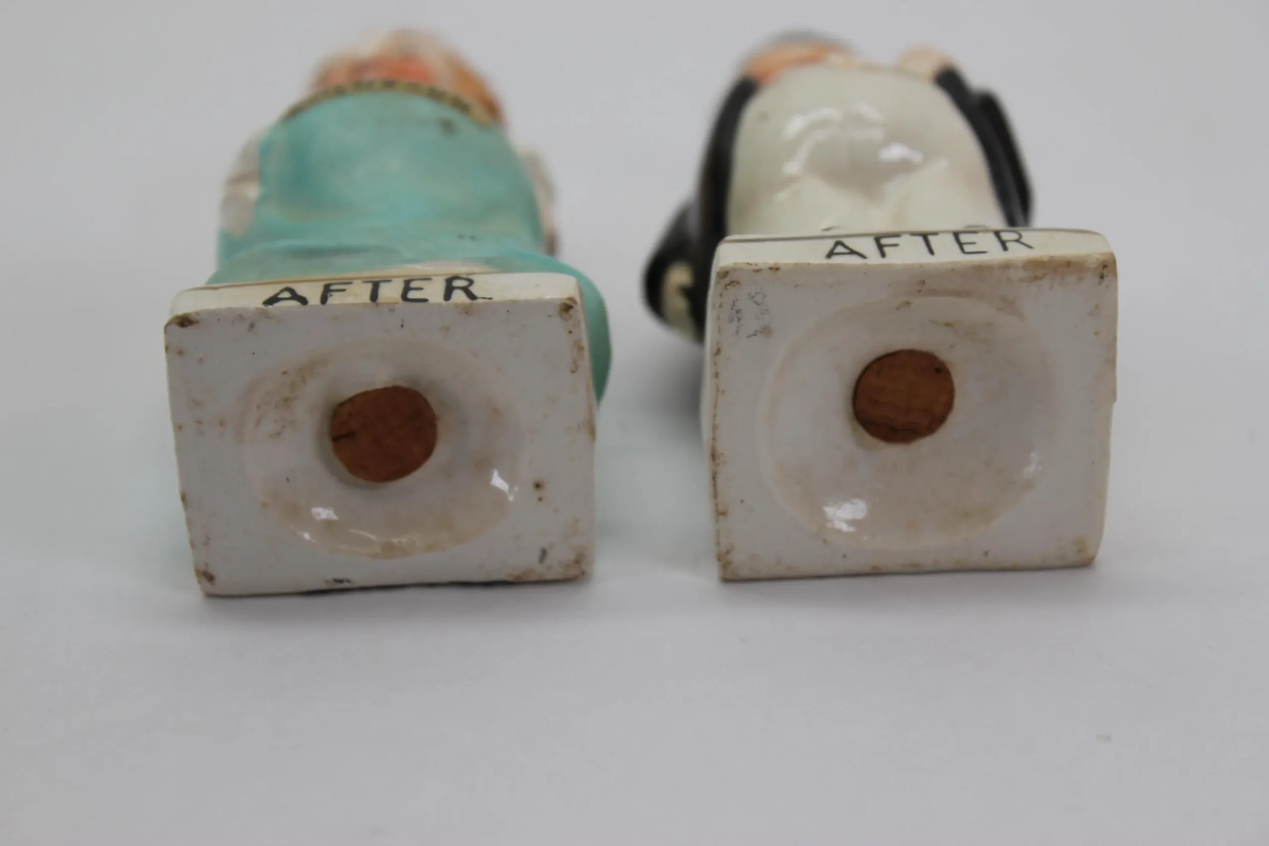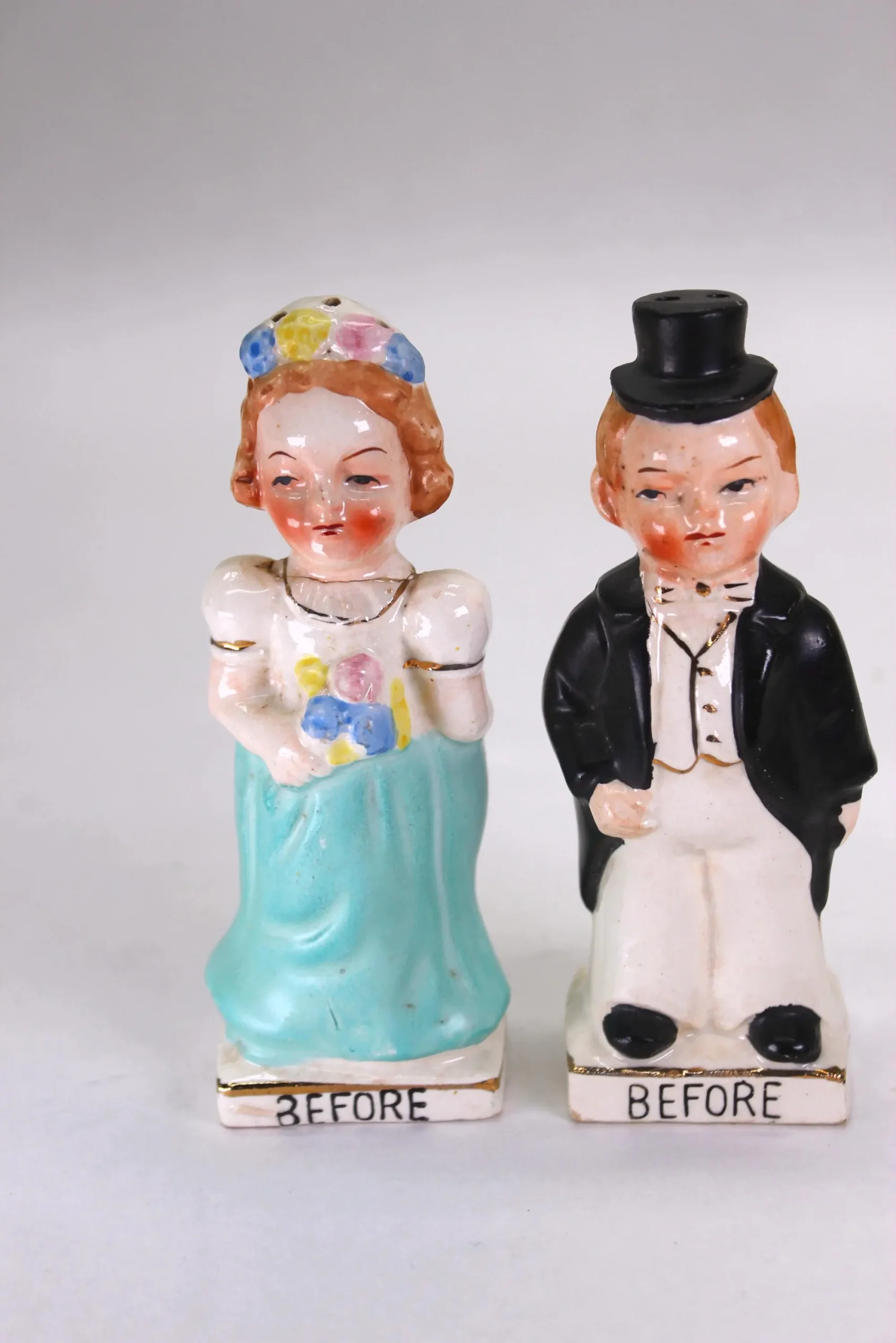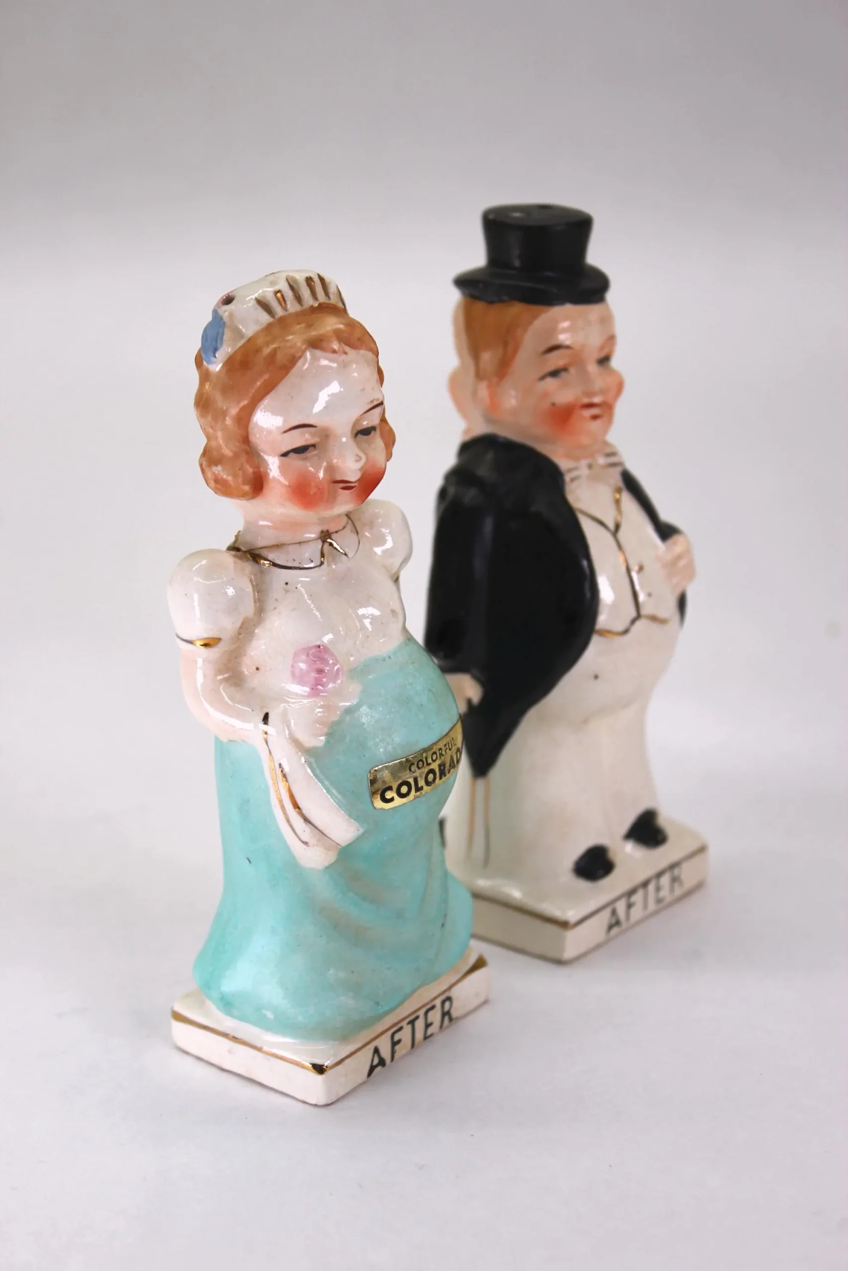 Harkening back to a simpler time when television wasn’t allowed to depict pregnancy on air, this salt and pepper set would have no doubt been considered quite ribald! The “Before” shows a bride and groom of the era on their big day, then reverses to an ever “After” of society-dictated roles- she has become round with child, and he has become round from the delicious meals she dutifully prepared. If you can’t stomach the mysogony- just add a dash of salt and pepper! They stand 4-3/4″ tall, and her expectant belly has a sticker that says “Colorful Colorado.” There are no bottom marking, and the cork stoppers are still intact. There is an ancient repair where her head was neatly glued back on, and it seems to remain firmly intact.