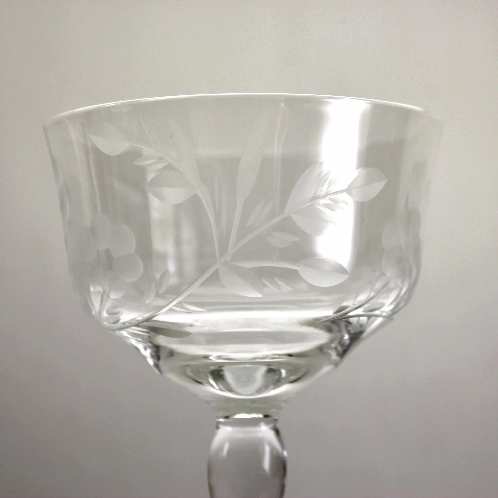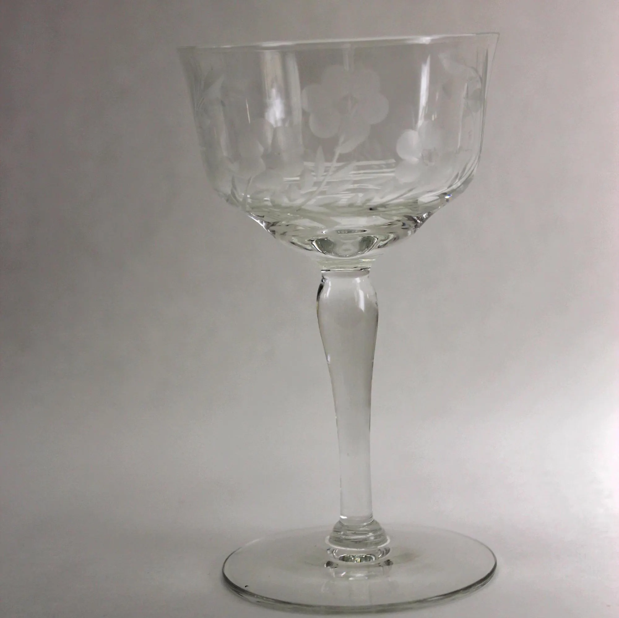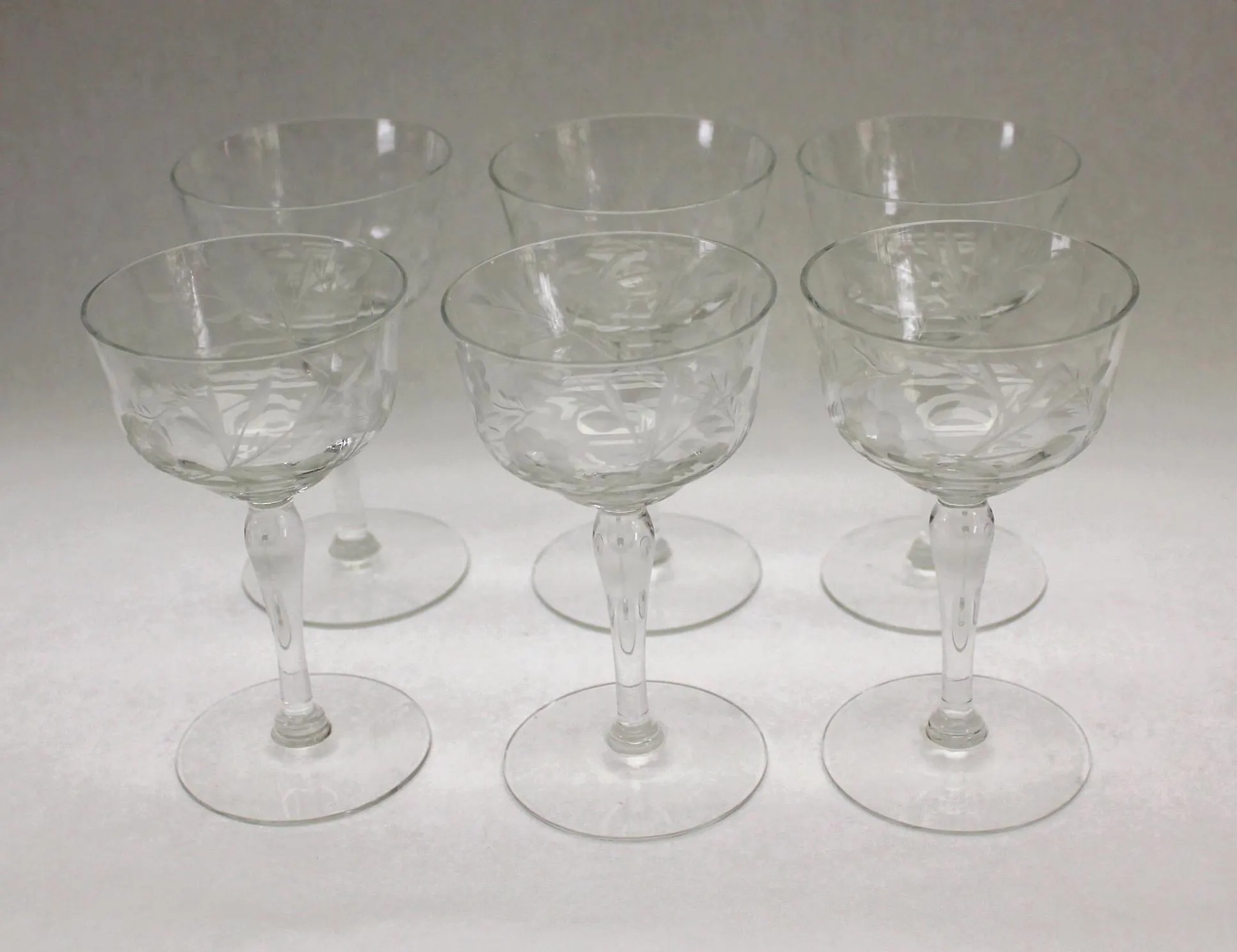 Rock Sharpe crystal was manufactured from the 1930s to the 1940s. The Rock Sharpe company was founded in 1914 by Alfred H. Sharpe in Buffalo, New York. The company didn’t make its own glass, but instead decorated and cut crystal from blanks purchased from other companies. Rock Sharpe crystal was known for its high quality and intricate designs, often featuring a fern-like leaf pattern and floral motifs. The stemware was extremely popular in the 1930s and 1940s and was sold in major department stores across the country.