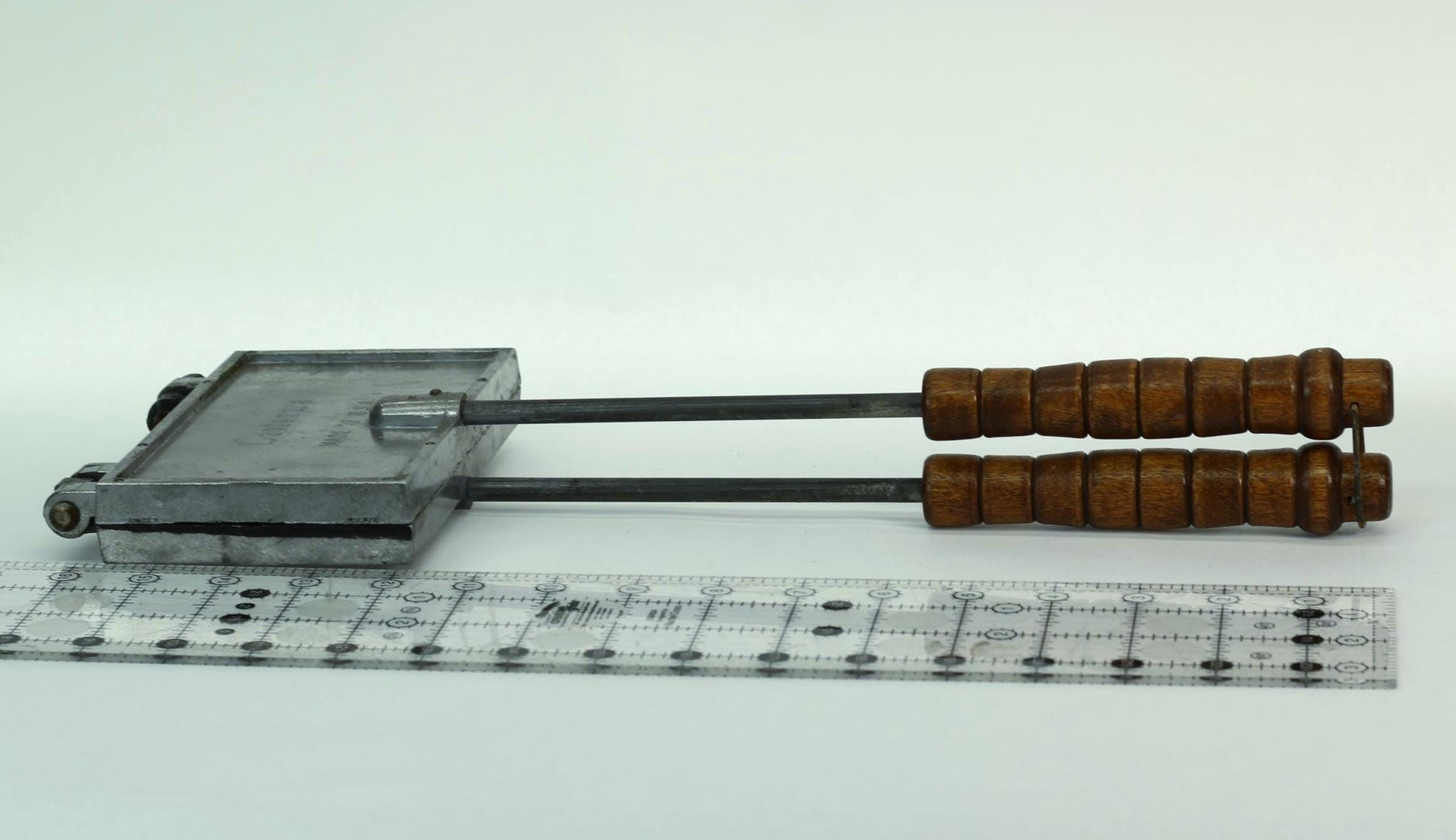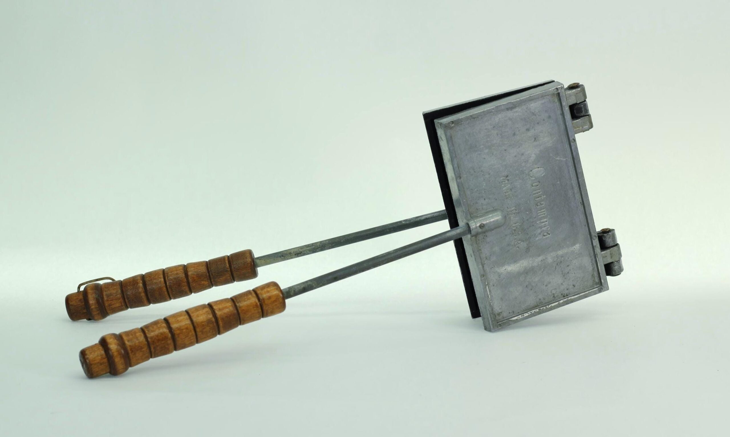 A classic piece of mid-century outdoor cookware, this hinged waffle iron was designed for cooking fresh waffles over a campfire, grill, or stovetop burner. With its long handles and clamshell plates, the iron can be flipped easily to cook both sides evenly.