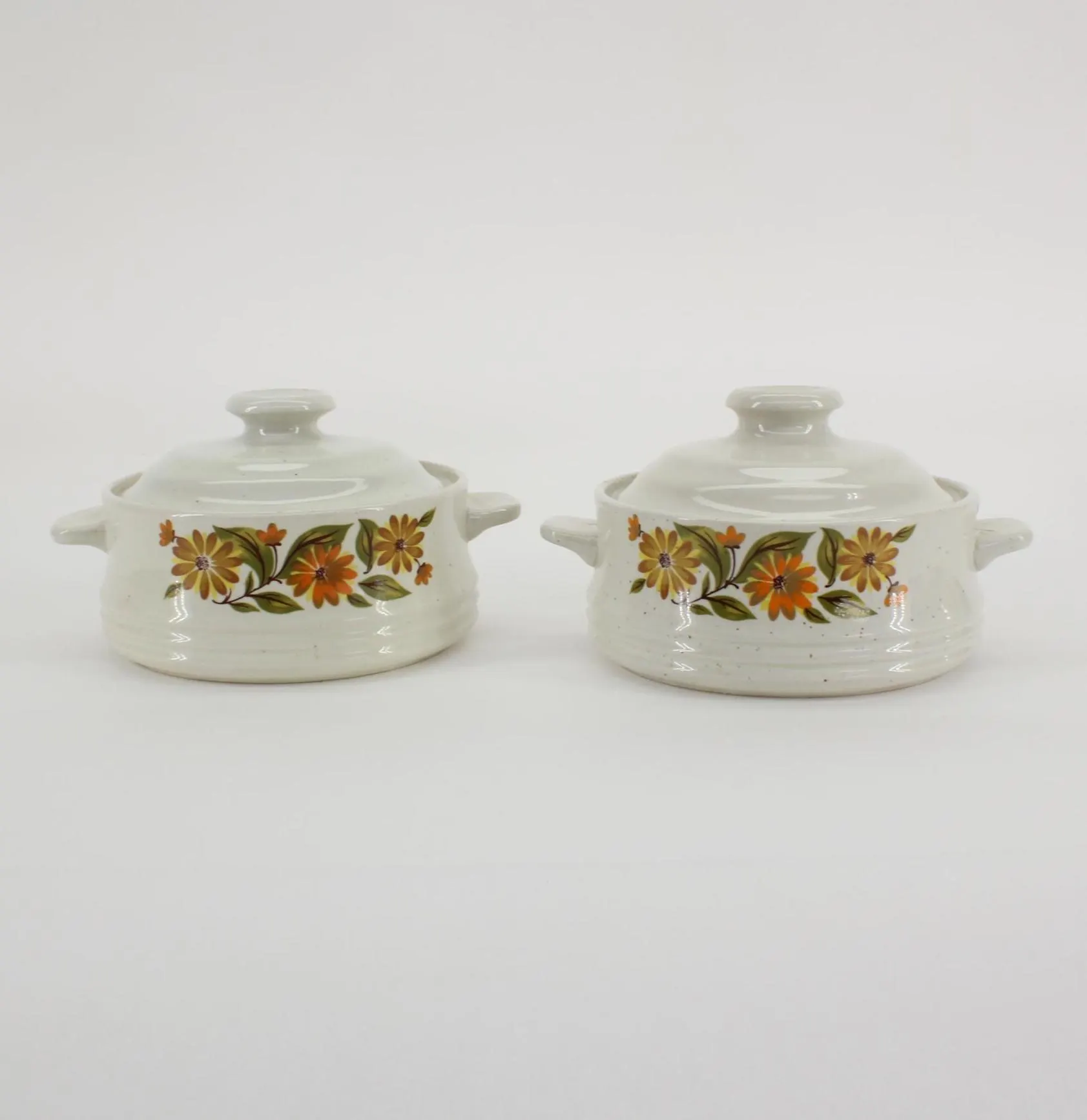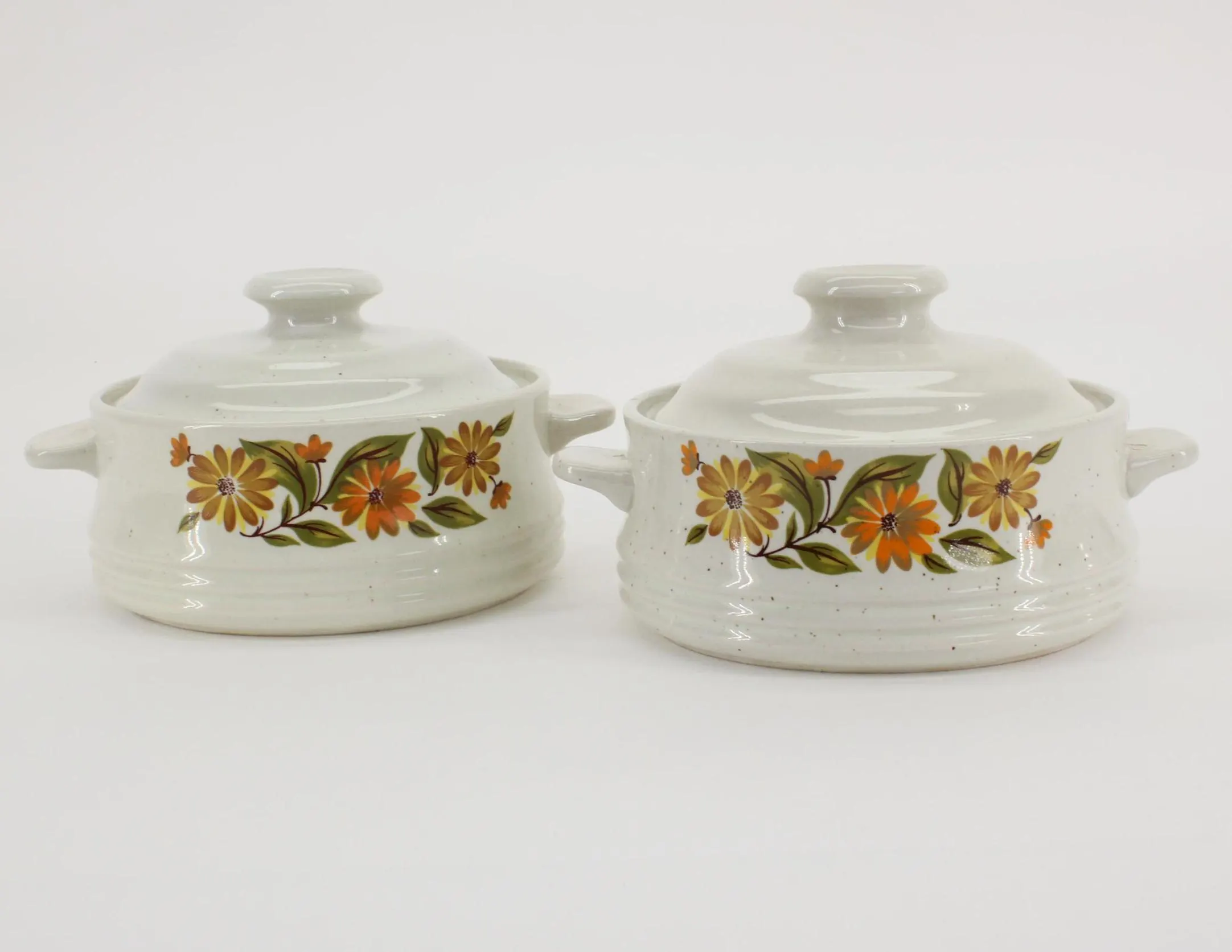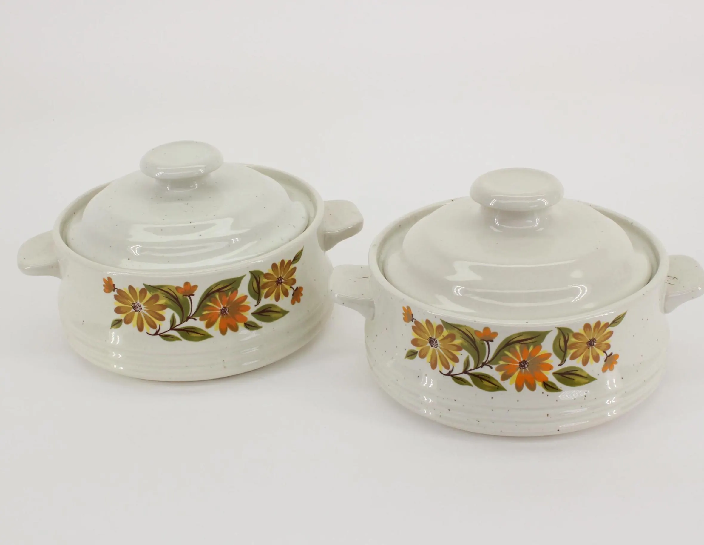 They are single-serving sized, about 4-1/2″ in diameter and 2-1/4″ deep; 6″ handle to handle and 3-1/2″ tall with the lid on. One dish has a hairline crack that is revealed in the last 2 photos, but it does not seem to have affected the integrity of the dish. Other than that, they are in excellent vintage condition and are ready to grace your 70’s era kitchen! Gift wrap available; no upcharge for handling or shipping!