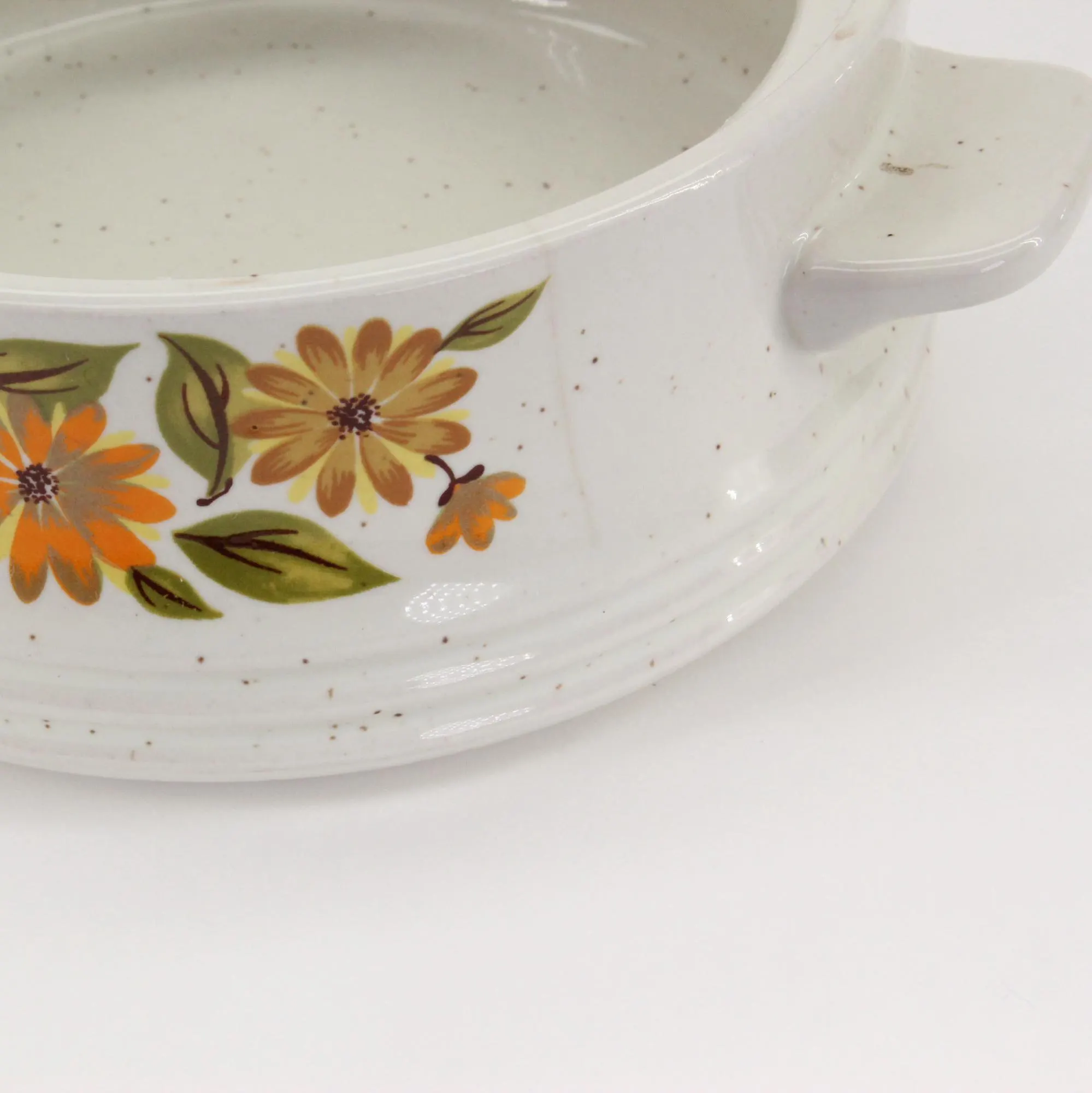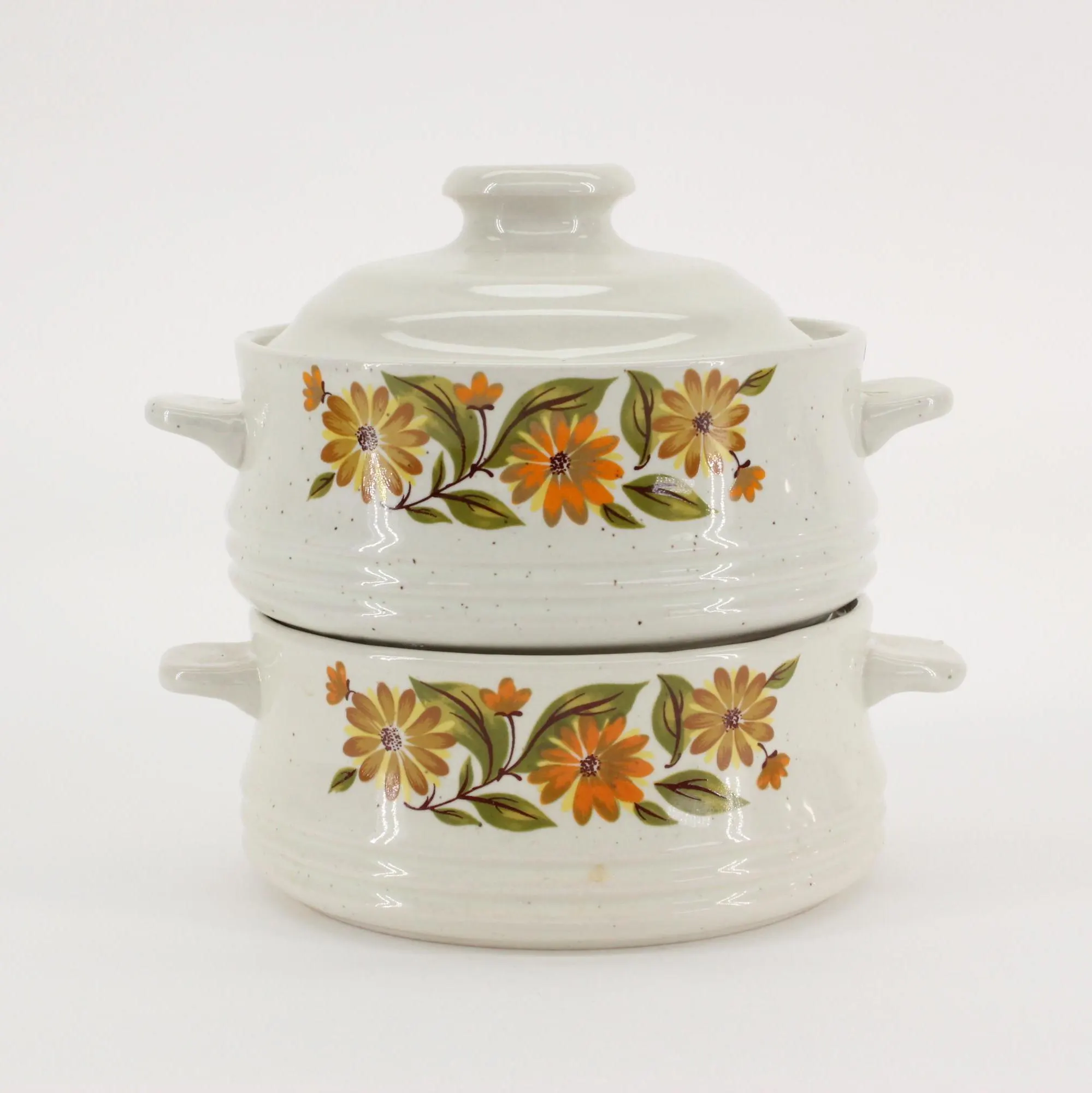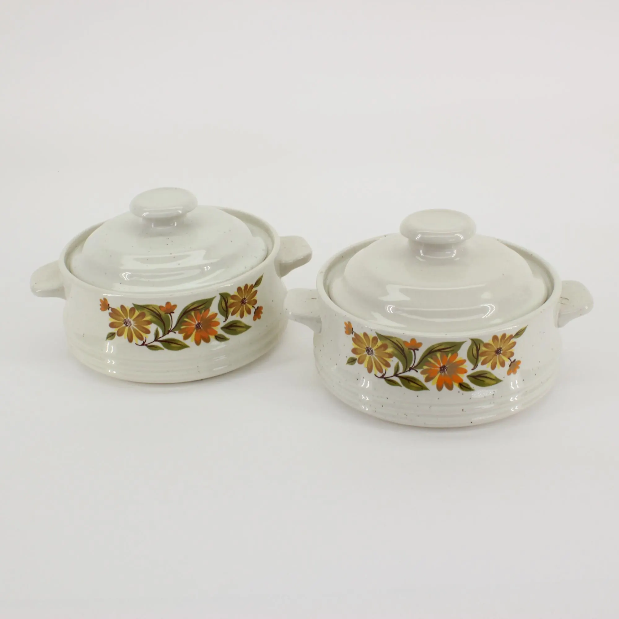 They are single-serving sized, about 4-1/2″ in diameter and 2-1/4″ deep; 6″ handle to handle and 3-1/2″ tall with the lid on. One dish has a hairline crack that is revealed in the last 2 photos, but it does not seem to have affected the integrity of the dish. Other than that, they are in excellent vintage condition and are ready to grace your 70’s era kitchen! Gift wrap available; no upcharge for handling or shipping!