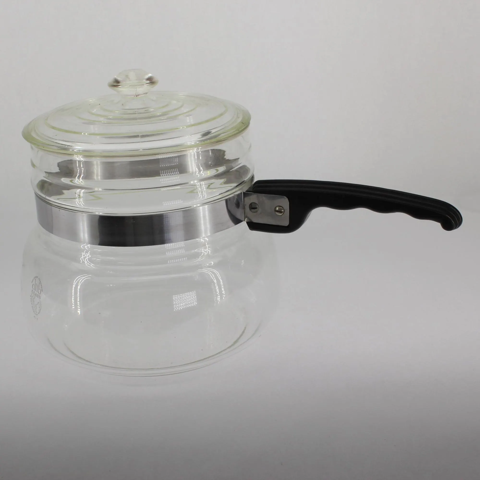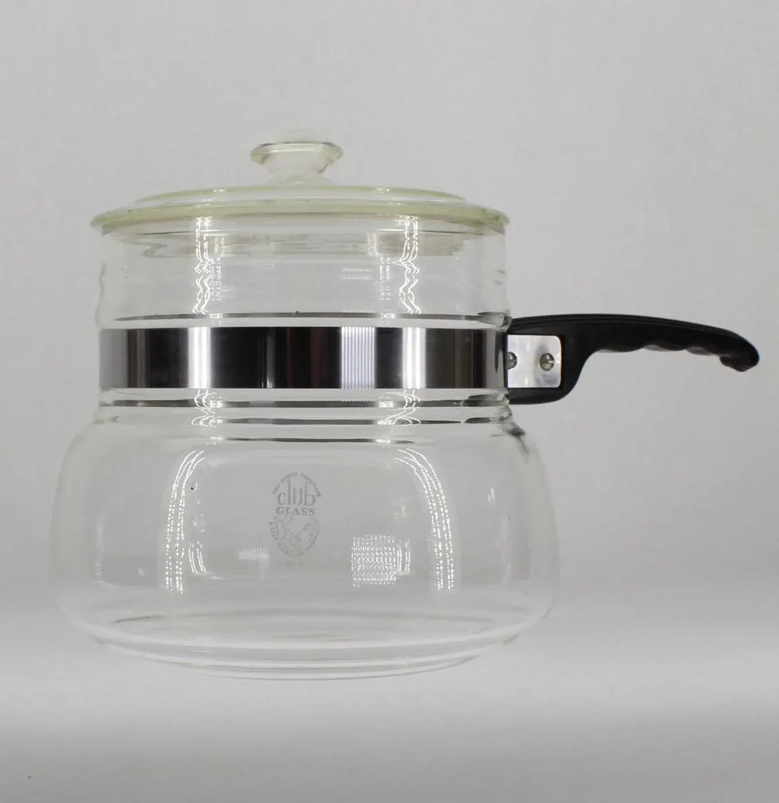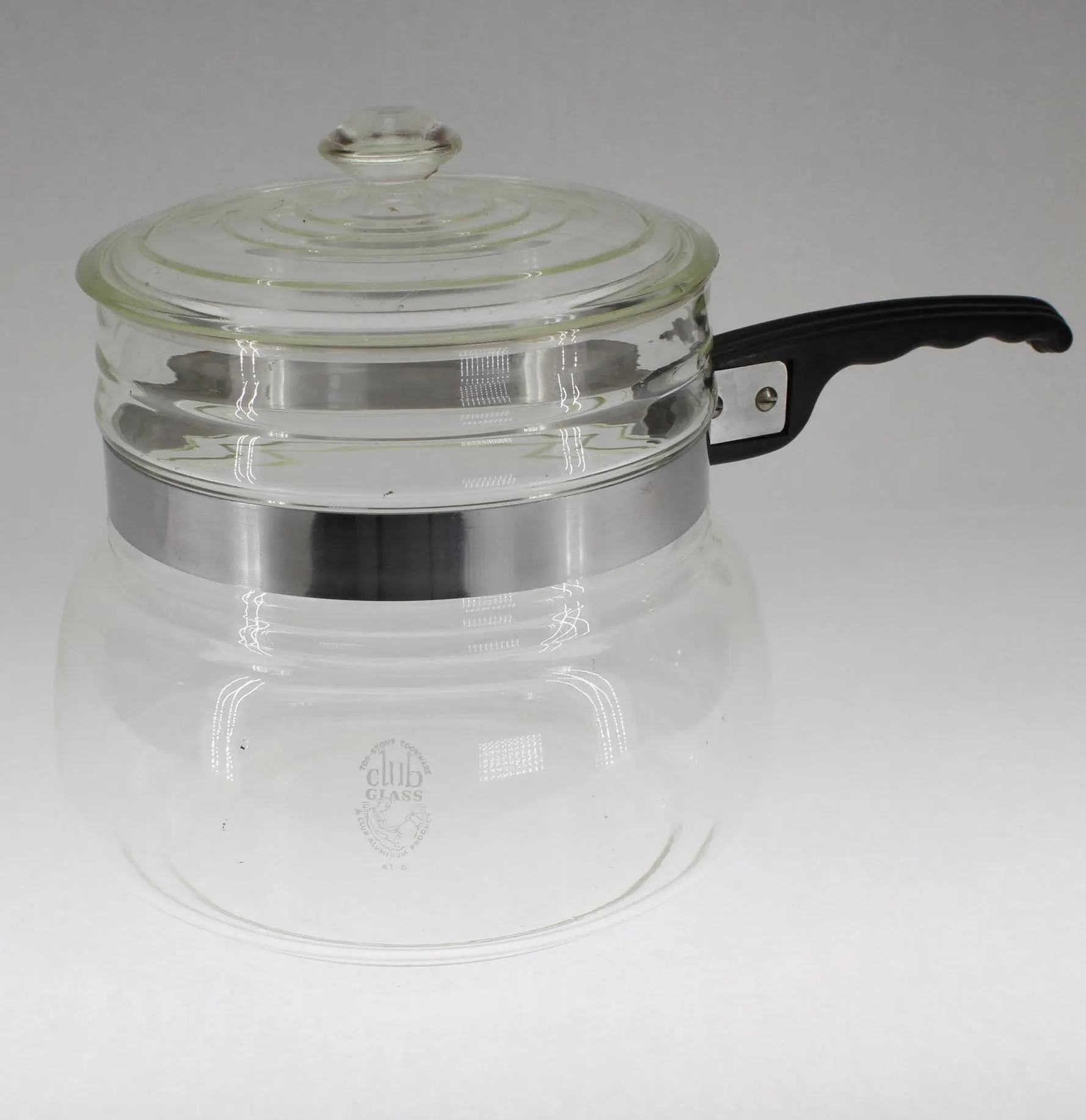 Club Cookware was a prominent brand during the early part of last century, mostly for their aluminum cookware and door-to-door sales model. I didn’t realize they made glass cookware until I came across this piece. It’s labelled “Club Glass- A Club Aluminum Product” and “Top-stove Cookware” with no capacity indicated, but it looks to be about 1-1/2 or 2 quarts. It’s about 6″ in diameter at the widest part, and about 7-1/2″ tall with the lid on. The handle strap has been removed, cleaned, and replaced, and the handle is solid and in good shape, although somewhat diminutive. It requires a diffuser clip to work safely on an electric stove, so I’ll add one to the package. Based on the long “neck,” which is unusual for a saucepan, I suspect this may have been the bottom piece of a double boiler set?