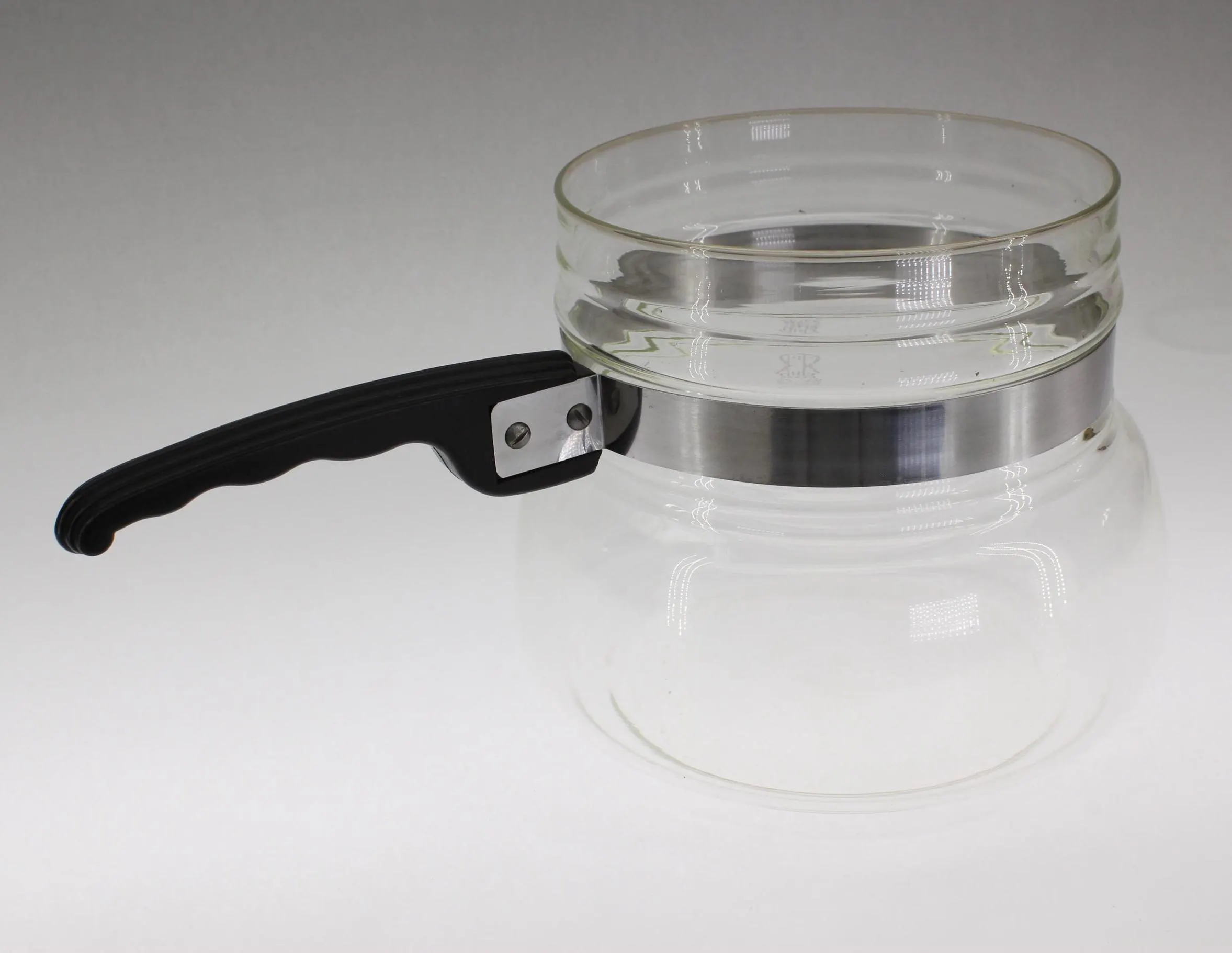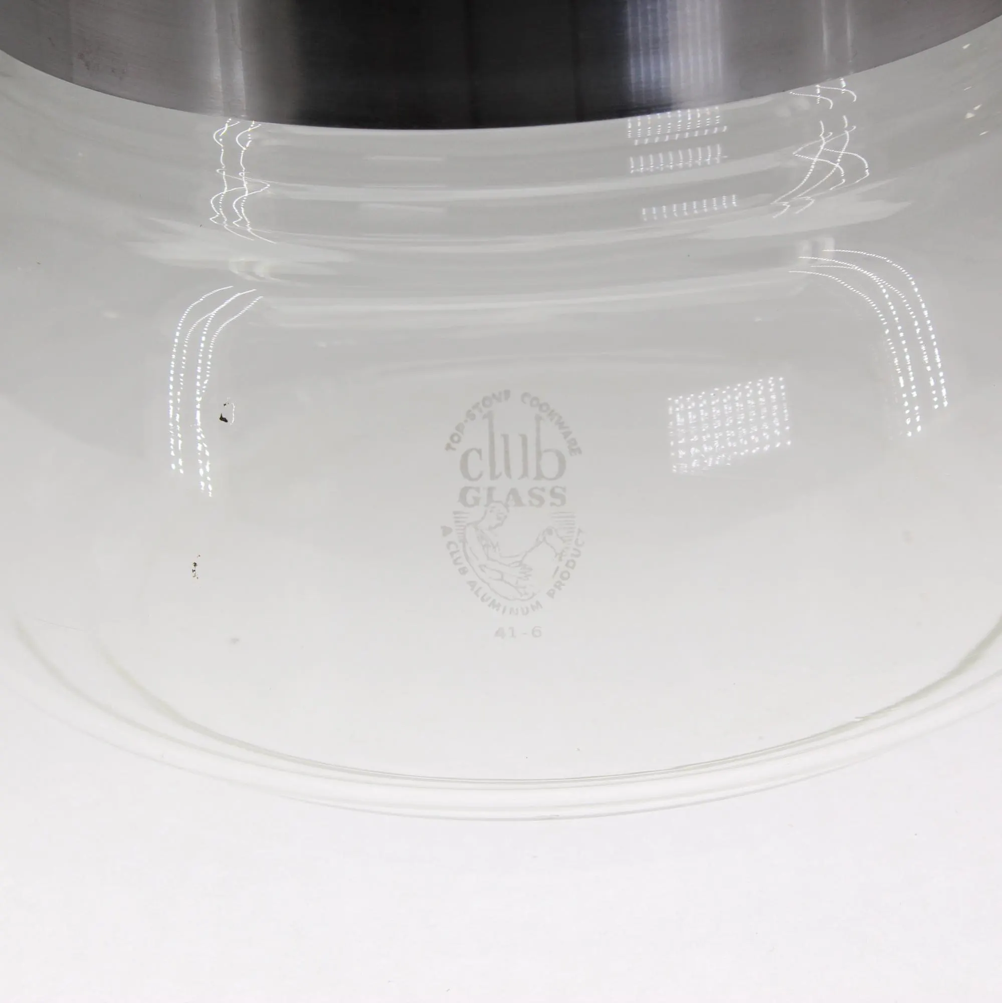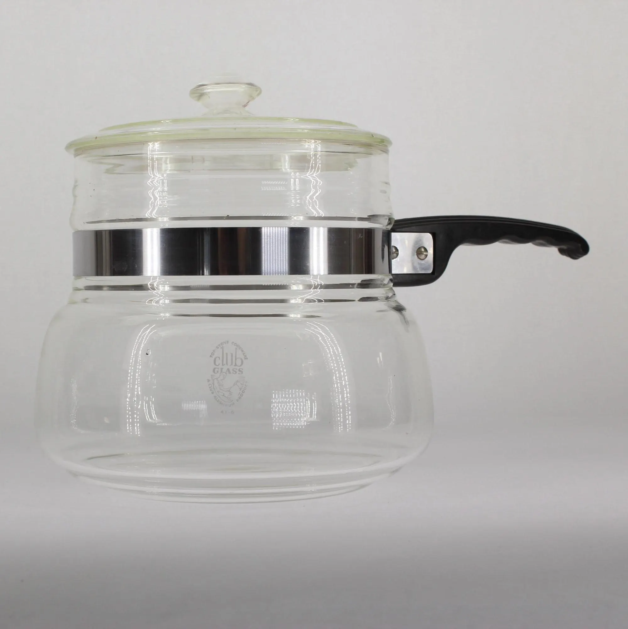 Club Cookware was a prominent brand during the early part of last century, mostly for their aluminum cookware and door-to-door sales model. I didn’t realize they made glass cookware until I came across this piece. It’s labelled “Club Glass- A Club Aluminum Product” and “Top-stove Cookware” with no capacity indicated, but it looks to be about 1-1/2 or 2 quarts. It’s about 6″ in diameter at the widest part, and about 7-1/2″ tall with the lid on. The handle strap has been removed, cleaned, and replaced, and the handle is solid and in good shape, although somewhat diminutive. It requires a diffuser clip to work safely on an electric stove, so I’ll add one to the package. Based on the long “neck,” which is unusual for a saucepan, I suspect this may have been the bottom piece of a double boiler set?
