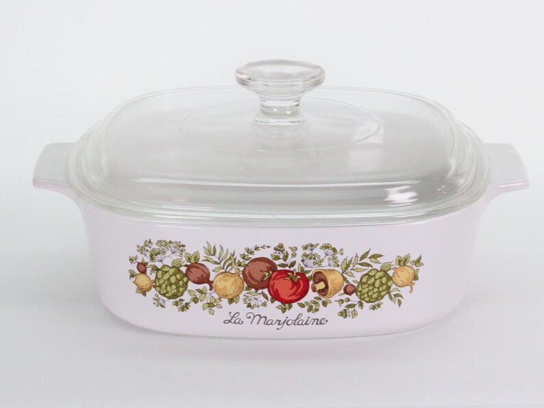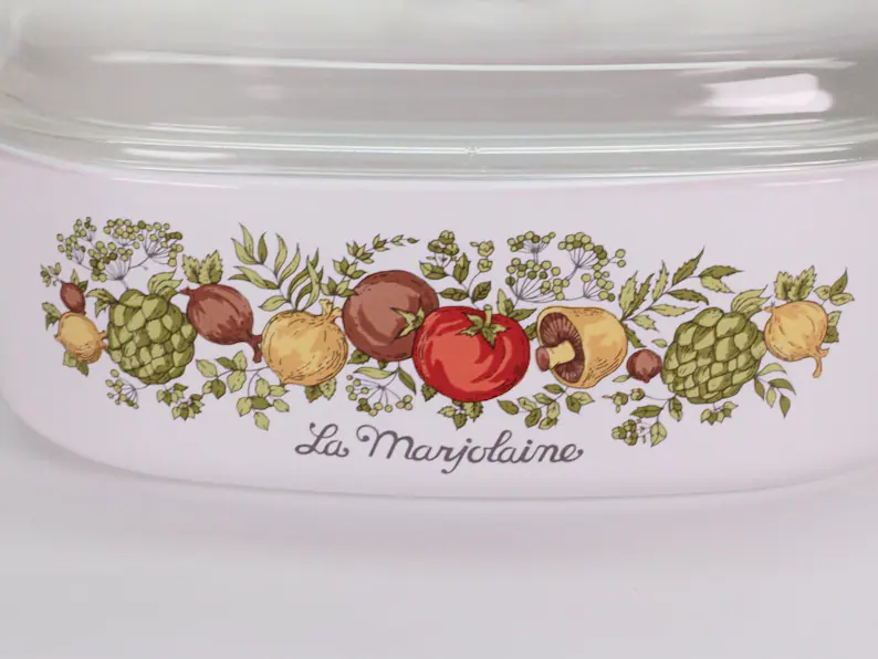 This Corning Ware A-2-B casserole holds 2 quarts — perfect for side dishes, smaller casseroles, desserts, or storing leftovers. Patterned in the beloved Spice of Life design, this one features the single-word variant: “La Marjolaine”, part of the charming French herb series that became a mid-century kitchen icon.