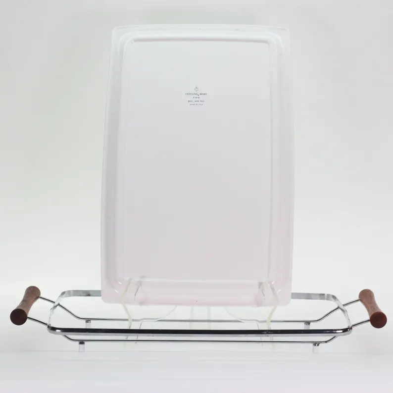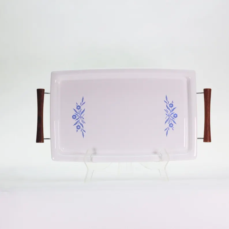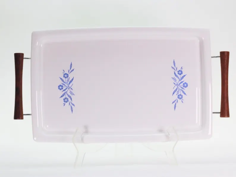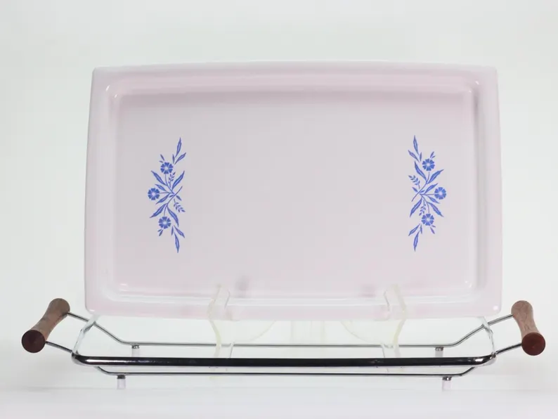 ✨ A rare and versatile find for both the kitchen and the collector! This rectangular Corning Ware broil and bake tray in the iconic Blue Cornflower pattern (P-35-B) comes with its original chrome stand and rich wood handles. Perfect for roasting vegetables, baking fish, or serving hot appetizers right at the table, it transitions effortlessly from oven to presentation.