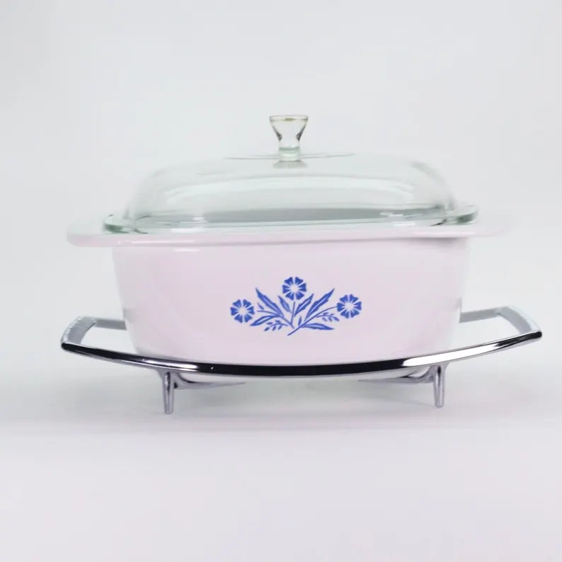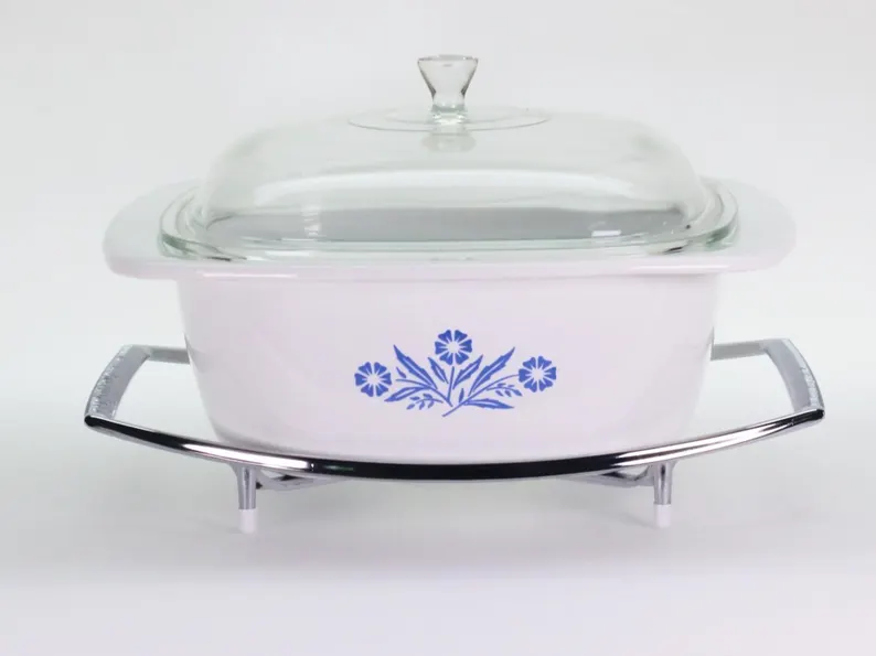 Introduced in the late 1950s, the Blue Cornflower pattern became Corning Ware’s most iconic design. Its durable Pyroceram glass-ceramic body is safe for oven, microwave, refrigerator, freezer, and dishwasher — true oven-to-table versatility.