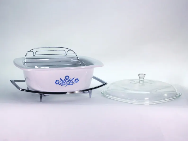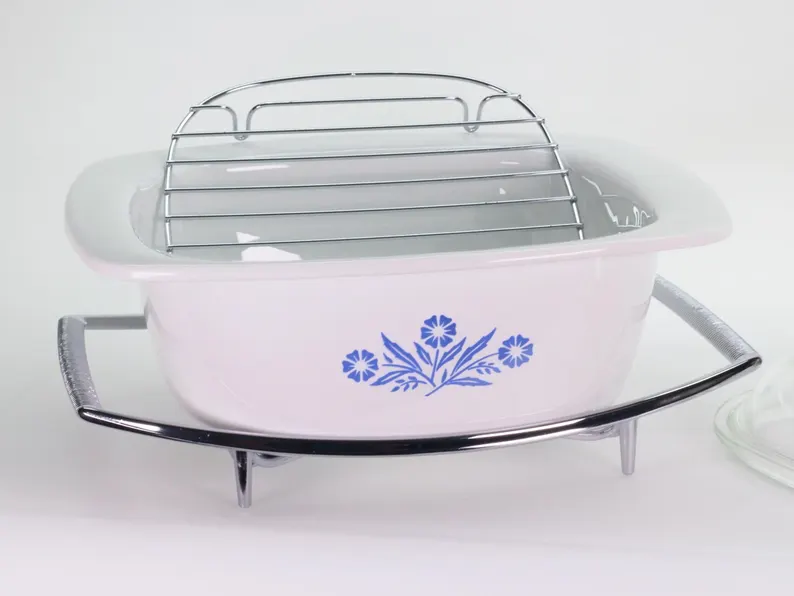 This is not a thrift-store find — it’s a fully cleaned, polished, and inspected vintage Corning Ware set. The 4-quart P-34-B Dutch oven, domed glass lid, chrome cradle, and removable roasting rack have all been restored to collector-grade condition. Every piece is sparkling clean and ready for your next family gathering or to take pride of place in your vintage kitchen display.