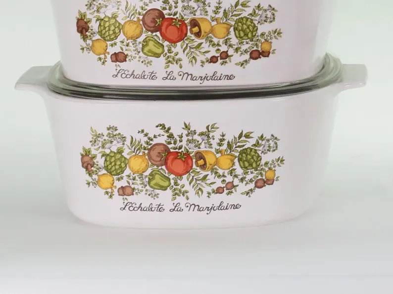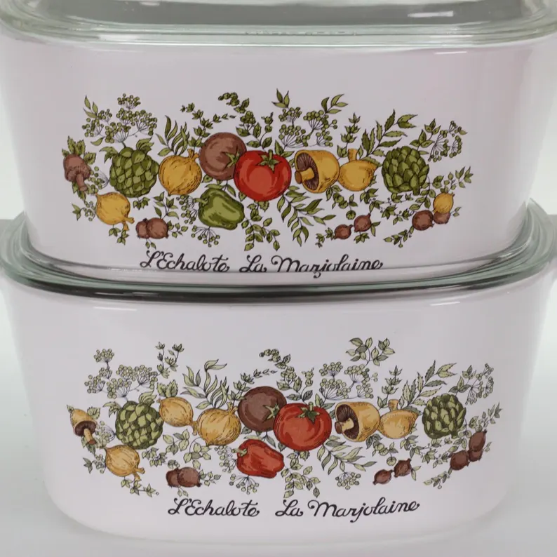 The Spice of Life pattern is one of Corning Ware’s most beloved designs, featuring fresh garden vegetables and French-inspired lettering. This listing offers a choice between two distinct print styles, both highly collectible.