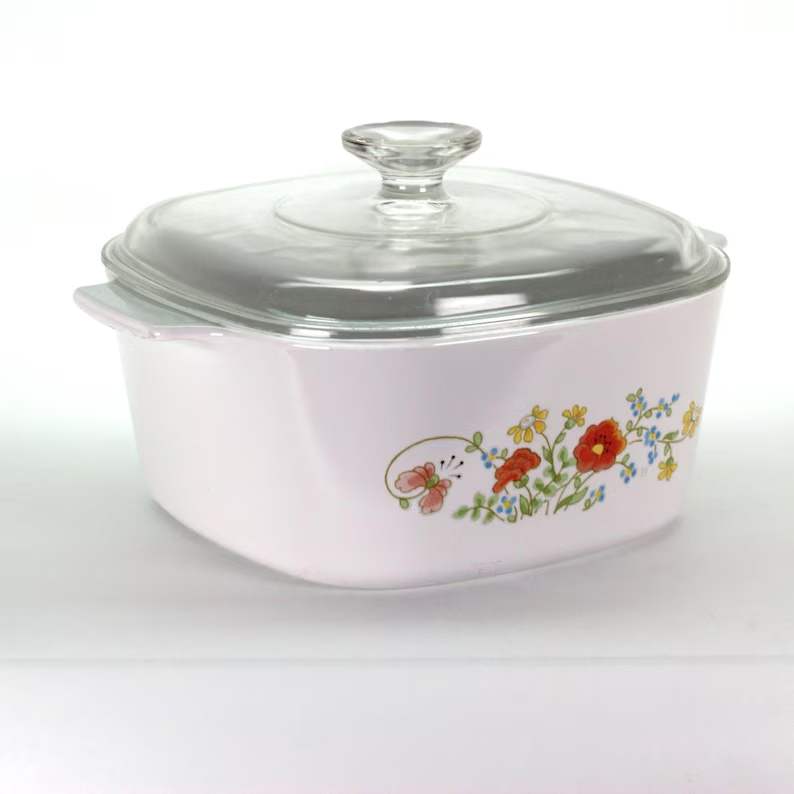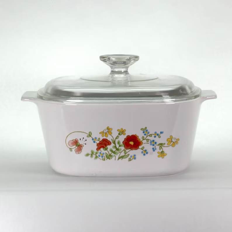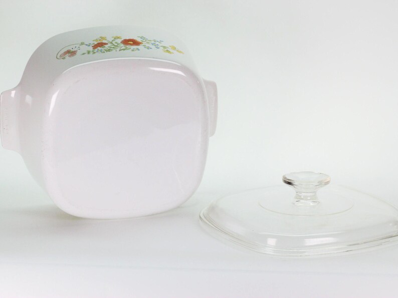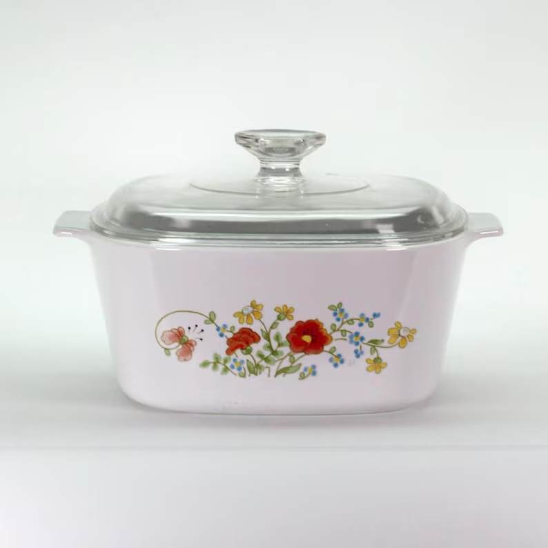 This 3 liter casserole with lid is one of the most versatile and generous sizes in the Corning Ware Wildflower line, produced between 1977 and the mid-1980s. The bold floral design — bright orange poppies, yellow daisies, and tiny blue blossoms — brings cheer to any table.