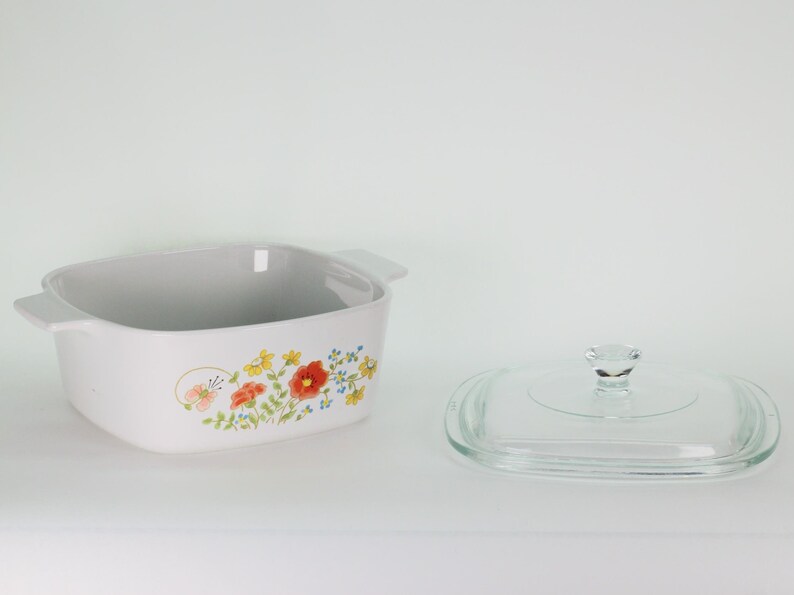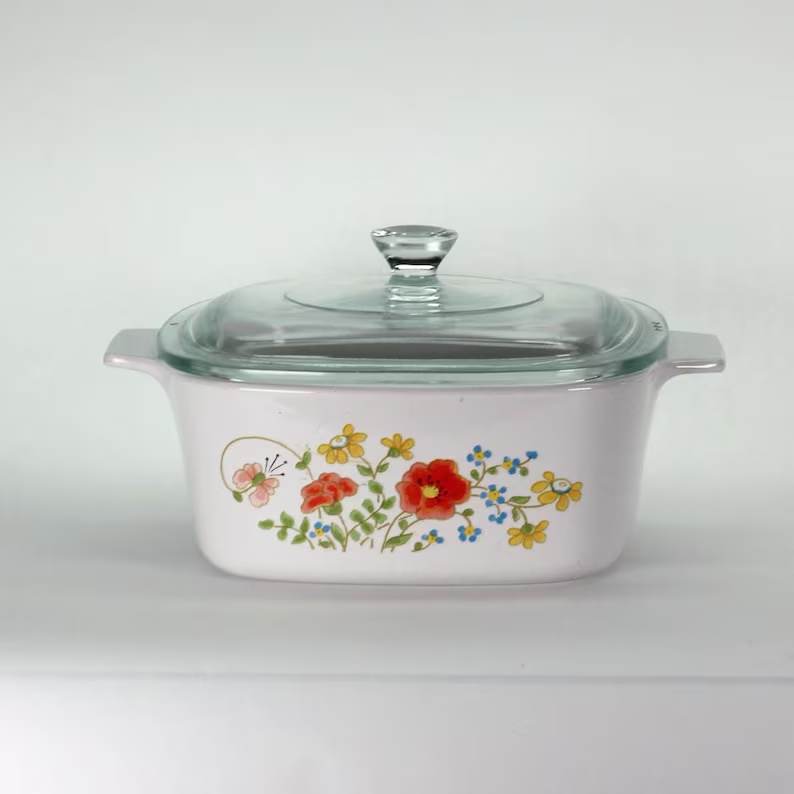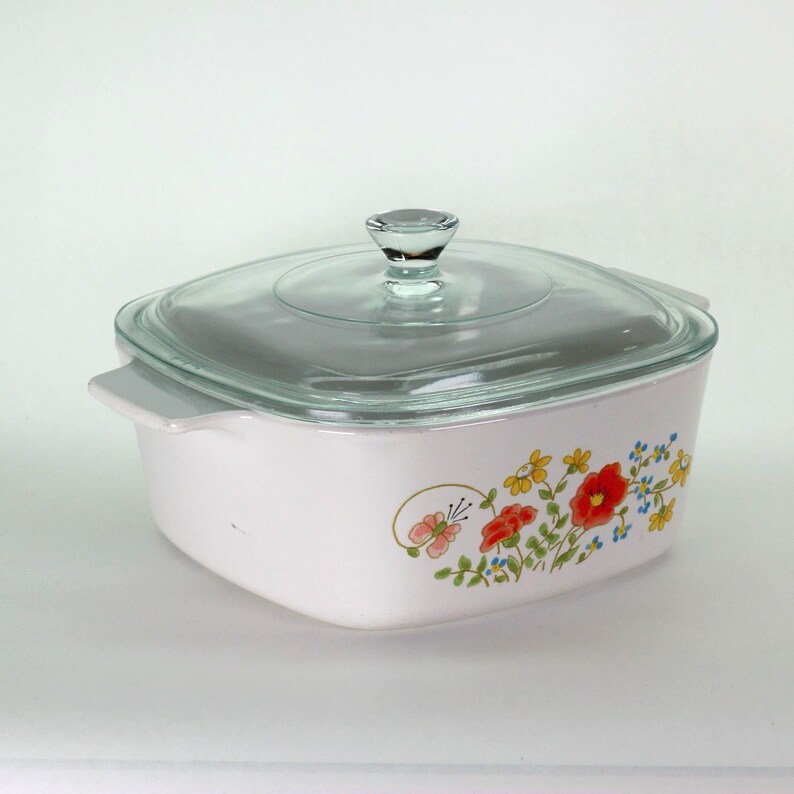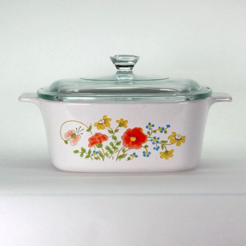 This lovely 1-1/2 quart casserole with lid features the bright and cheerful Wildflower pattern, produced between 1977 and the mid-1980s. Orange poppies, yellow daisies, and soft pink accents make this one of Corning Ware’s most popular floral motifs.