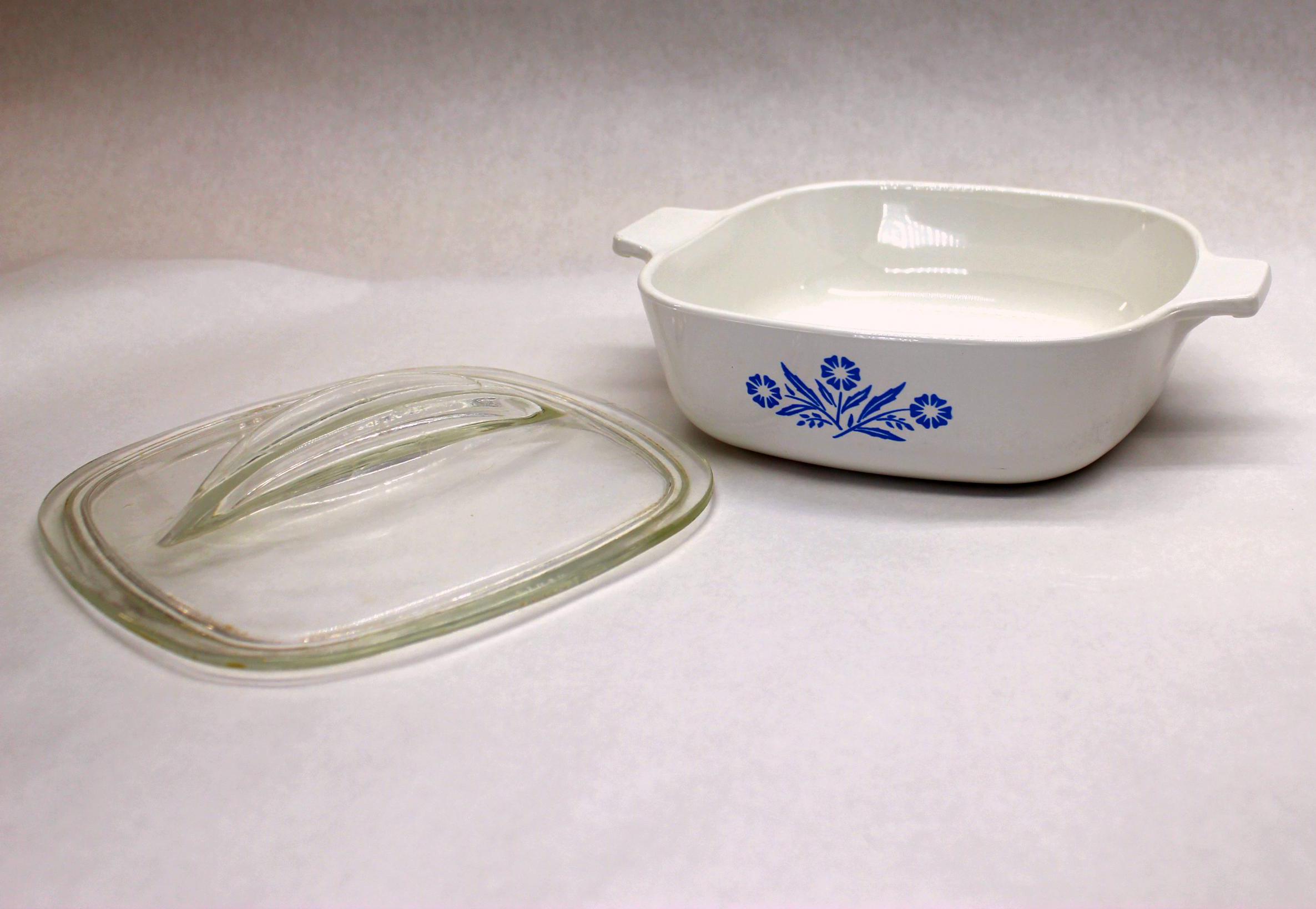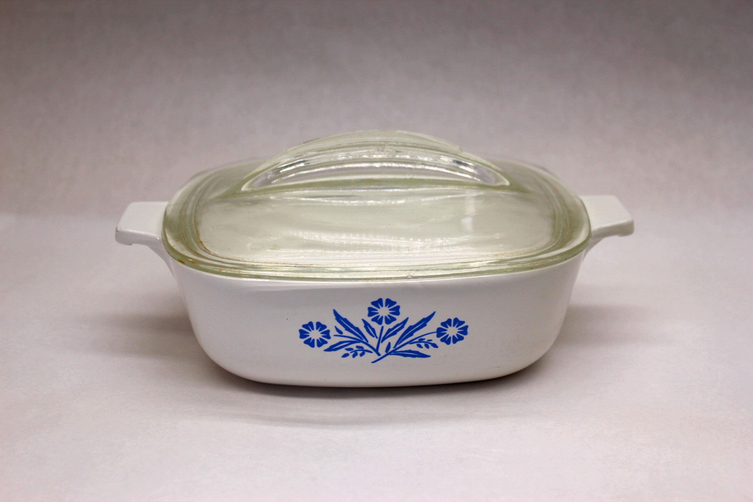This 1 qt Blue Cornflower casserole dish is in excellent condition with no chips, cracks, or significant scratches. It was made in the early years of CorningWare, before model numbers were listed on each piece. It has the older small-knob lid, rather than the larger knob seen on more recent pieces. The dish and lid are in excellent condition, with no chips, scratches or stains. Even if you already have a 1 quart in your collection, the rare older-style lid can add some history and reference to your collection.
