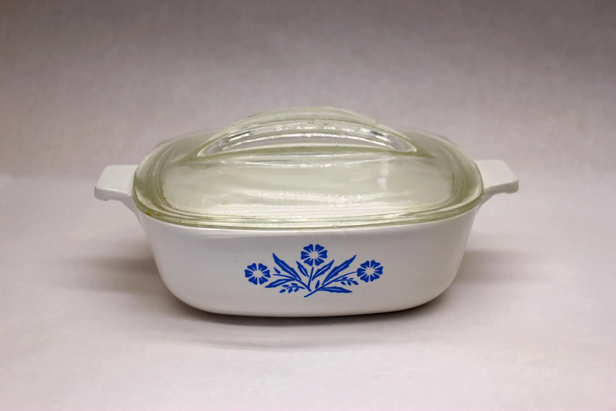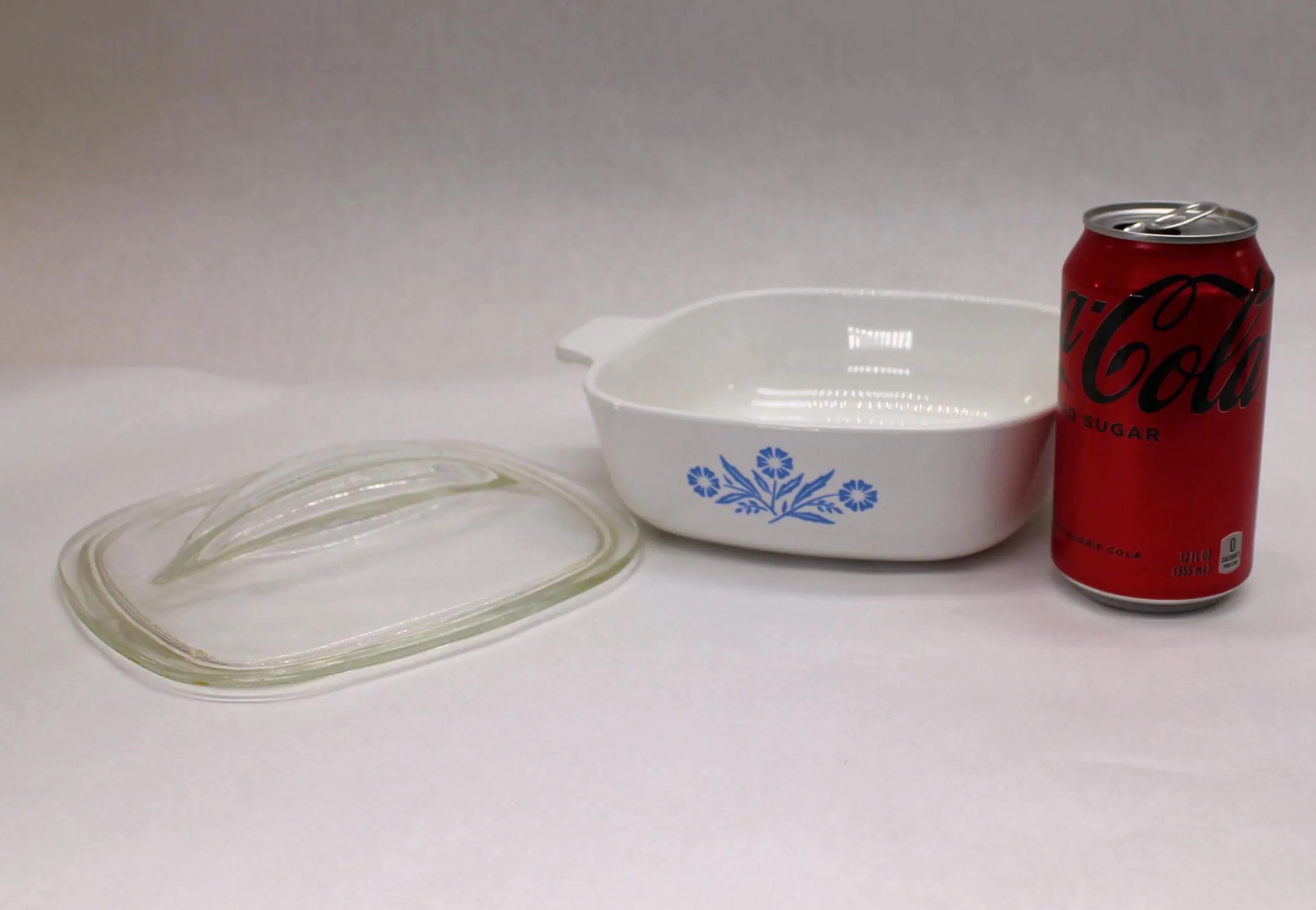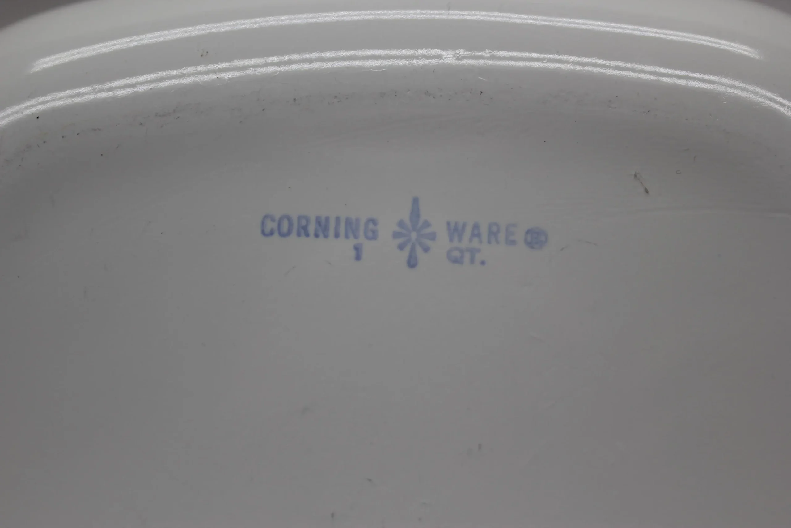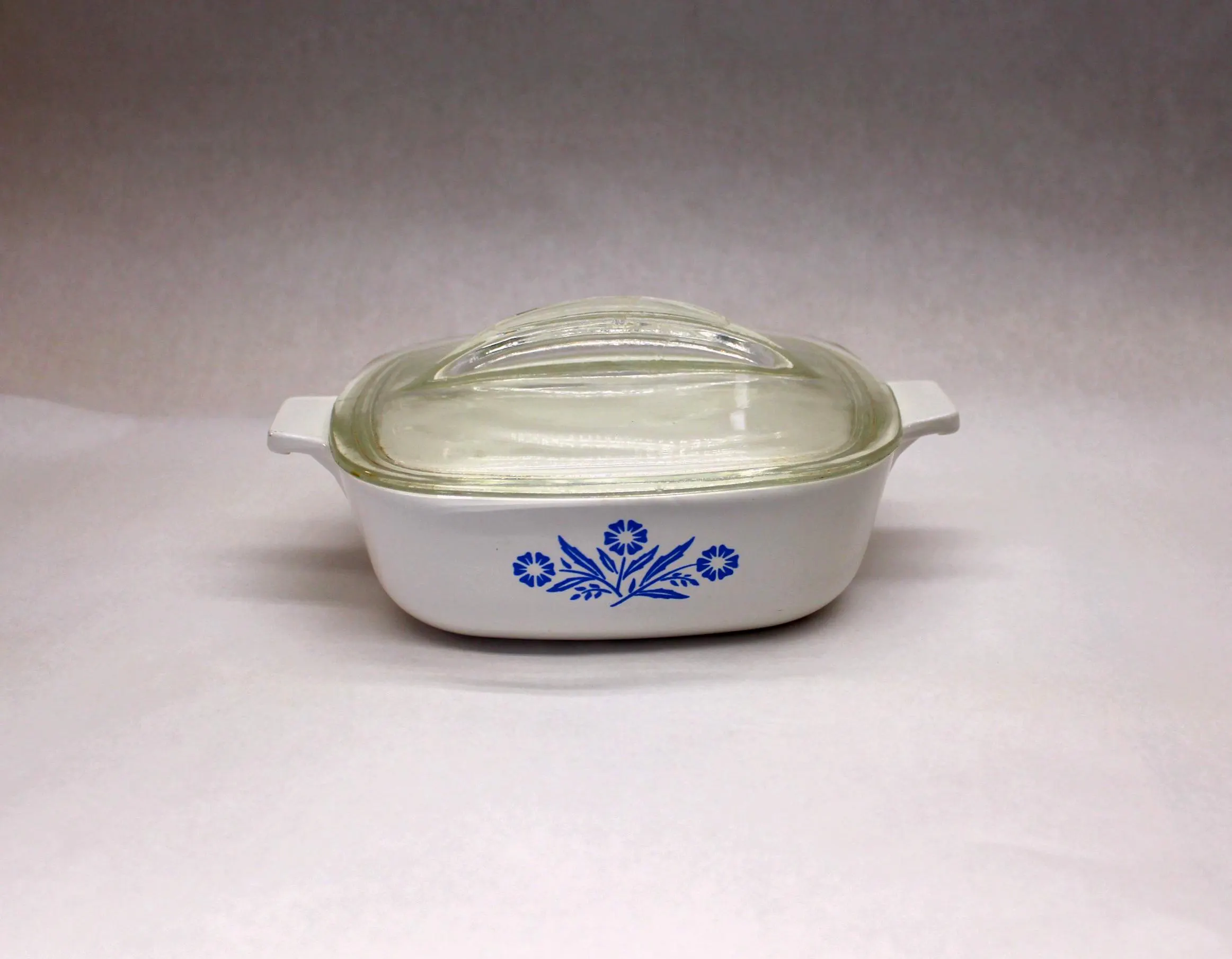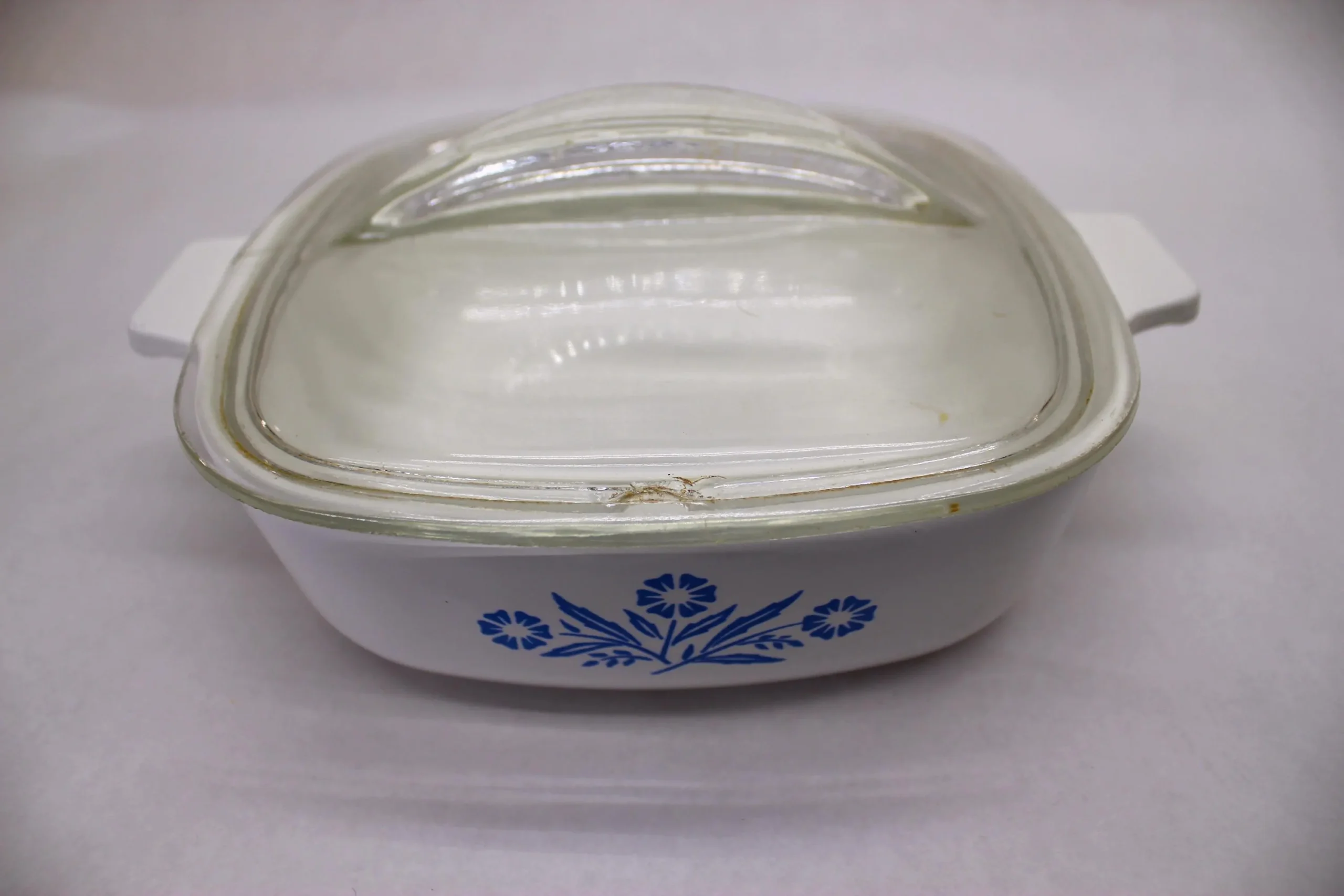 This 1 qt Blue Cornflower casserole dish is in excellent condition with no chips, cracks, or significant scratches. It was made in the early years of CorningWare, before model numbers were listed on each piece. It has the older small-knob lid, rather than the larger knob seen on more recent pieces. The dish and lid are in excellent condition, with no chips, scratches or stains. Even if you already have a 1 quart in your collection, the rare older-style lid can add some history and reference to your collection.