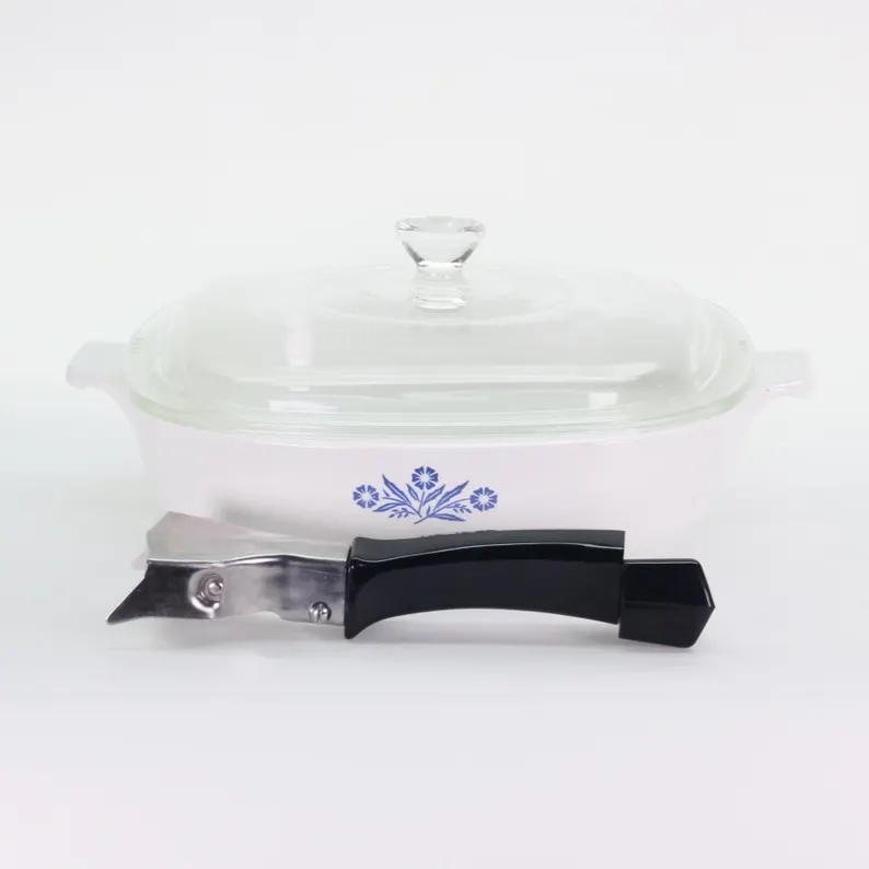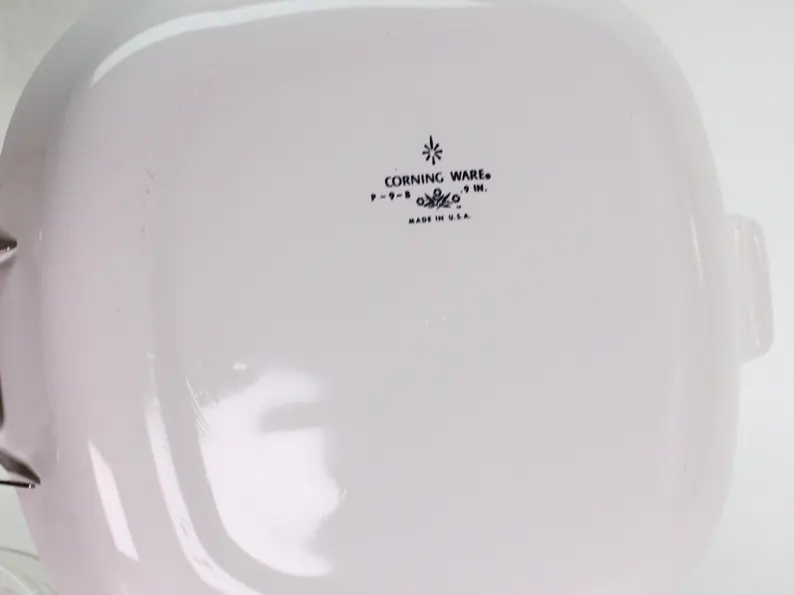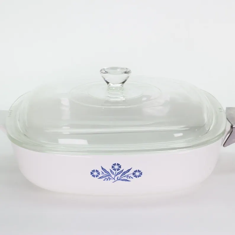 🌀 This is an early pre-1972 P-series piece, identifiable by its tapered sides and P-series model number. These earlier models were made before Corning transitioned to the later A-series with straight sides and metric sizing. The detachable handle makes storage a breeze, and the glass lid lets you keep an eye on your meal without lifting the cover.