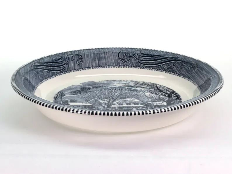 Bake with a side of nostalgia in this Currier & Ives Blue pie plate by Royal China. This charming 10-inch dish features the Old Inn, Wisconsin scene — part of the beloved blue-and-white dinnerware line produced in Sebring, Ohio.