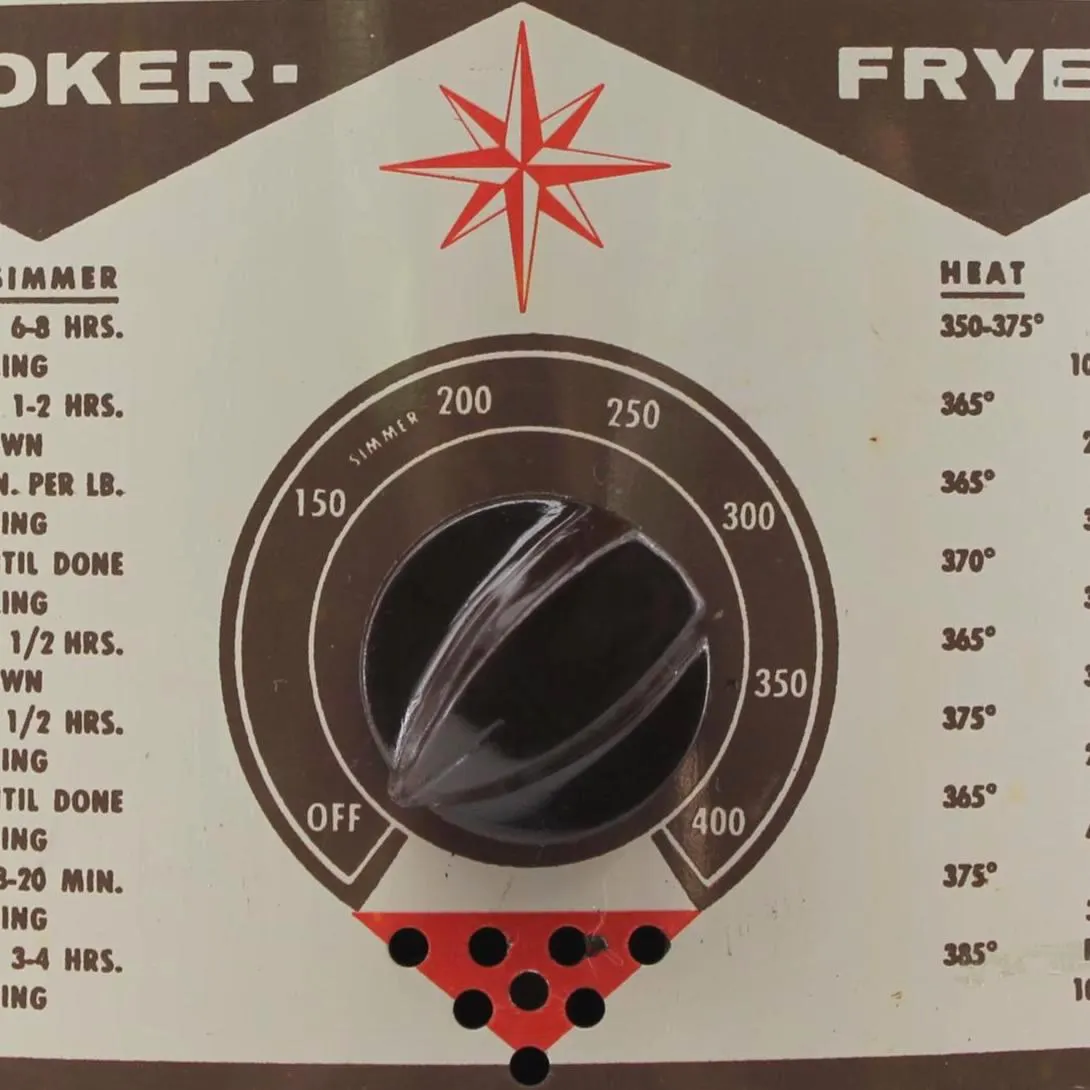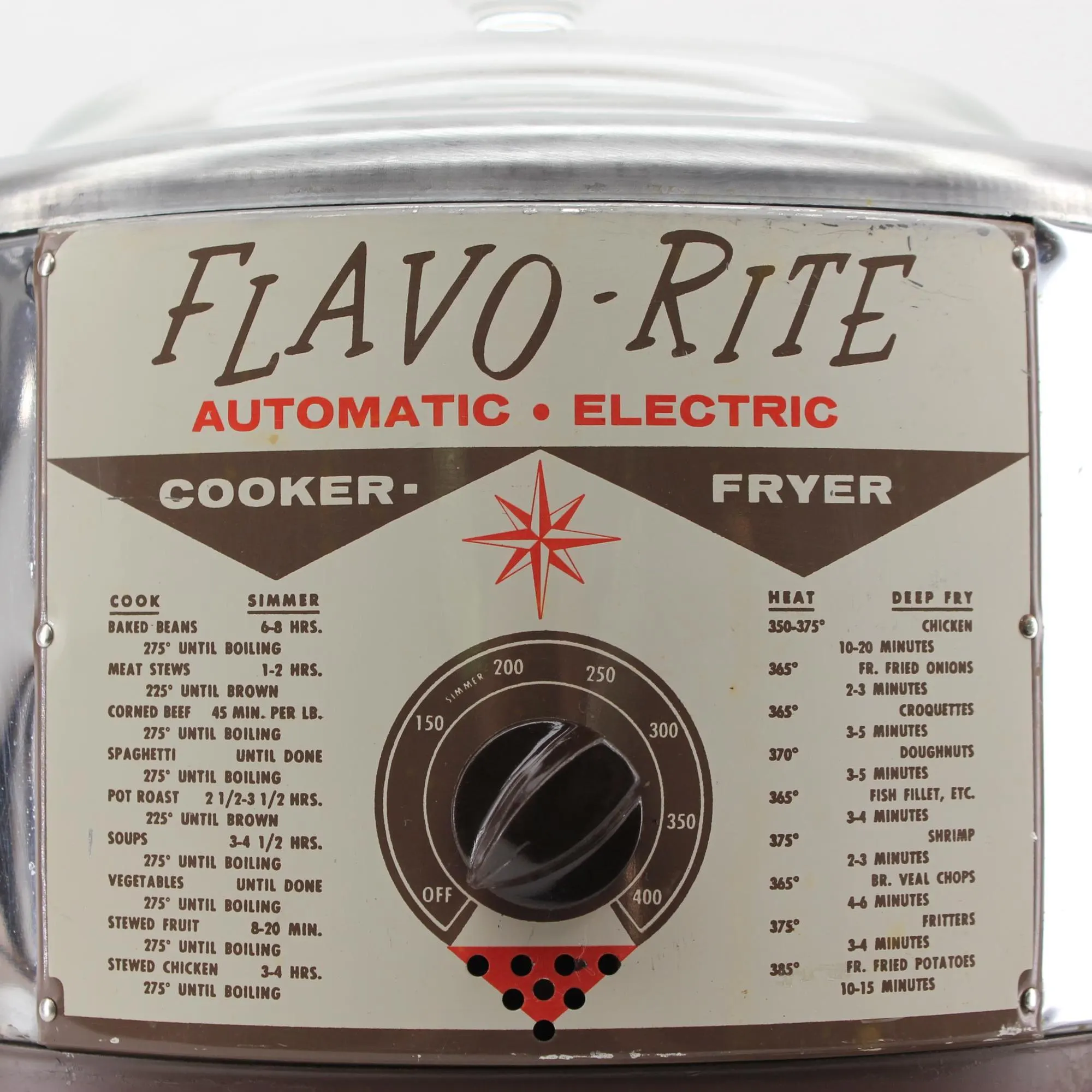 Bring the sizzle back to your stovetop-free setup with this fabulous Flavo-Rite Automatic Electric Cooker–Fryer, made in the golden age of atomic-era appliances. Chrome-clad and trimmed with deep brown accents, this piece features an iconic mid-century dial face, complete with cooking and deep-fry guides—plus that signature starburst graphic that says “hello, 1960!”