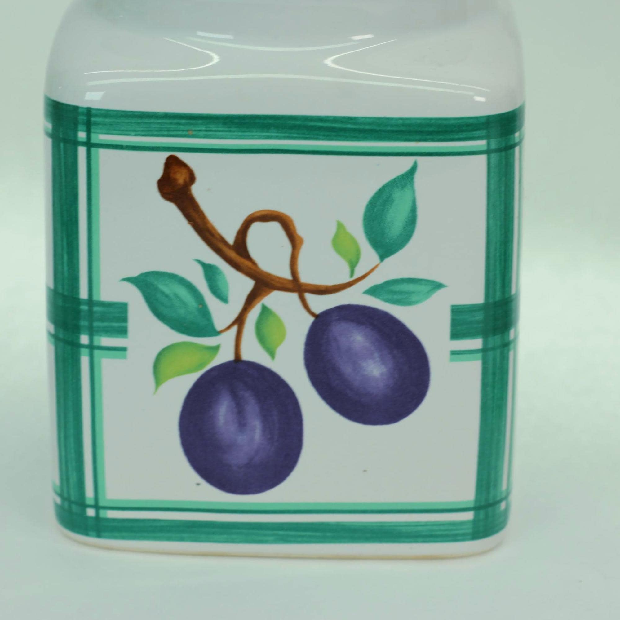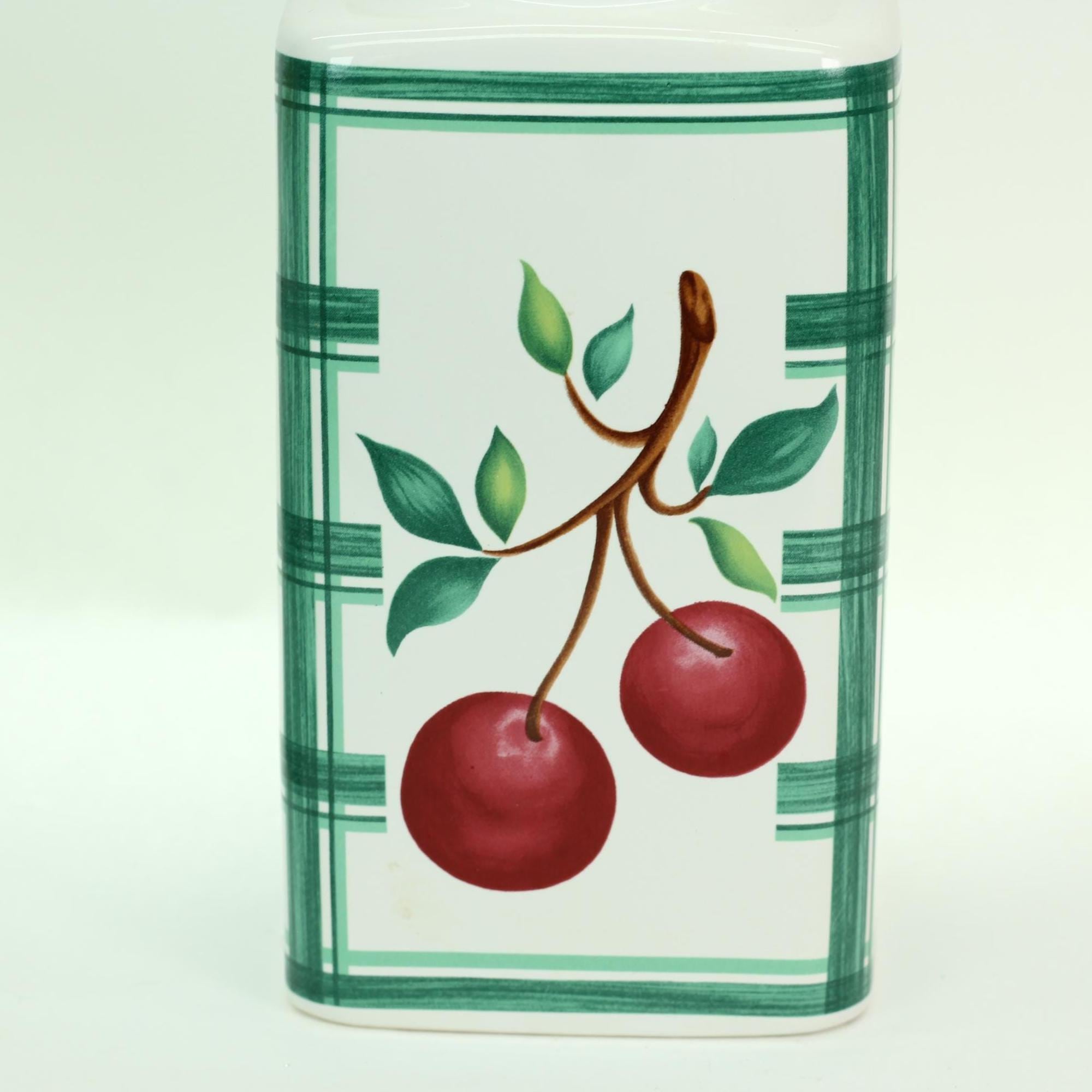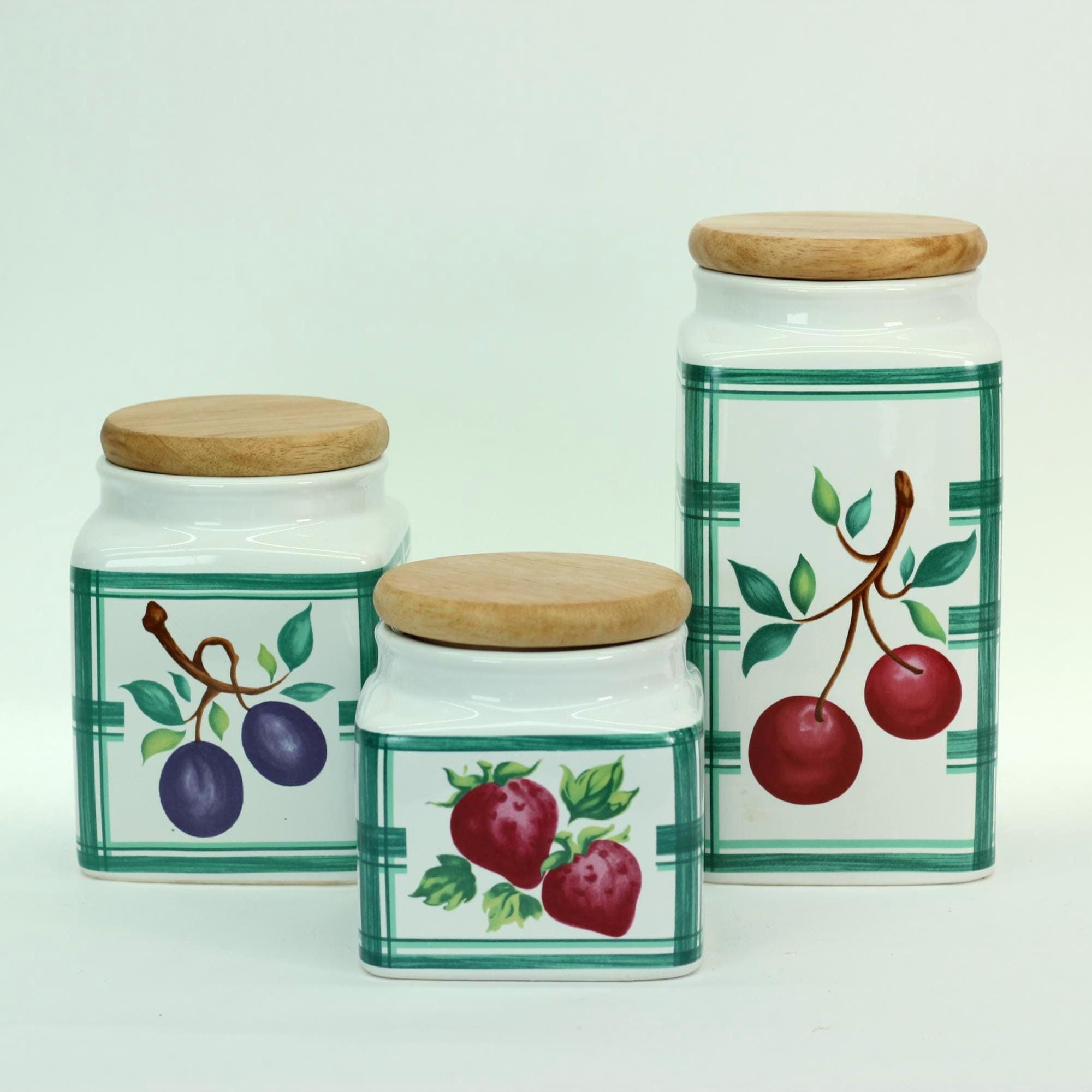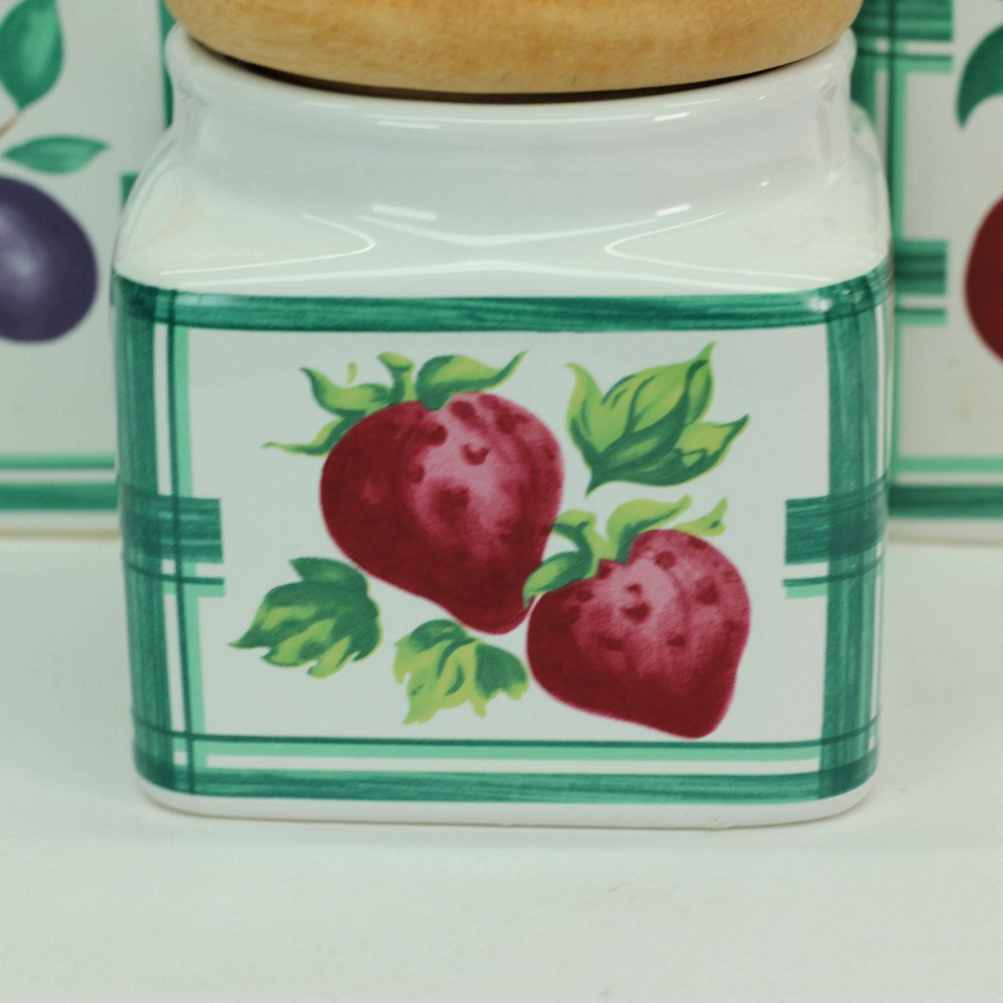 A charming three-piece ceramic canister set from Lillian Vernon, featuring colorful fruit illustrations framed by a classic green plaid border.