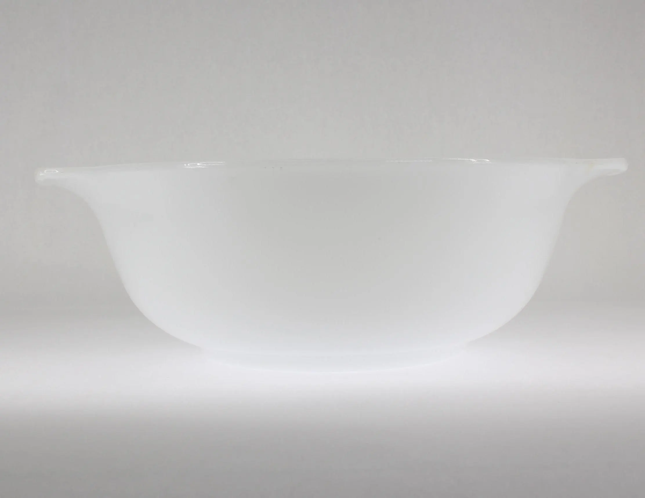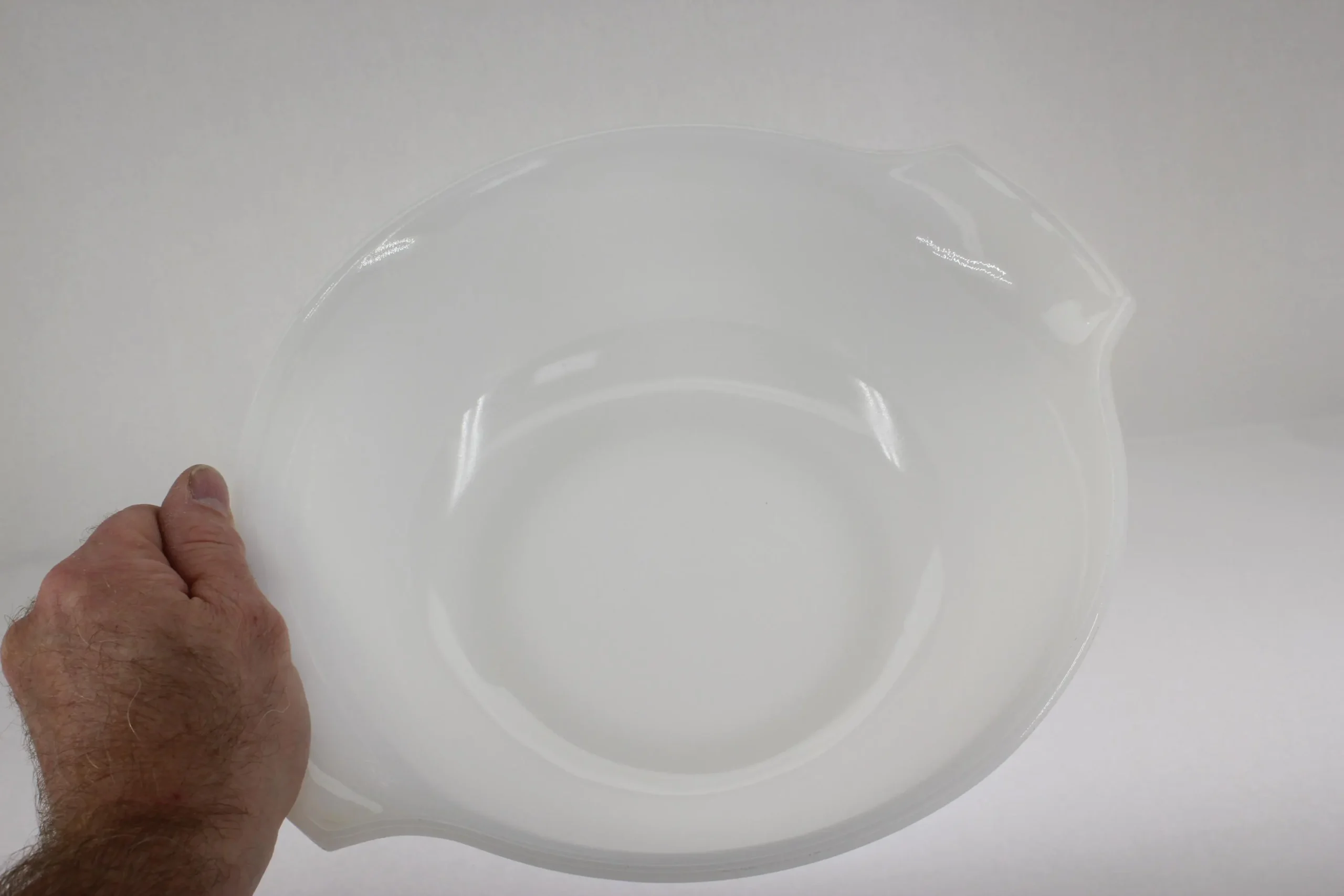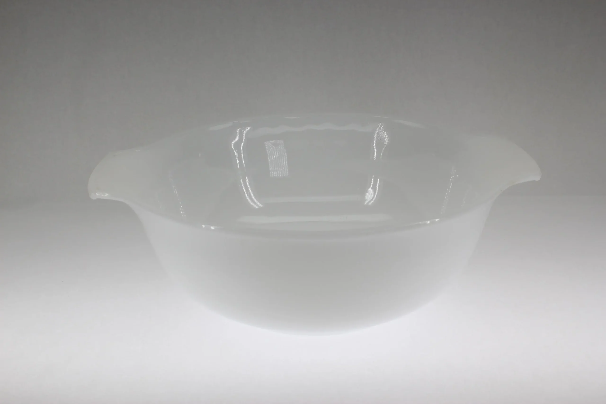 Glasbake most famously made the glass bowls for Sunbeam Mixmasters, but they also made other kitchen glassware as well, as evidenced by this double-handled mixing bowl. Rather than the straight sides required by an electric mixer, this bowl has sloped sides that make it perfect for hand mixing batters and doughs. The capacity is not labelled but it looks to be 5-6 quarts, making it perfect for mixing and proofing bread. It measures 11″ in diameter (13″ at the handles) and stands about 4-1/4″ tall. It’s in excellent vintage condition with no beater marks and no signs of dishwasher distress. If I were still baking bread I’d probably keep this on for myself!