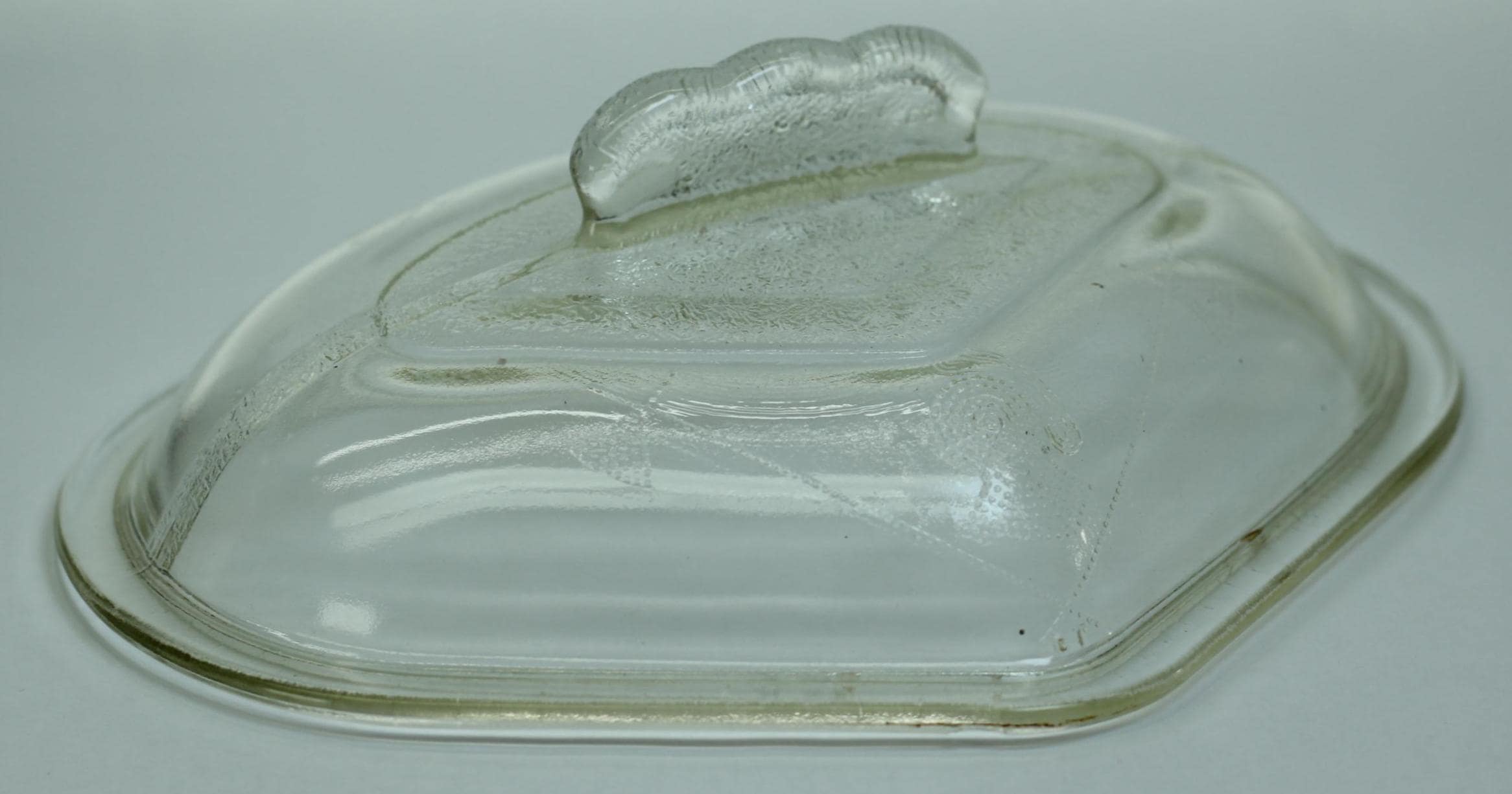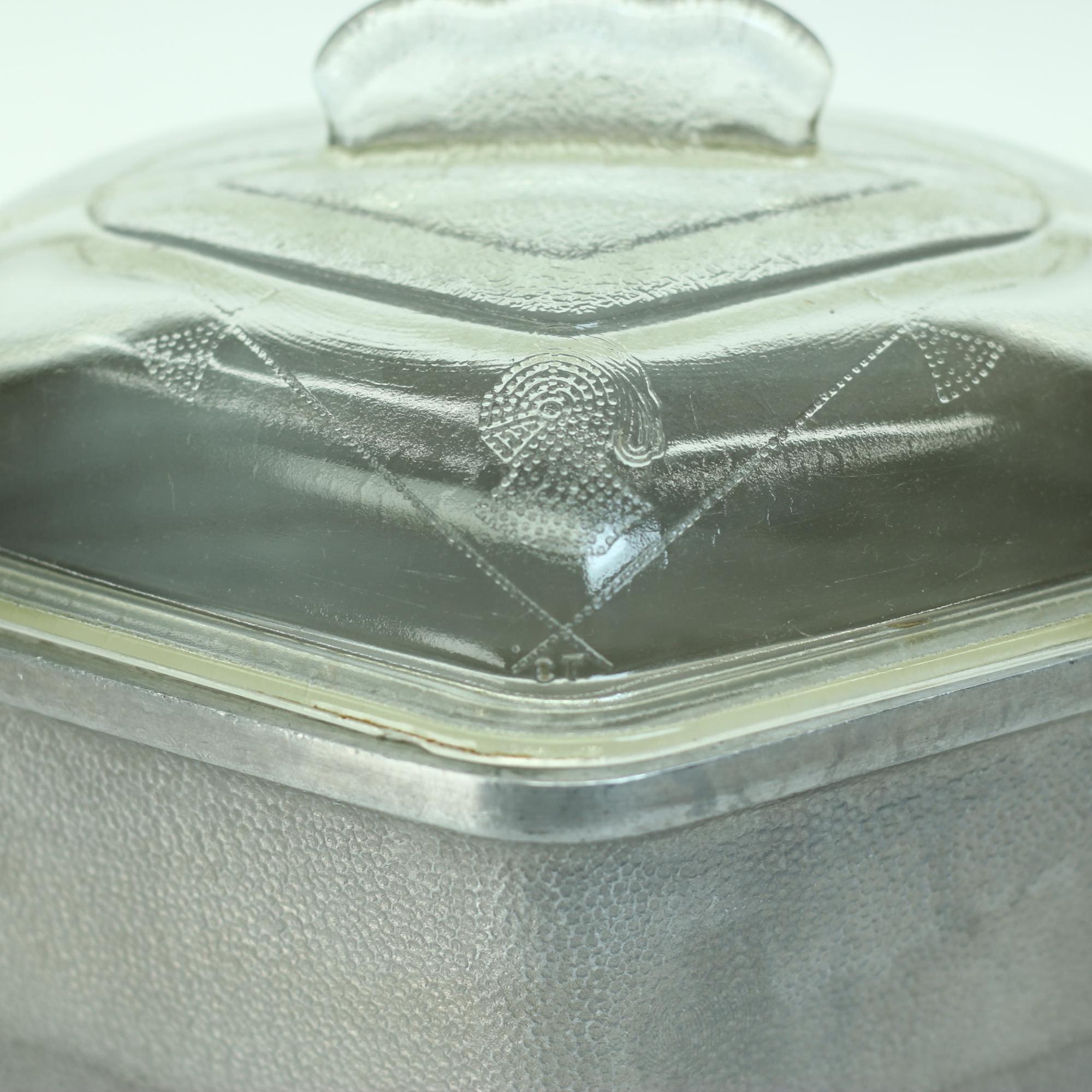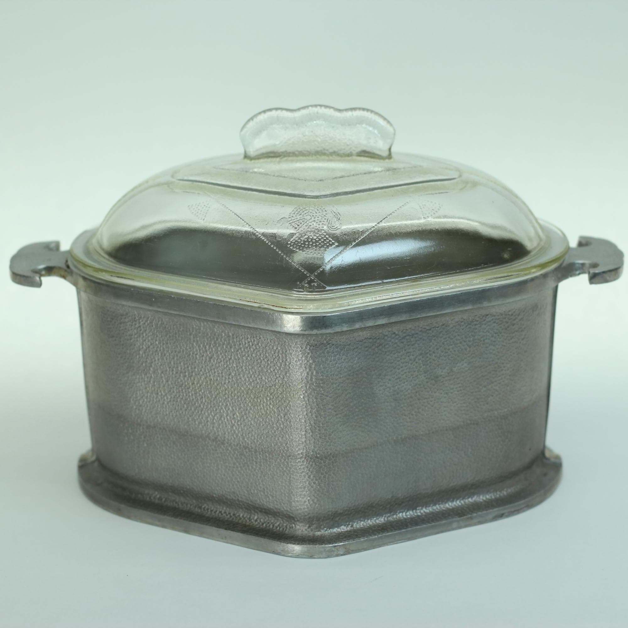 The clear Pyrex lid allowed cooks to monitor food without lifting the lid — an important feature when cooking over wood, coal, or early gas heat.