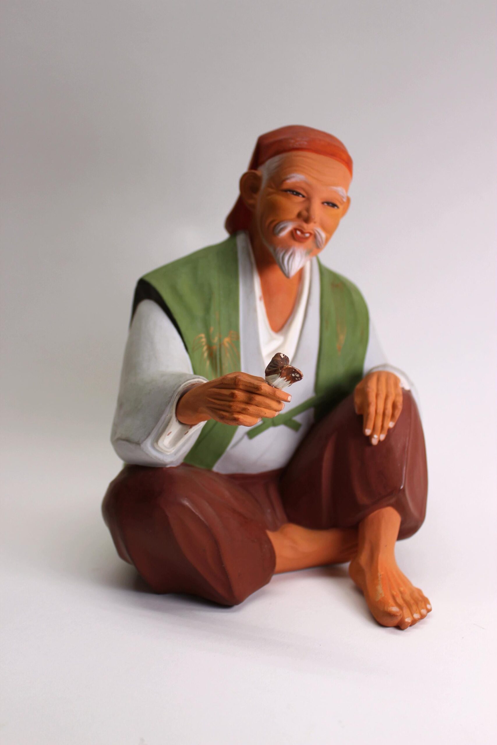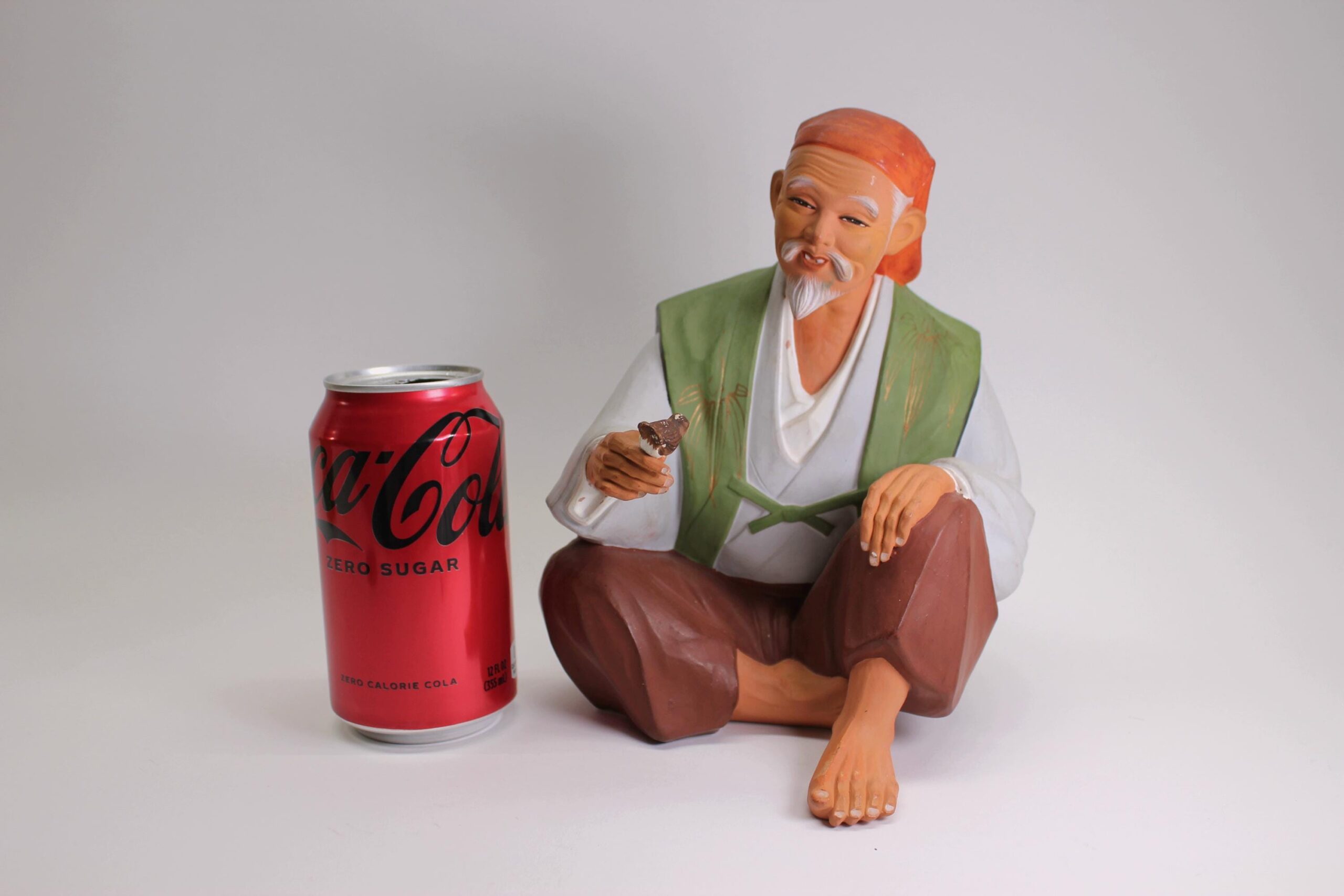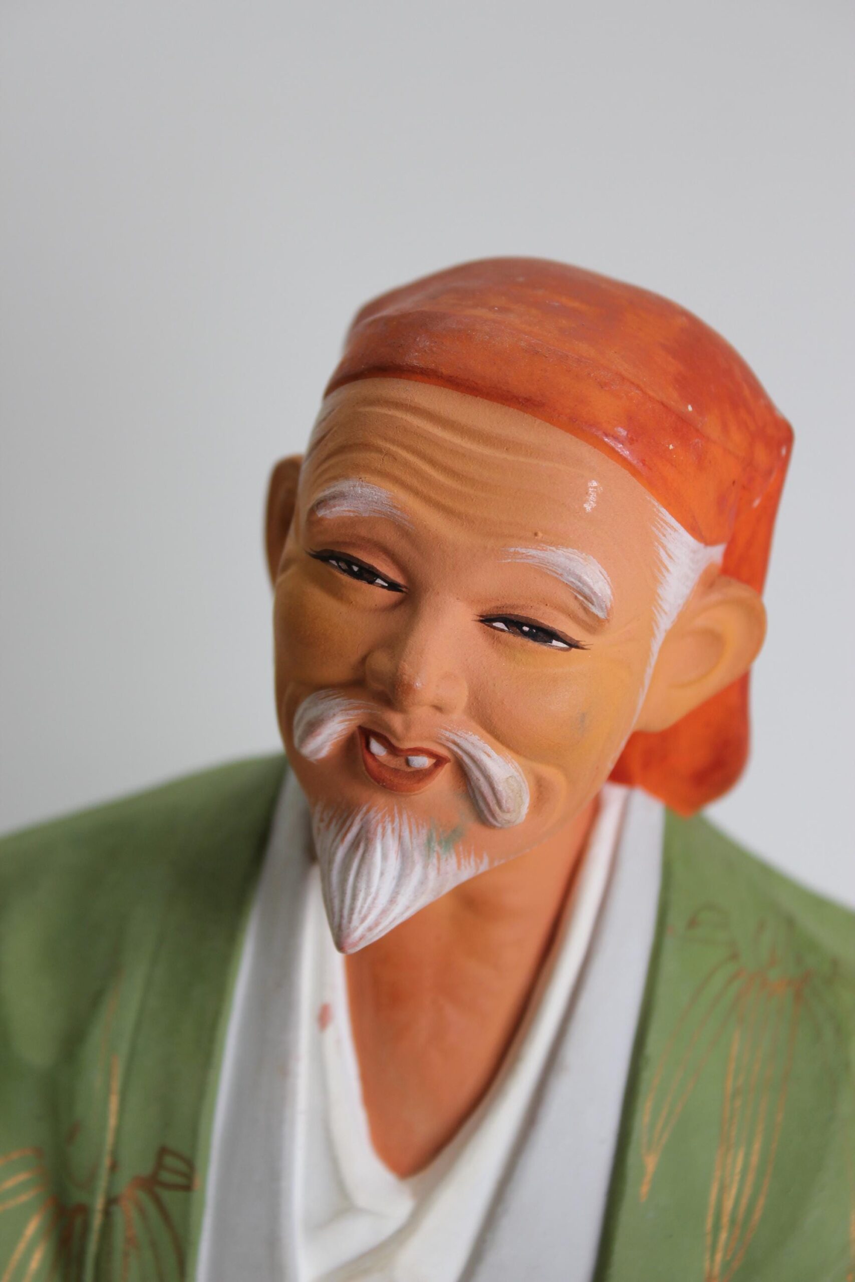 Hakata Urasaki “dolls” are actually exquisitely detailed ceramic sculptures, handcrafted in Japan beginning in the 1950s. This vintage example captures a kind old man seated cross-legged, with a delicate bird perched on his right forefinger.