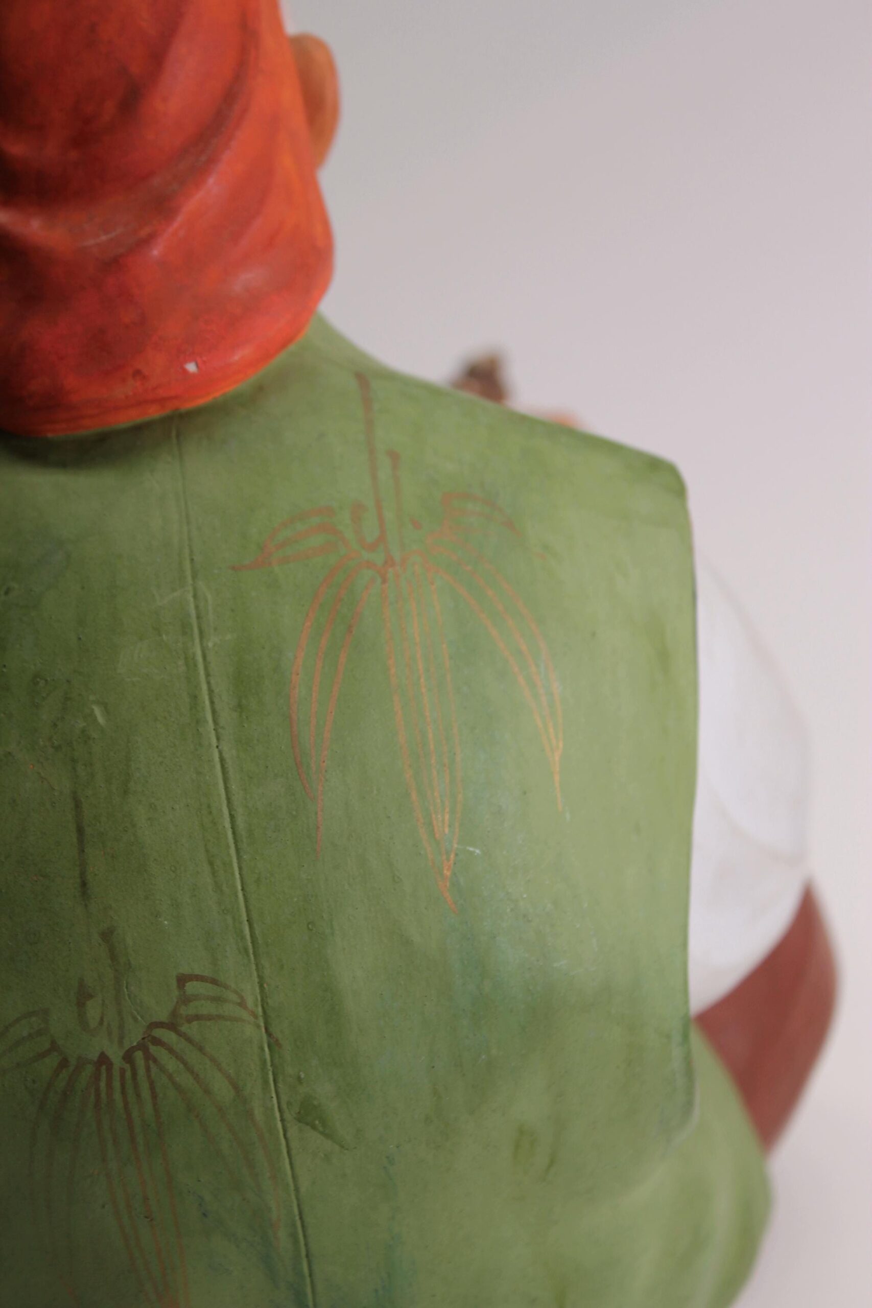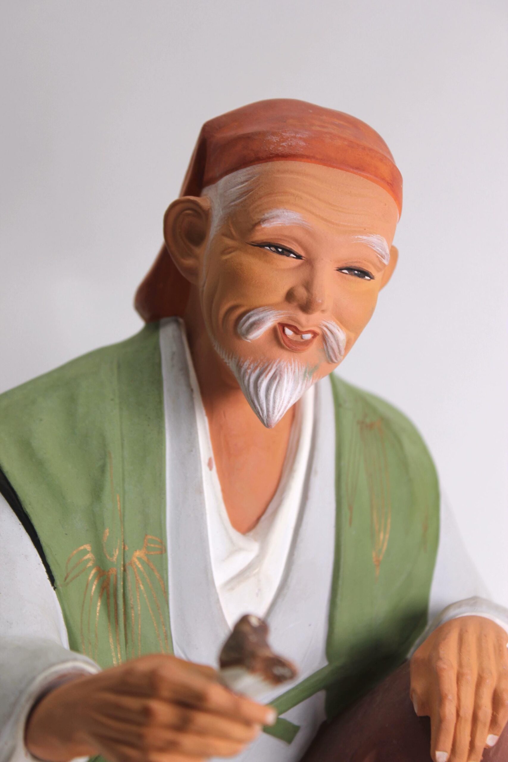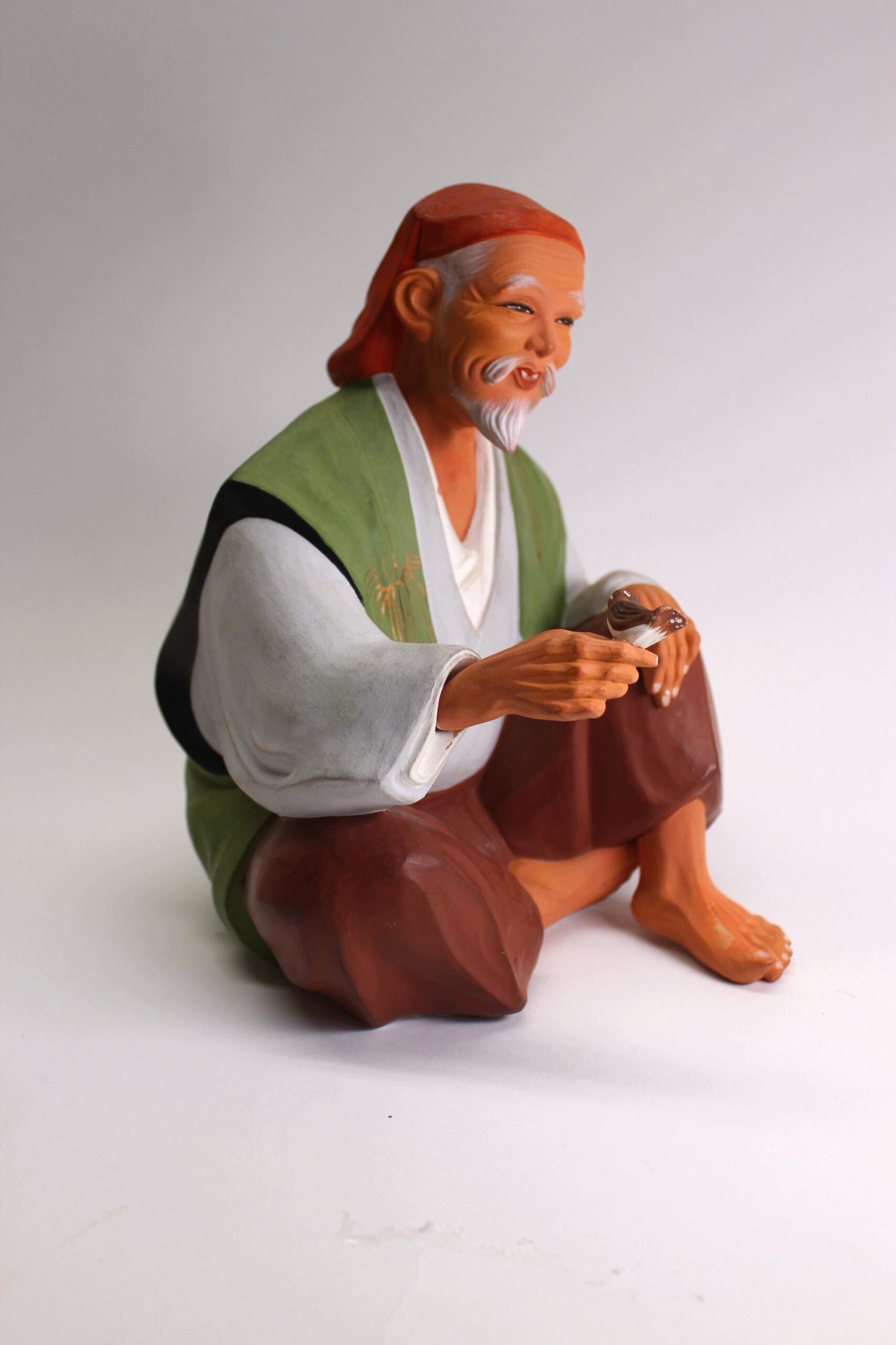 Hakata Urasaki “dolls” are actually exquisitely detailed ceramic sculptures, handcrafted in Japan beginning in the 1950s. This vintage example captures a kind old man seated cross-legged, with a delicate bird perched on his right forefinger.