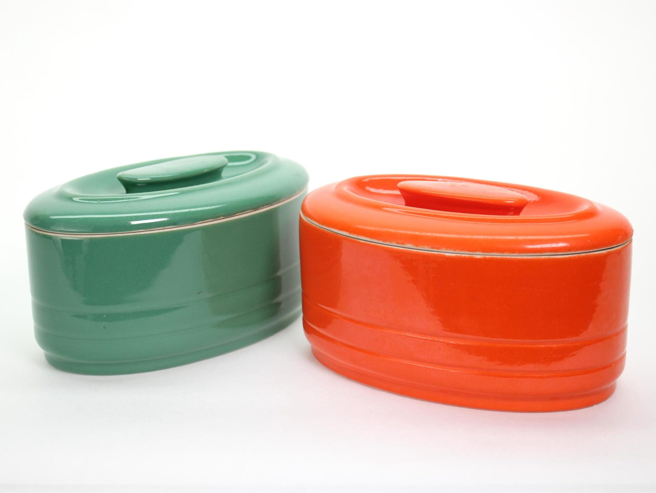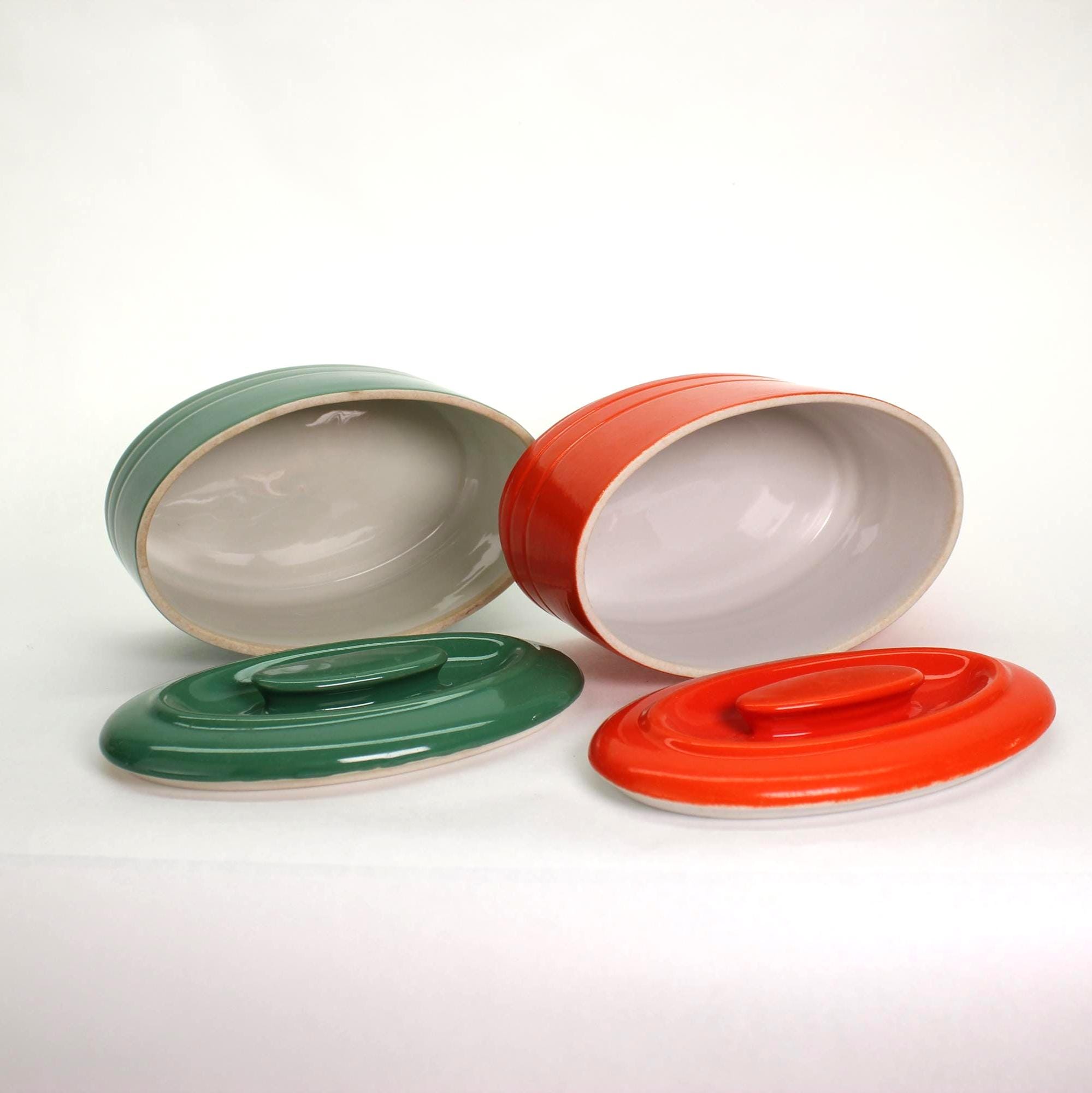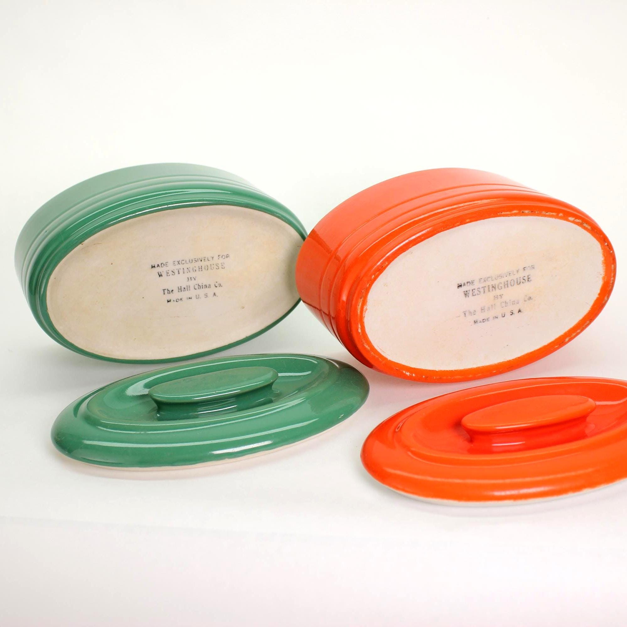 ✨ Originally made in the 1930s or 1940s for Westinghouse by Hall China Co., these vibrant refrigerator dishes look like they time-traveled straight into the 1970s with their bold color palette and streamlined shape. Crafted of vitrified ceramic with a high-gloss glaze and sturdy matching lids, they’re as functional today as they were nearly a century ago.