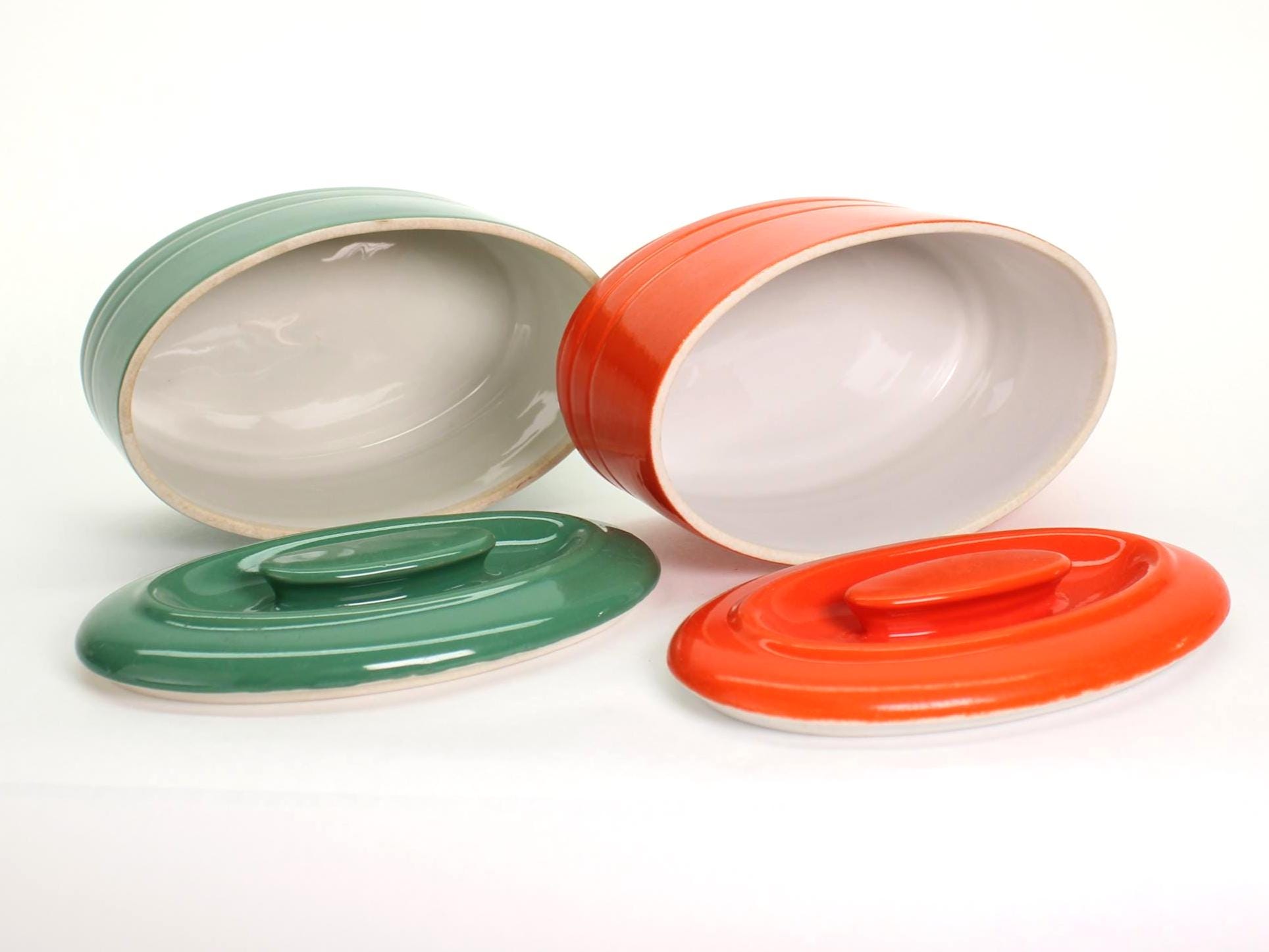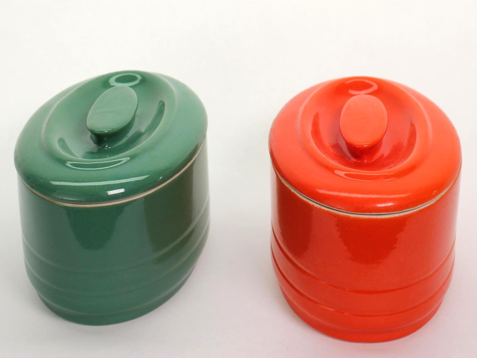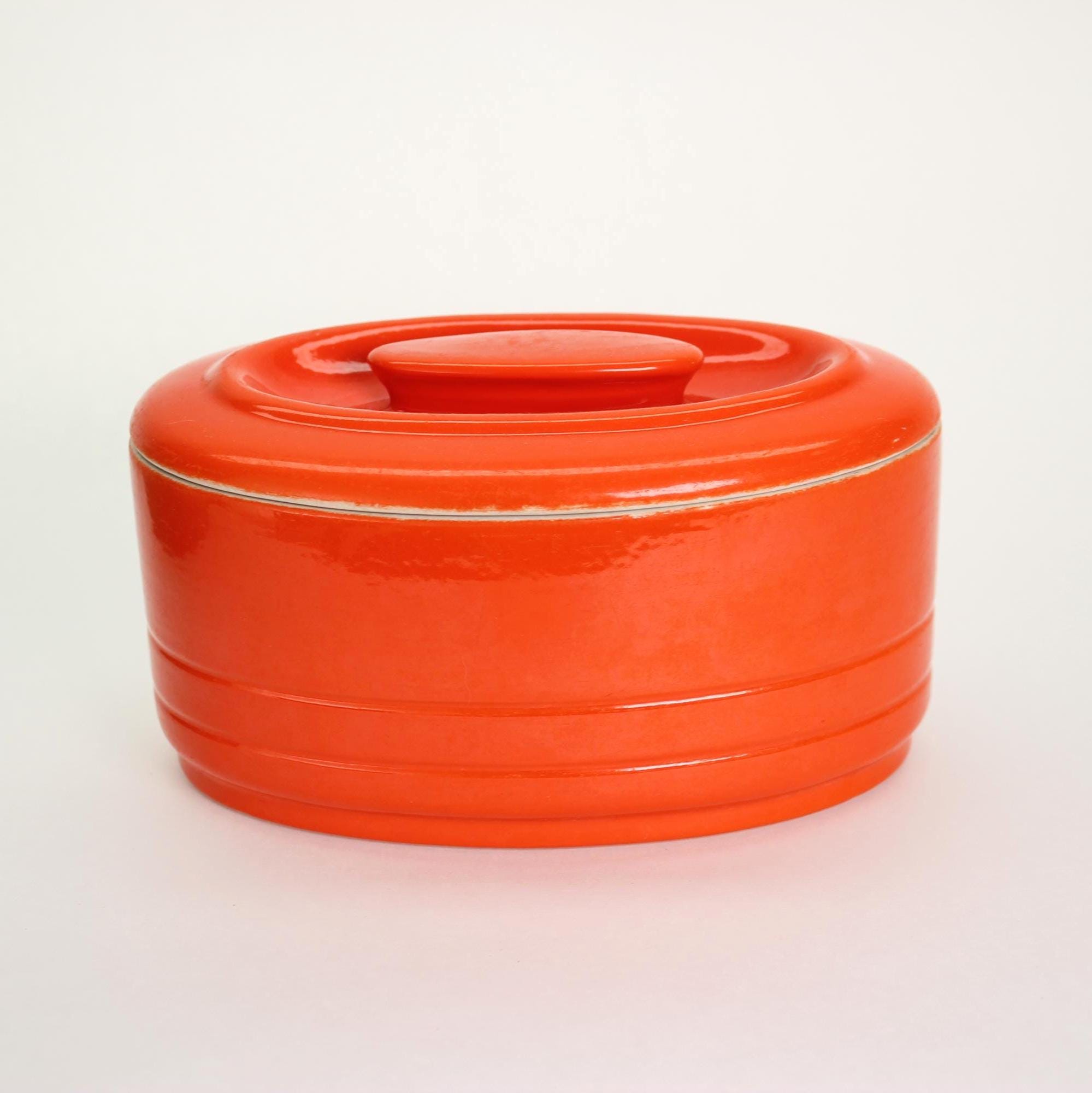 ✨ Originally made in the 1930s or 1940s for Westinghouse by Hall China Co., these vibrant refrigerator dishes look like they time-traveled straight into the 1970s with their bold color palette and streamlined shape. Crafted of vitrified ceramic with a high-gloss glaze and sturdy matching lids, they’re as functional today as they were nearly a century ago.