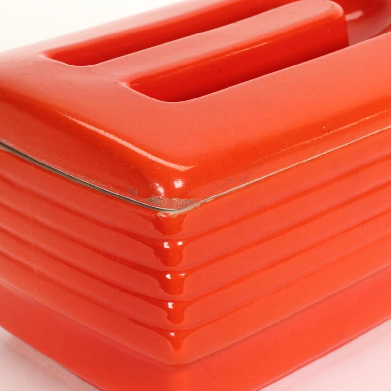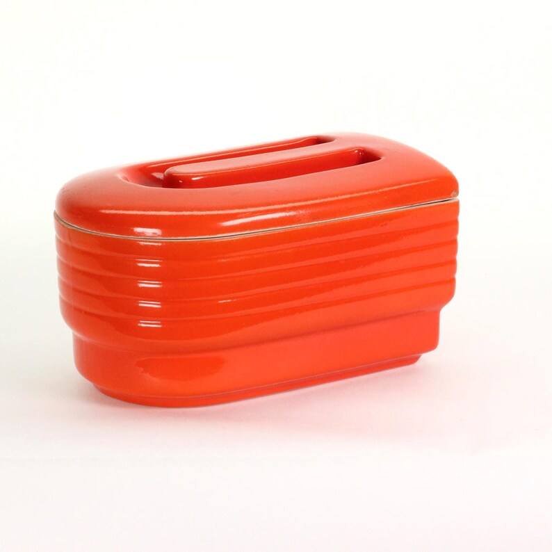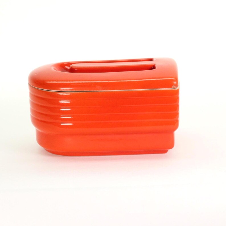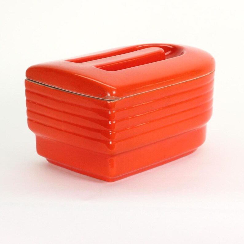 🔥 Bring bold color and Deco curves to your kitchen with this vintage Hall China refrigerator dish, made exclusively for Westinghouse in the late 1930s to early 1940s. Originally designed to fit inside Westinghouse’s streamlined fridges, this red-glazed ceramic box is both functional and iconic.