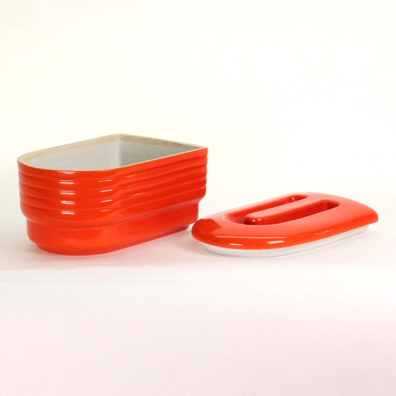This model is the left-hand side dish (note the tapered end), made in high-quality vitrified china with a glossy red glaze, white interior, and matching lid. These pieces were part of an effort to modernize kitchens with color and style — and they’re now prized for their sculptural form and historical value.