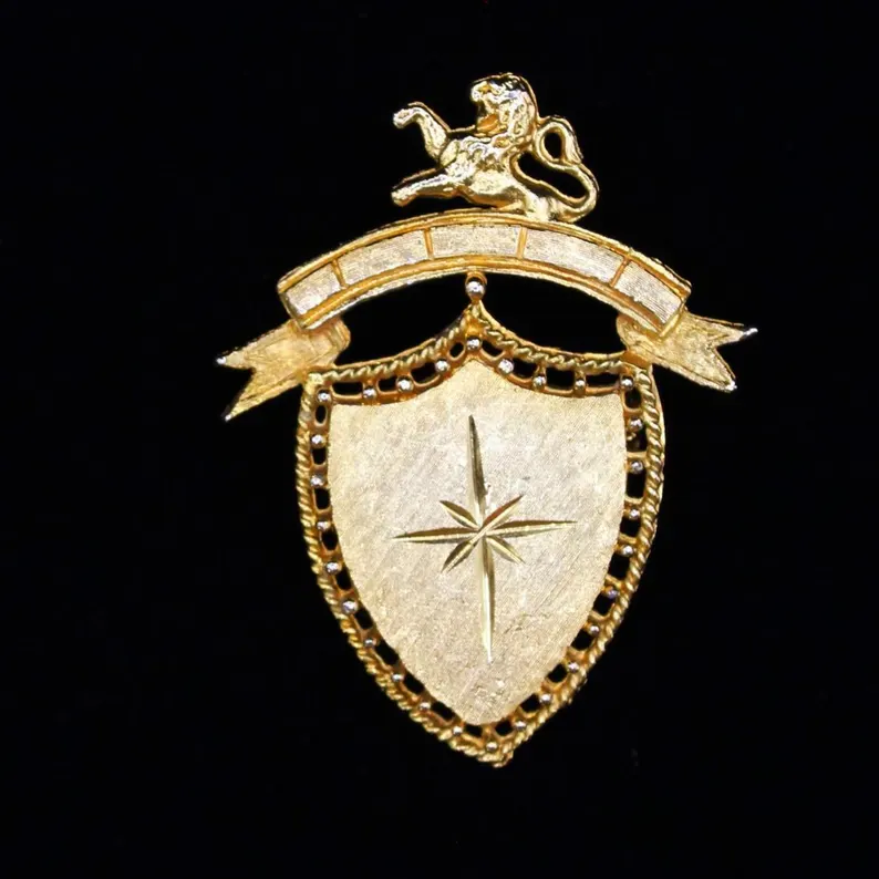 ✨ Brooch One: Shaped like a bishop’s miter or heraldic shield, this bold piece features a central starburst design, faceted edge detail, and a draped scroll across the base. A rhinestone lion dangles below—possibly indicating a school mascot or fraternal symbol.