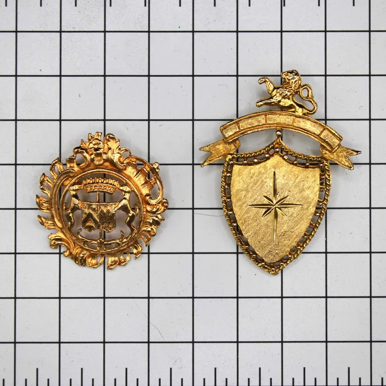 📜 Channel vintage academia or secret society style with this unique duo of vintage gold-tone brooches, each one brimming with symbolic detail and mid-century gravitas.